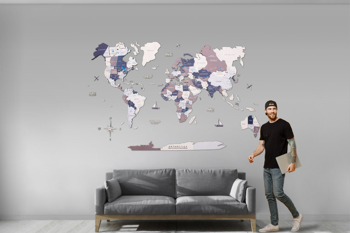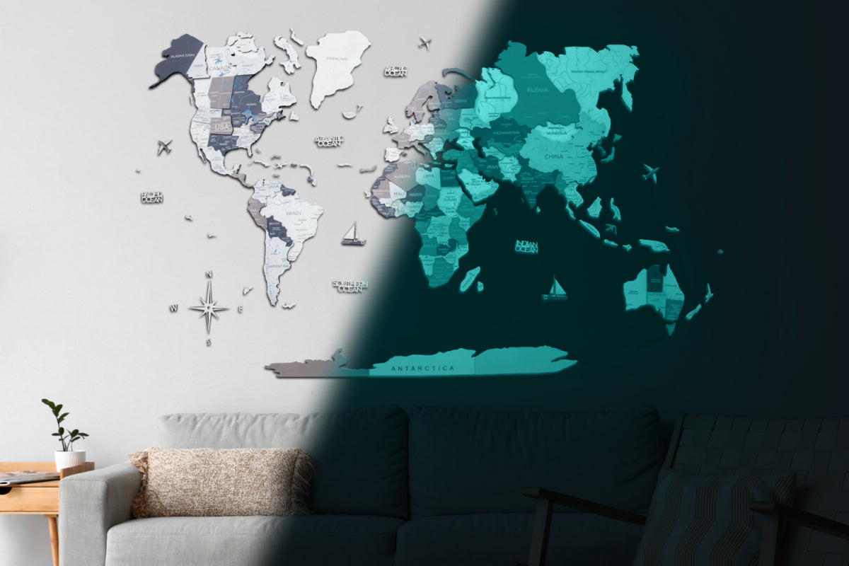 Die Farbpalette ist eine unglaubliche Mischung aus Ozean blau, Graphit, Blau und anderen Schattierungen, die alle Arten von Weltwundern darstellen. Wir empfehlen nicht, das 3D-Leuchtdekor als Teil des Bildungs prozesses zu verwenden, da einige kleine Inseln und Landkreise fehlen. Die Karte wird jedoch definitiv die Kleinen anziehen und, wer weiß, sie vielleicht neugieriger auf die Geographie machen.