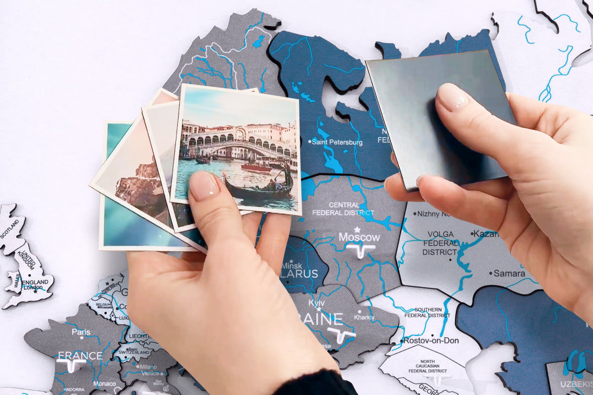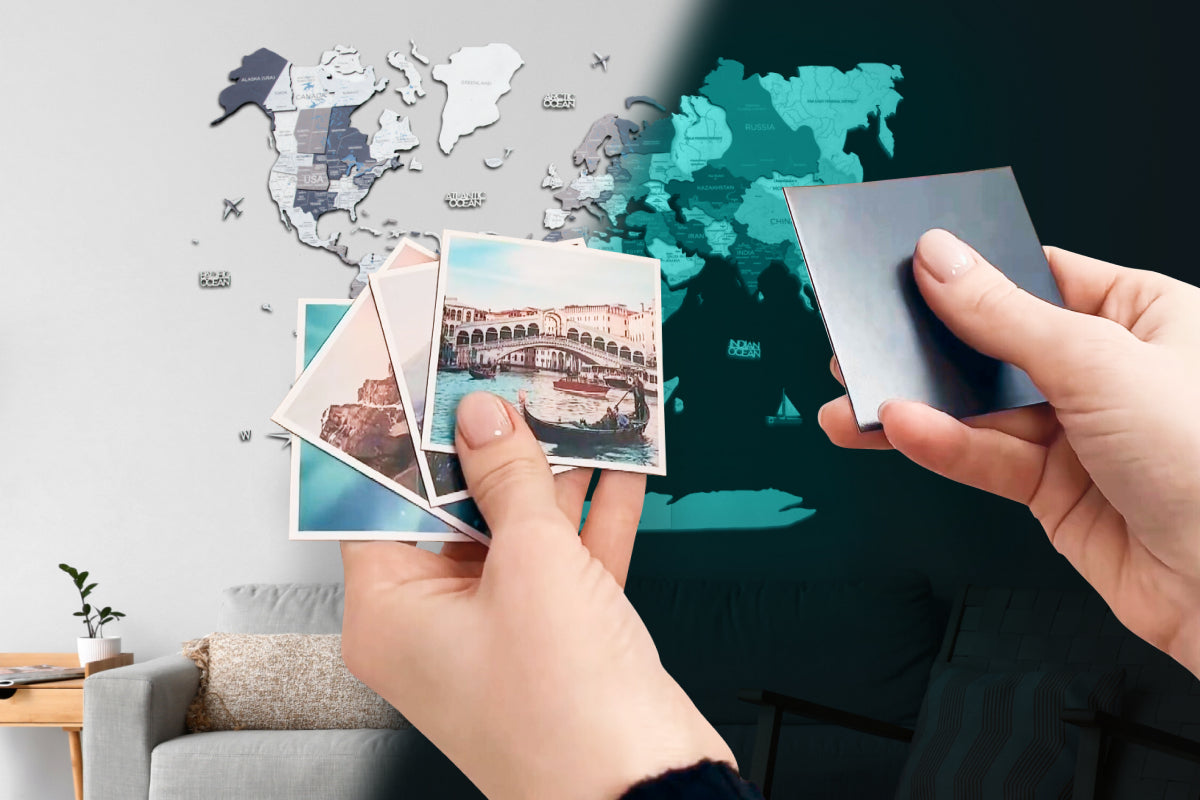 Gehen Sie für die magnetische Option! Bestellen Sie eine Karte mit einer magnetischen Oberfläche, um alle Magnete und Fotos von Ihren vorherigen Reisen zu zeigen. Alternativ können Sie Ihre Karte mit allen Ländern anpassen, von denen Sie träumen, dass Sie sie sehen-verwenden Sie die niedlichen Flaggen nadeln.