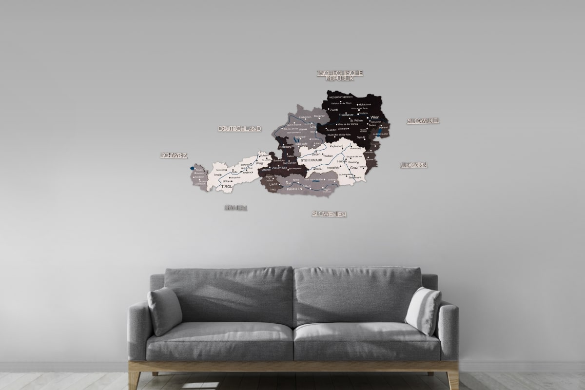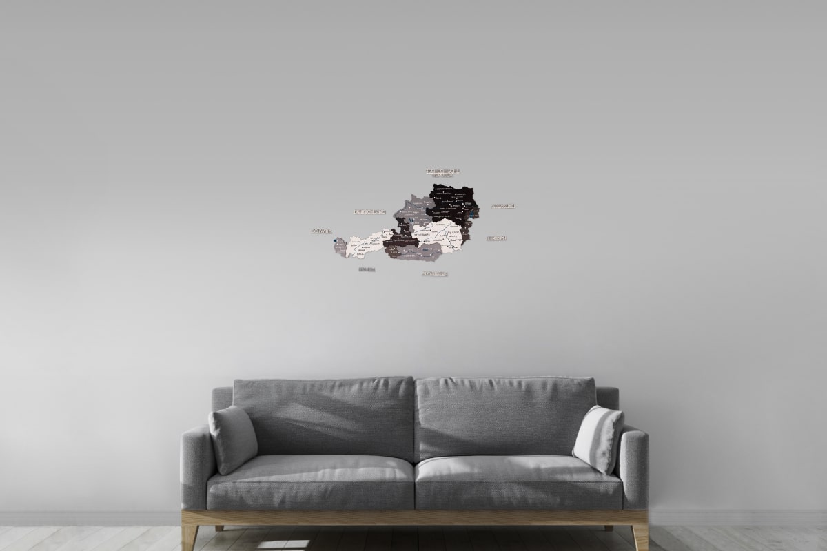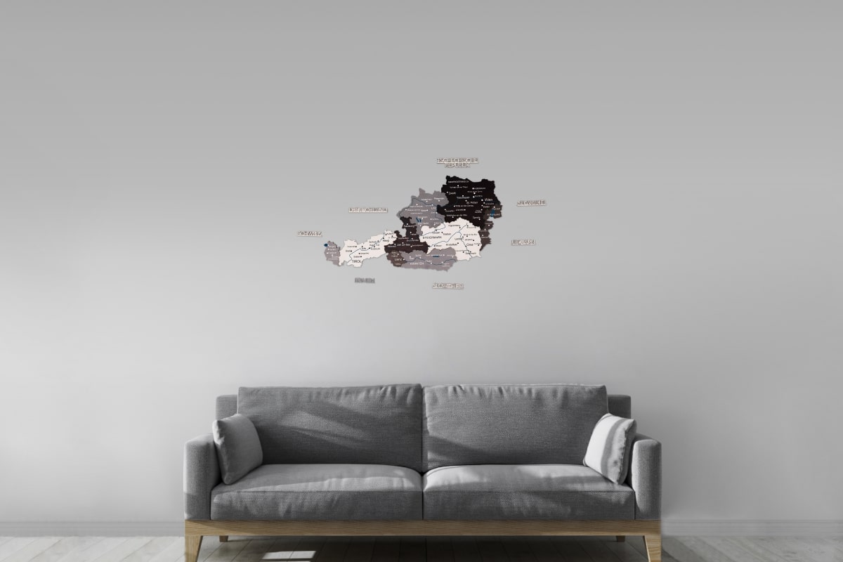 Made from natural birch plywood with a thickness of 6–18 mm, each map is precisely laser-cut and carefully assembled by hand. The calm, balanced Nordik tones highlight Austria’s geography while adding depth, texture, and a contemporary aesthetic to living rooms, offices, and creative spaces.