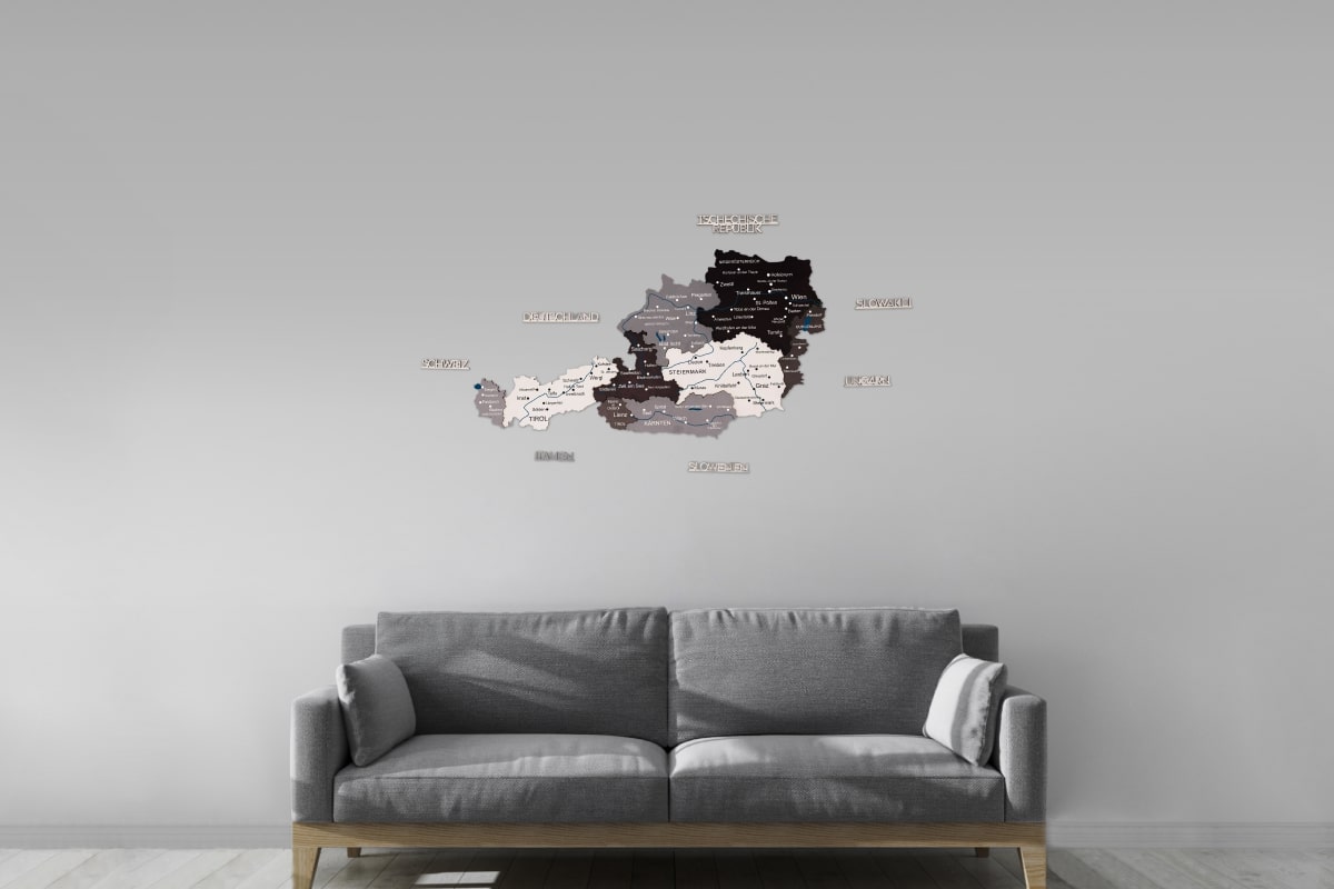 Enhance your living space with the refined and modern 3D Wooden Map of Austria – Nordik by Enjoy The Wood . This premium handcrafted wooden wall map features a sophisticated Nordik color palette that brings a sense of modern minimalism to your interior. Designed as both décor and an educational piece, it allows you to explore Austria’s regions through a striking layered 3D design.