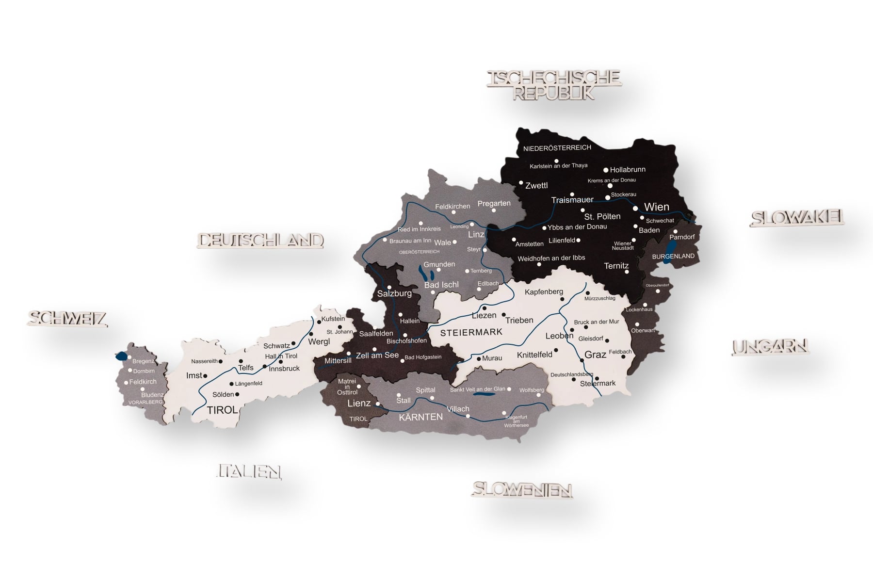 - Leer: Es zeigt die klare Silhouette Österreichs mit inneren Rändern, aber ohne Text – perfekt für alle, die einen abstrakten Look bevorzugen.
