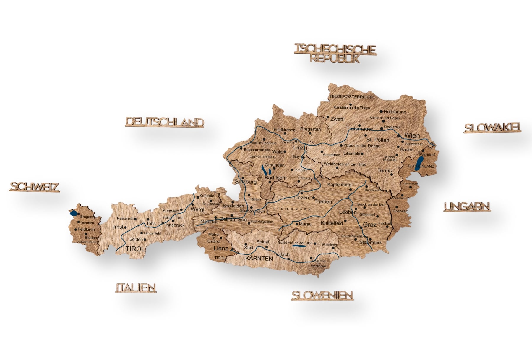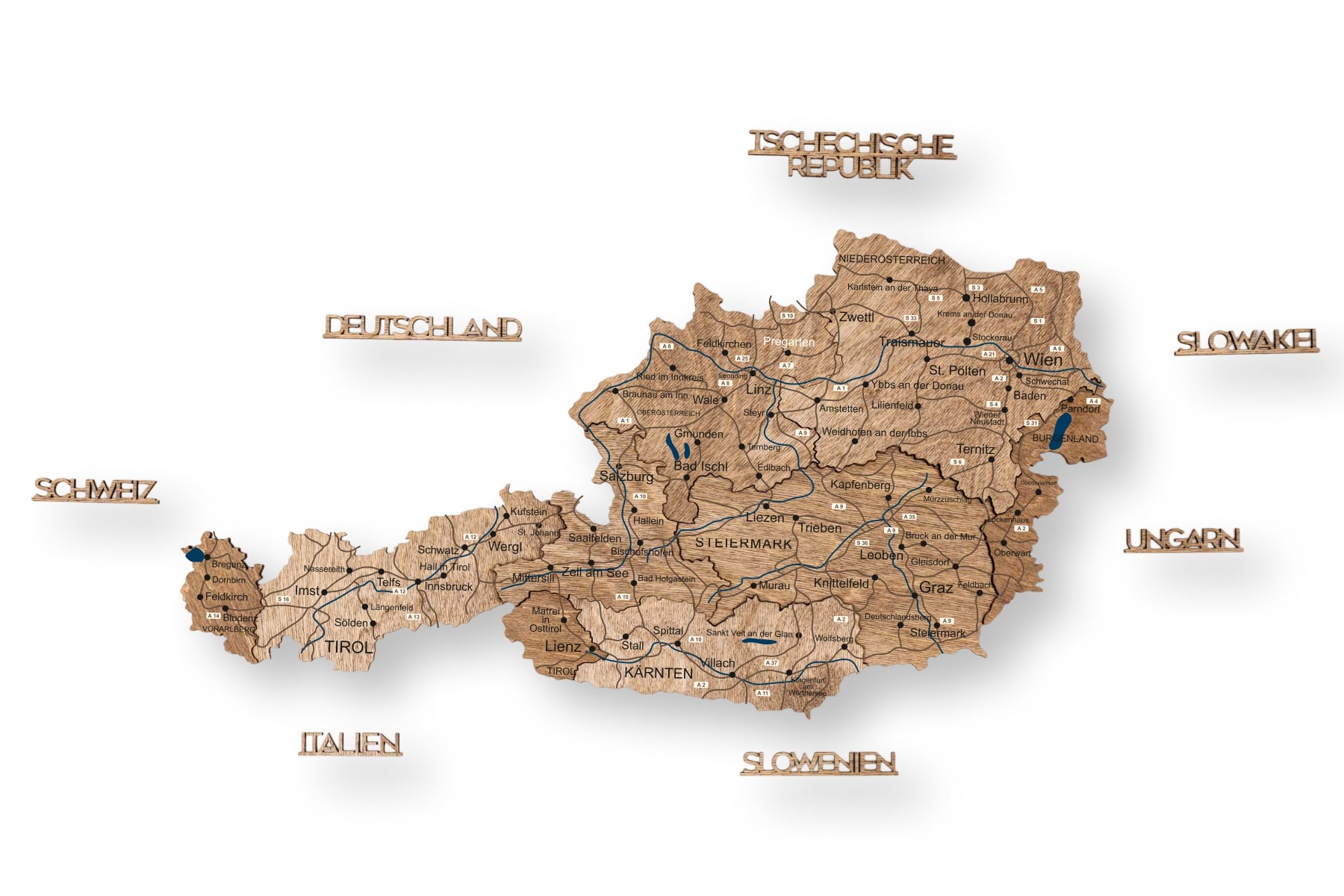 Made from natural birch plywood with a thickness of 6–18 mm, each map is precisely laser-cut and assembled by hand. The multi-layered 3D construction adds depth and texture, beautifully reflecting the mountainous landscapes of Austria while bringing warmth and character to living rooms, offices, and creative interiors.