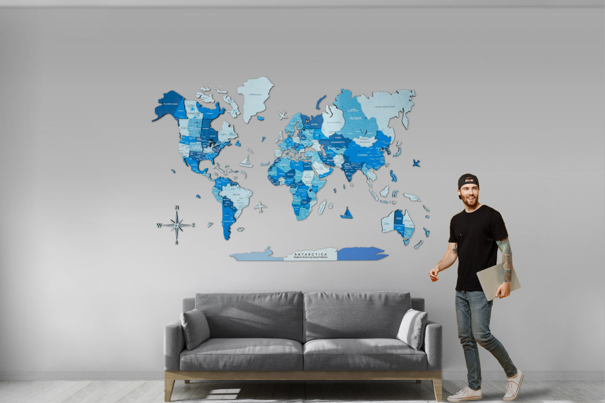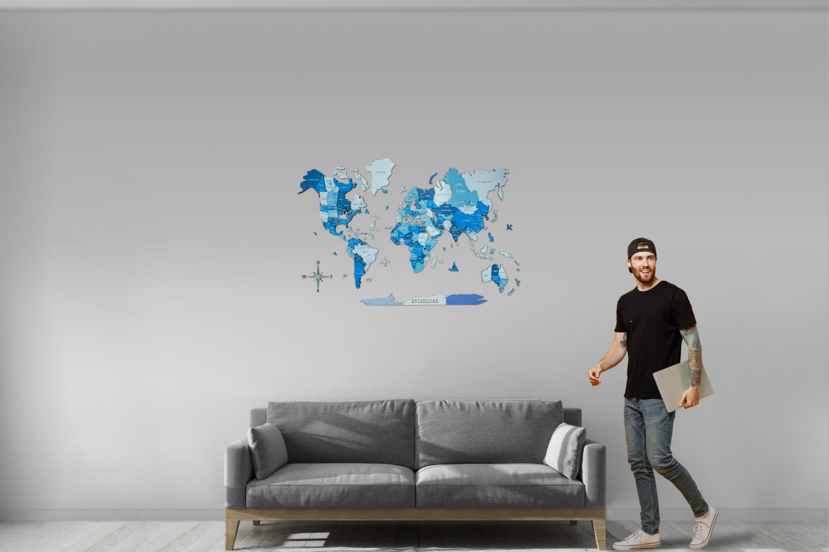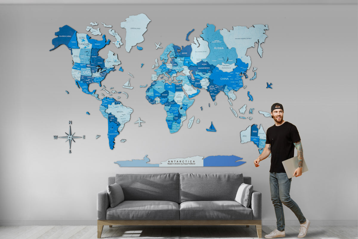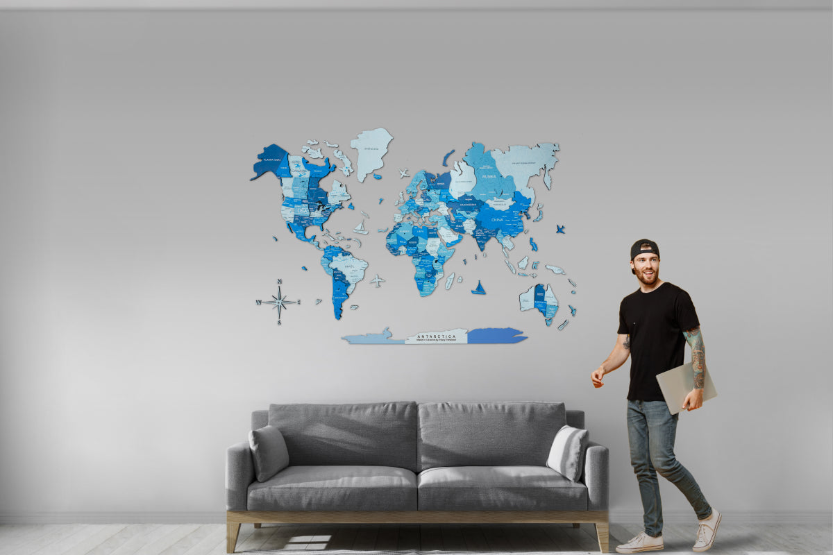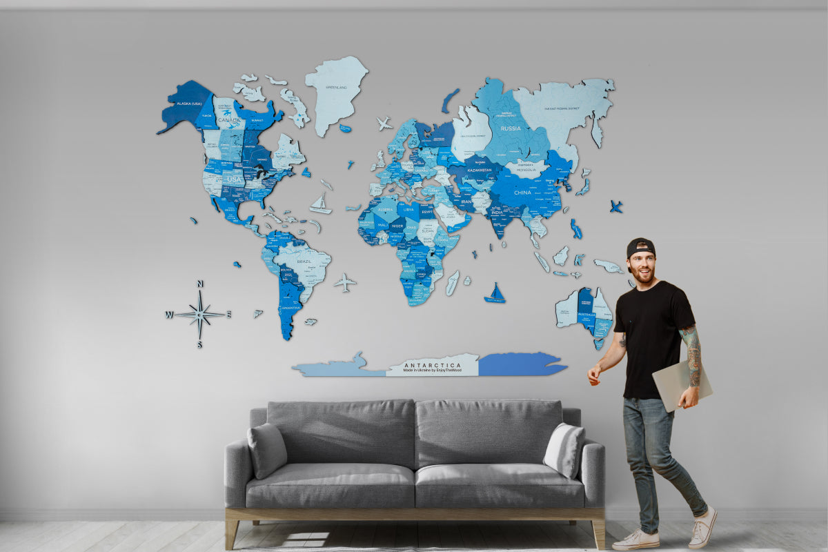 As the first creators of Wooden World Maps, Enjoy The Wood offers you original products backed by a strong patent portfolio, reaffirming our commitment to innovation and protection 🥇. Our colorful art large world map from the Azure collection is handcrafted from top-quality fiberwood with all the countries and continents clearly printed. Feeling stressed? Mount a map to create a small haven of relaxation right in the living room! All materials used in the process of manufacture are earth-friendly, i.e., safe for you and the environment in general.