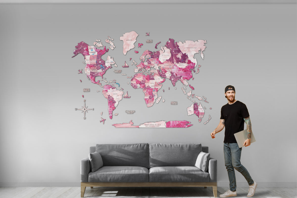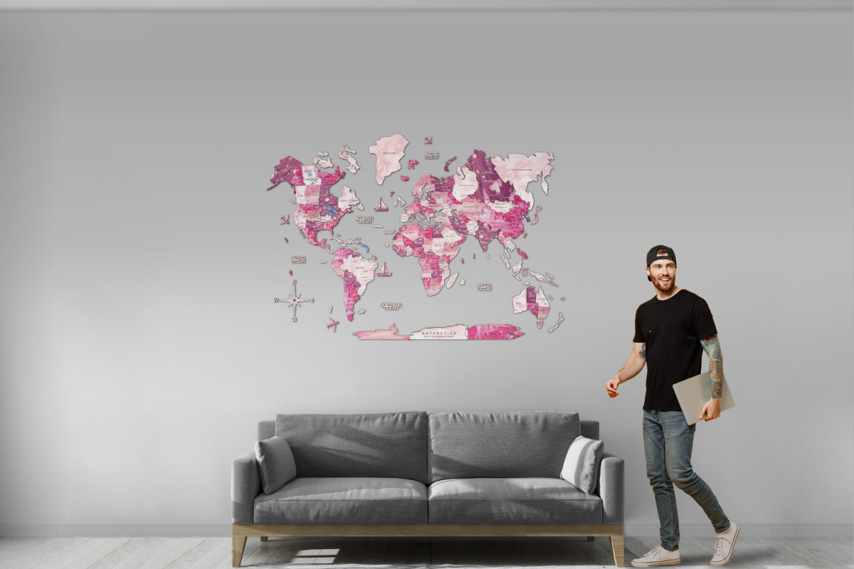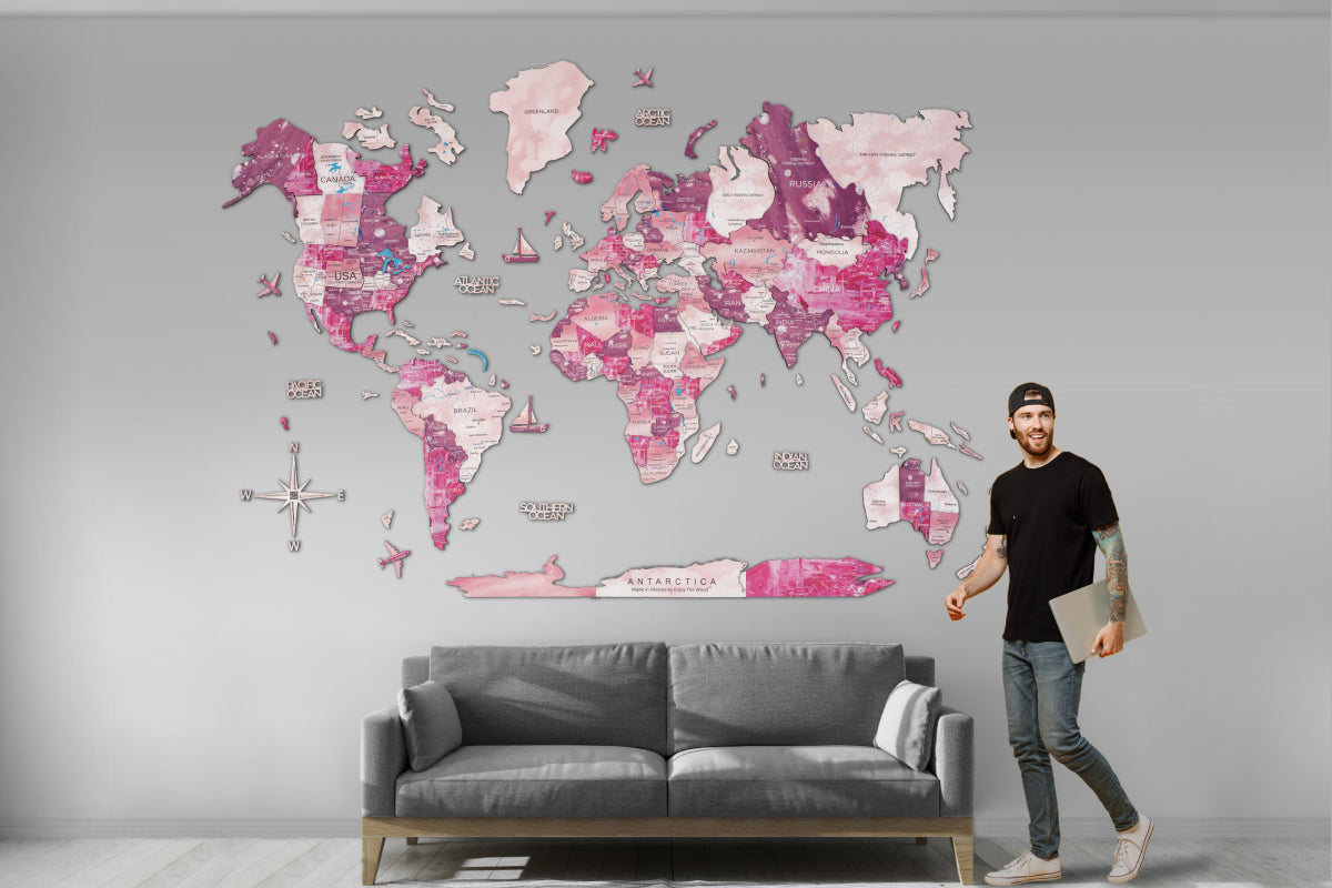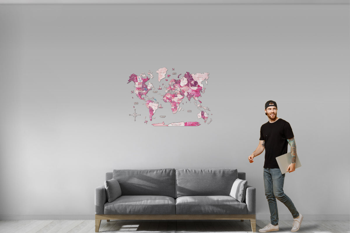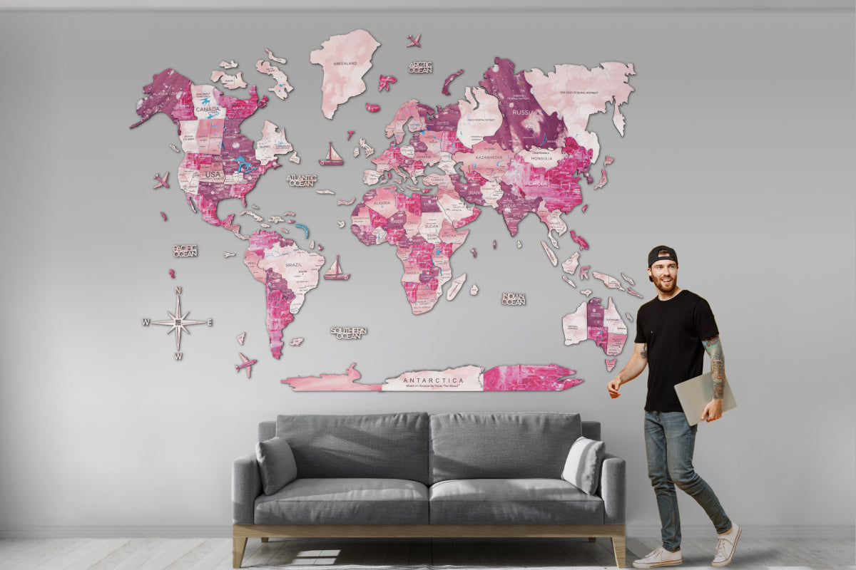 Made from durable fiberwood, colorful wooden wall art exemplifies eco-friendliness with its toxic-free finishes. Handcrafted to withstand the rigors of time, the pink world map seamlessly attaches to nearly any surface, offering a lasting and flexible enhancement for your home or office decor.