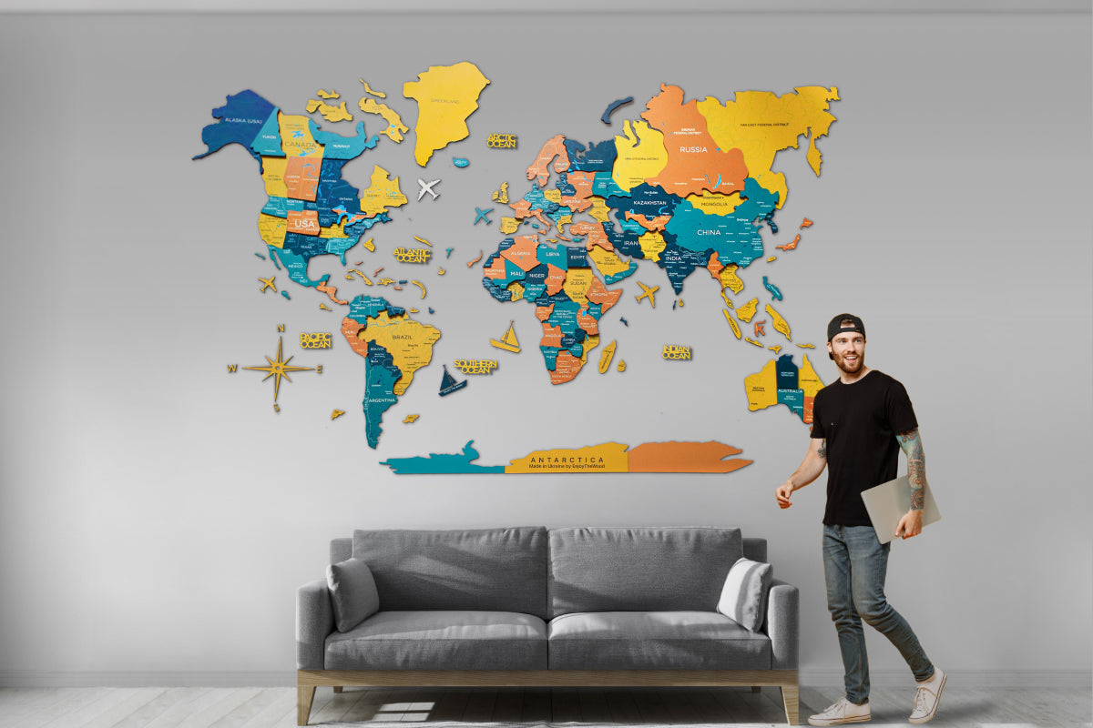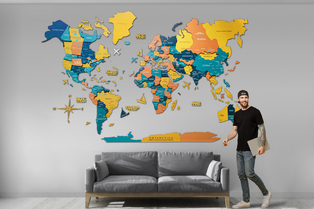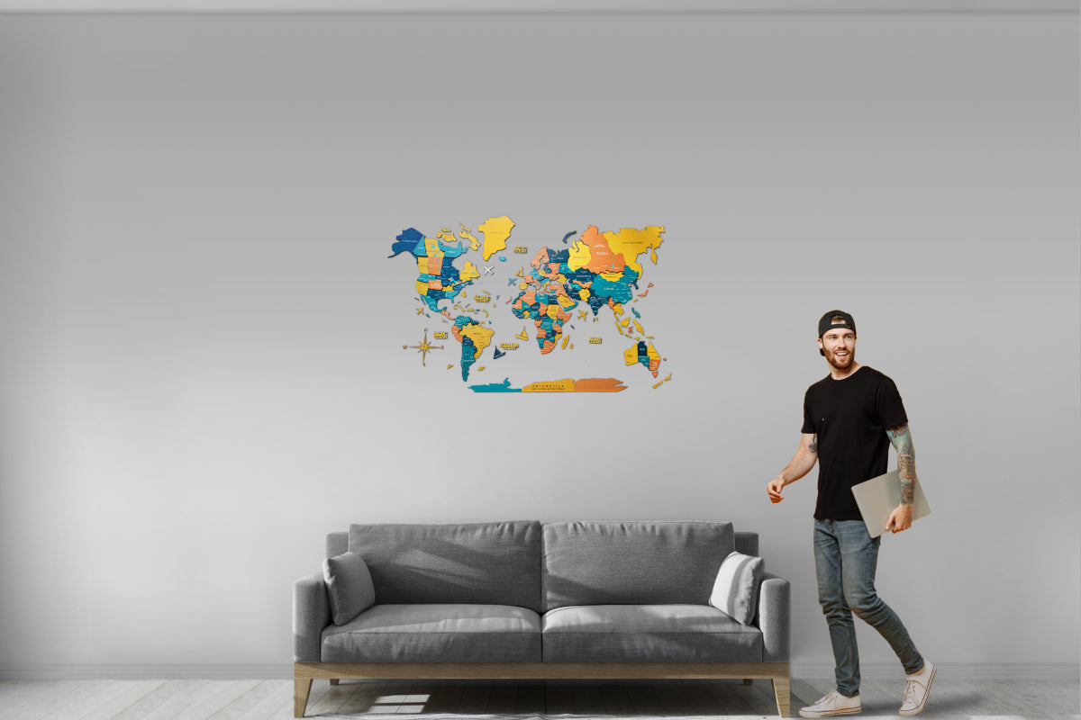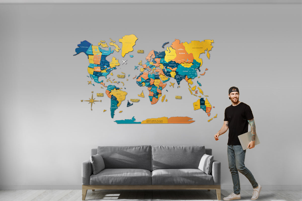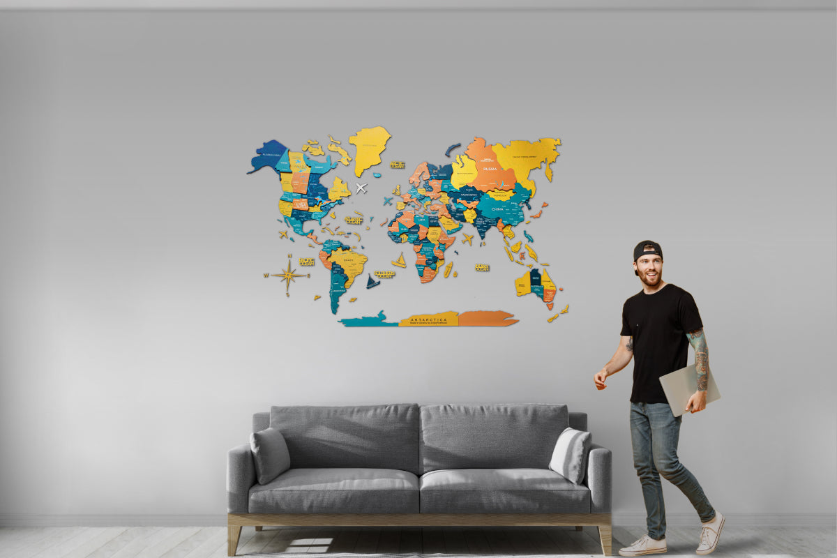 Diese lebendige Weltkarte aus Holz präsentiert detailreich eine Vielzahl von Elementen, von Ländernamen und -grenzen bis hin zu Hauptstädten, geschäftigen Stadtzentren, Flüssen, Seen und majestätischen Bergketten. Es ist wichtig zu betonen, dass einige kleinere Inseln und Länder absichtlich weggelassen wurden, was die Karte für Bildungszwecke ungeeignet macht. Um Ihre farbenfrohe 3D-Wandkunst zu vervollständigen, vergessen Sie nicht, diese einzubeziehen. Nationalparks Buttons in Ihrem Warenkorb. Die Anbringung dieser Karte ist benutzerfreundlich. Innerhalb weniger Stunden können Sie sie sicher an Ihrer Wand befestigen. Das Entfernen ist ebenso unkompliziert und hinterlässt nur minimale Spuren. Genießen Sie den Prozess mit Ihrer Familie und Ihren Freunden!