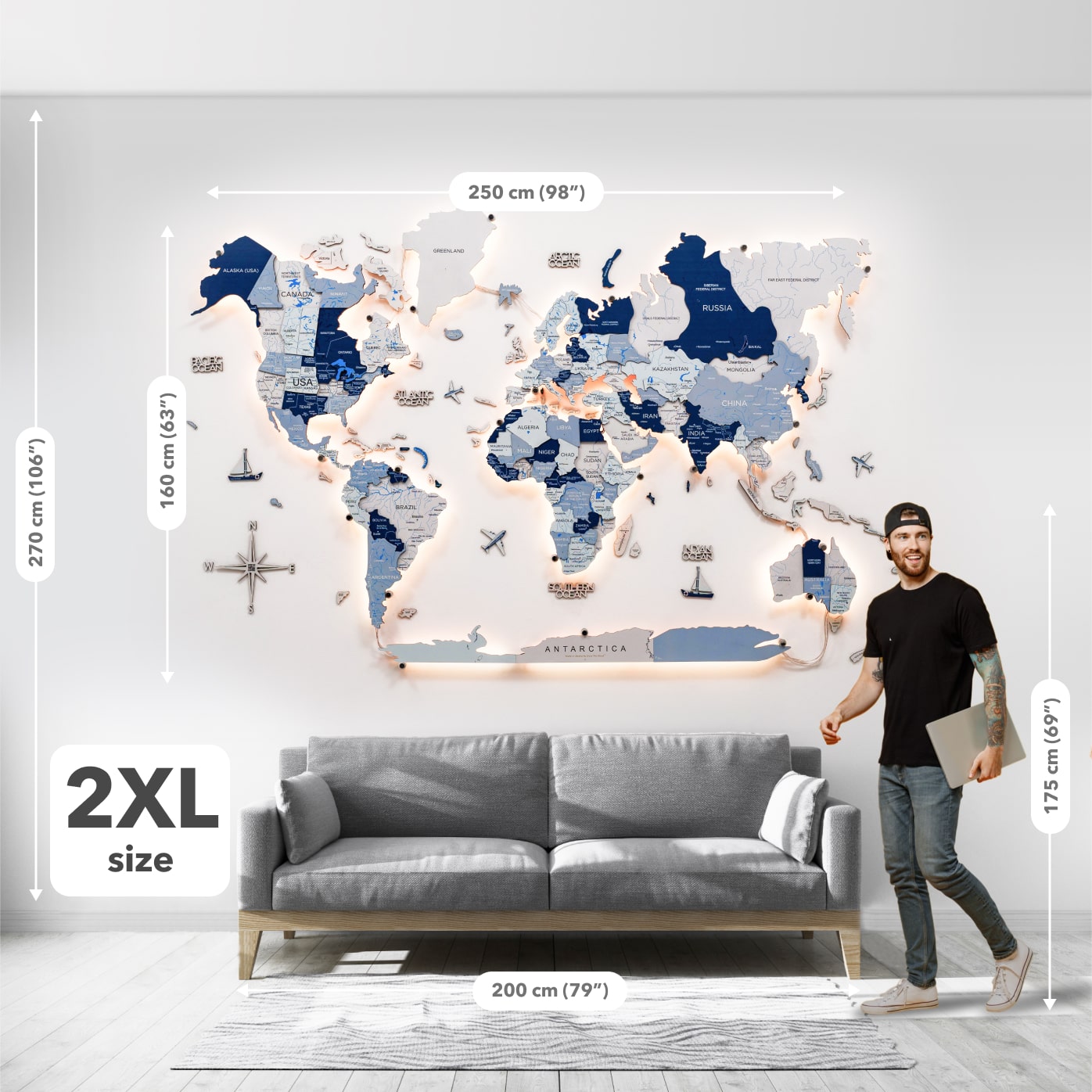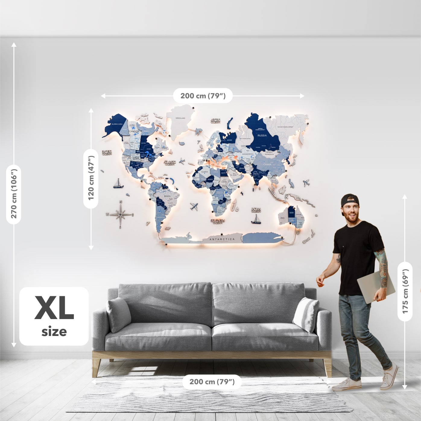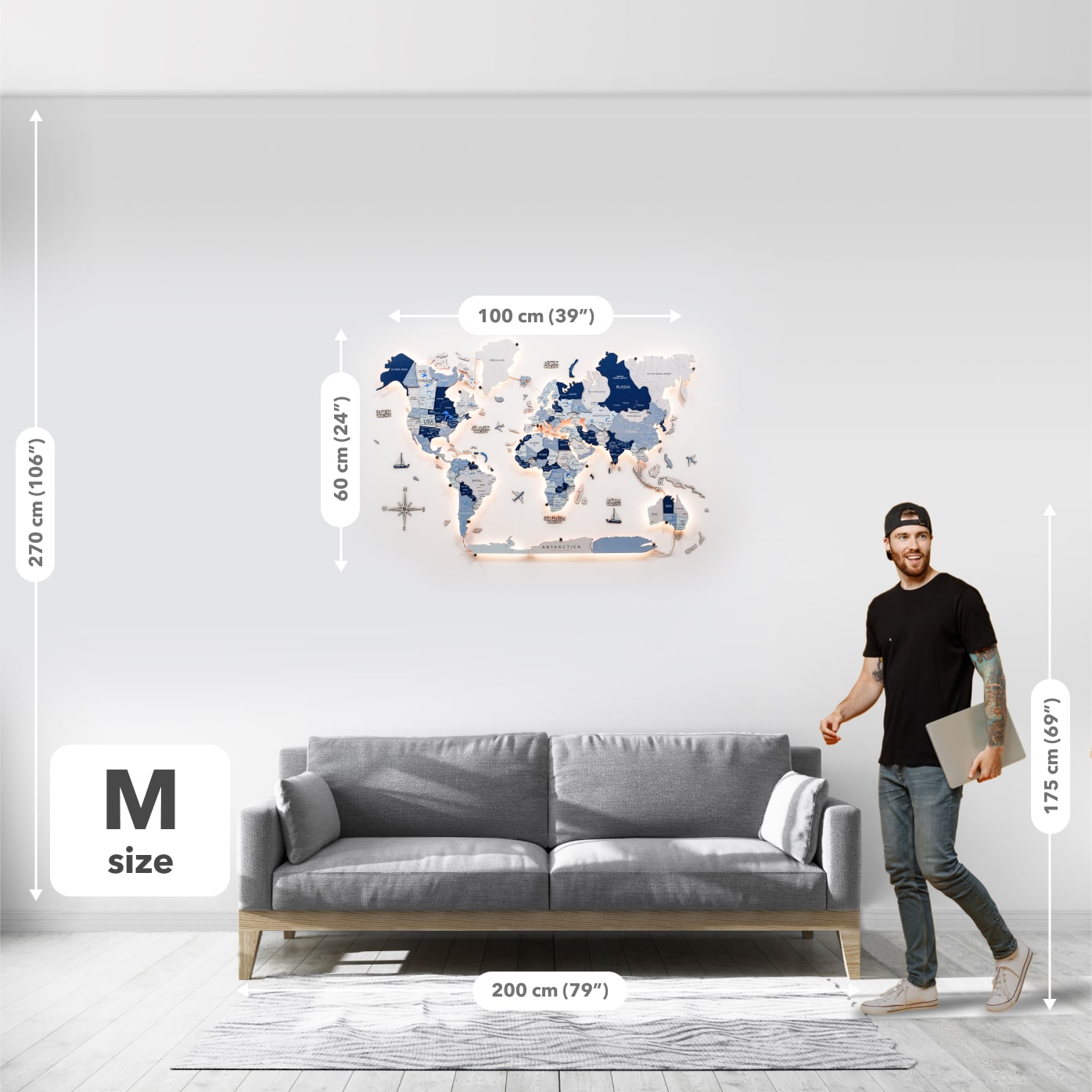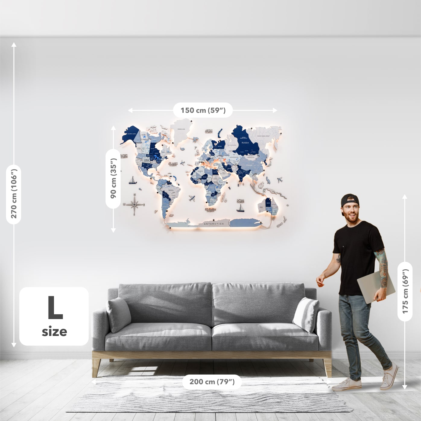 Cada elemento es cortado, pulido y ensamblado con precisión por artesanos expertos, lo que garantiza un acabado premium y duradero. La luz LED integrada añade profundidad y ambiente, ideal para las noches en las que buscas una decoración cálida, moderna e inspiradora. El mapa es fácil de instalar, seguro, de bajo consumo y está disponible en varios tamaños para adaptarse a cualquier pared.