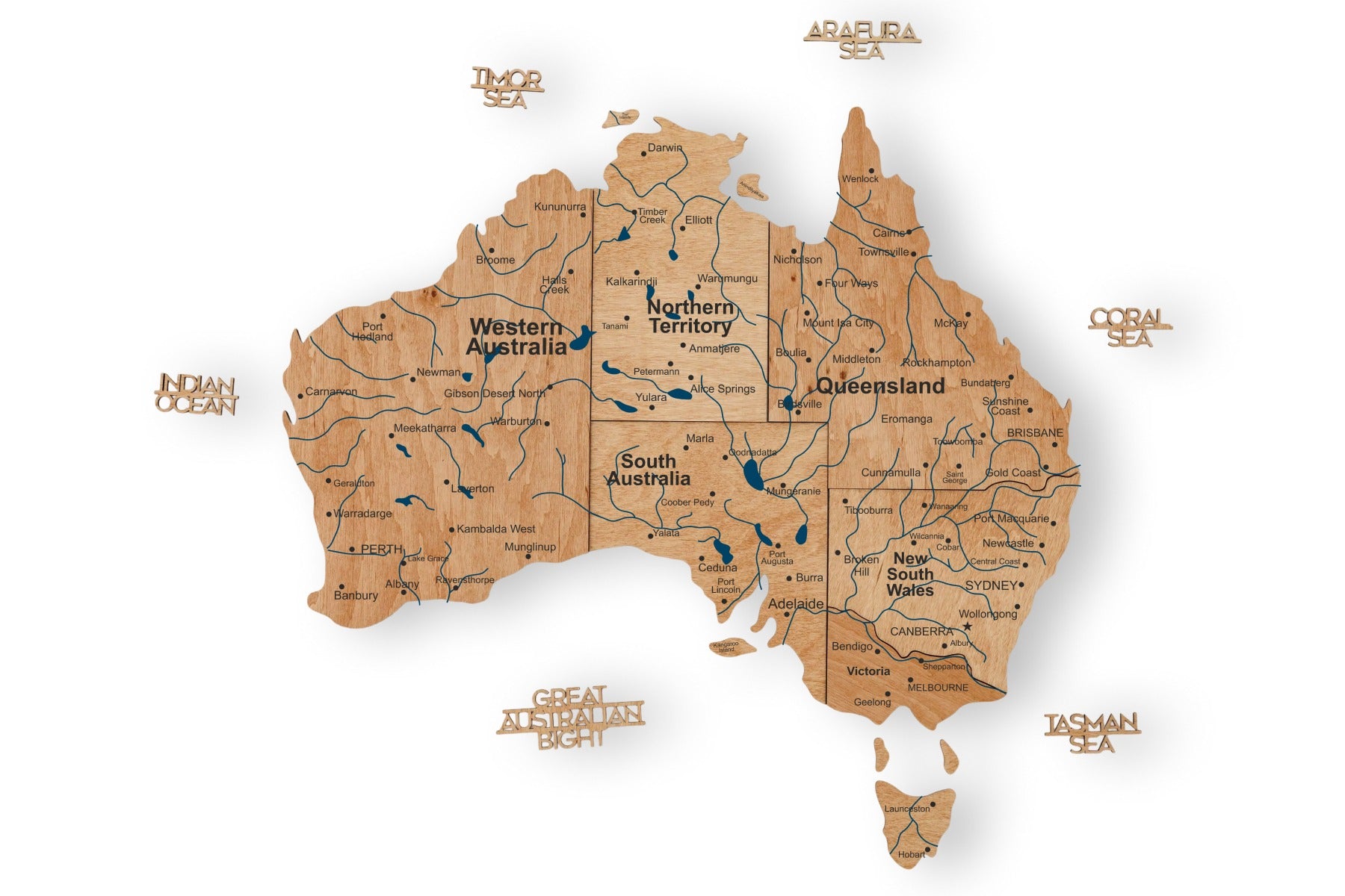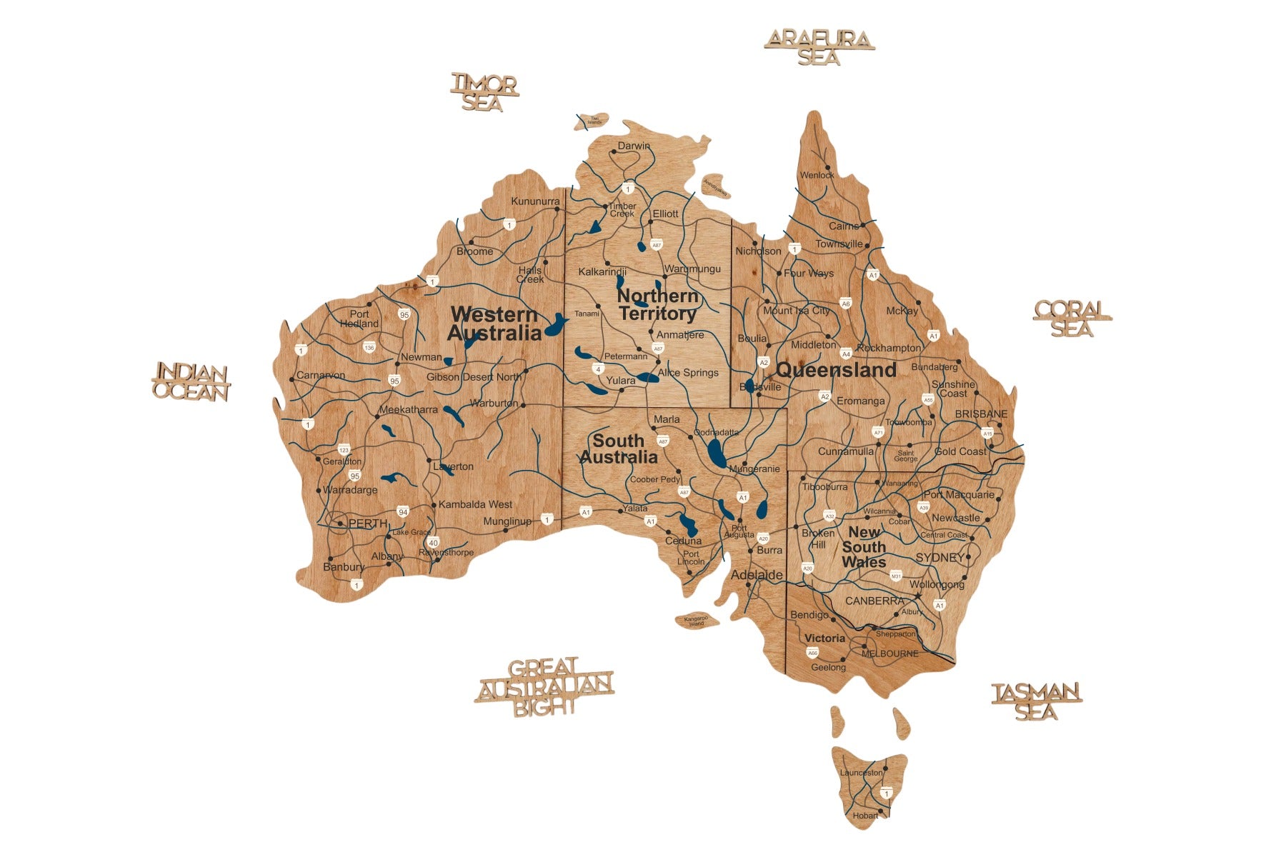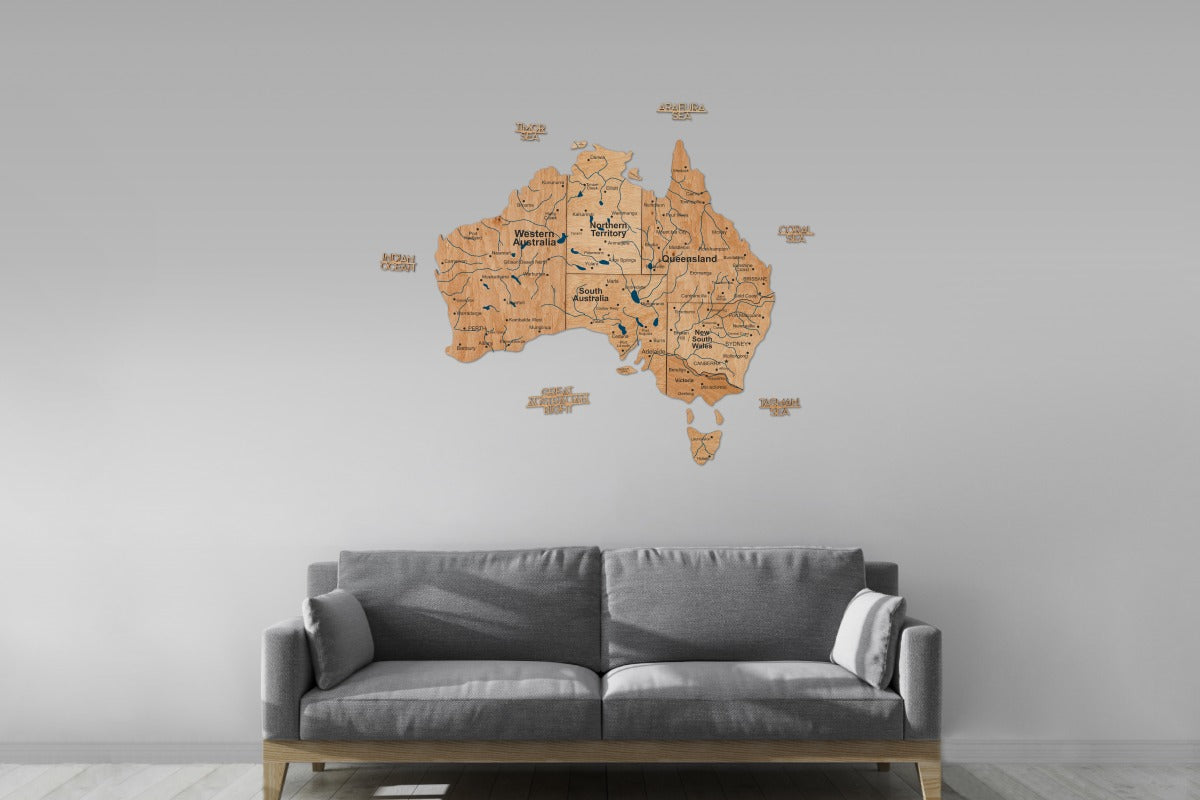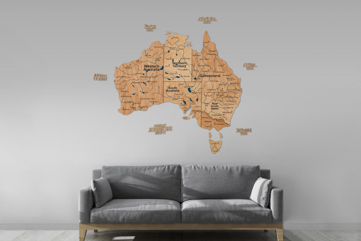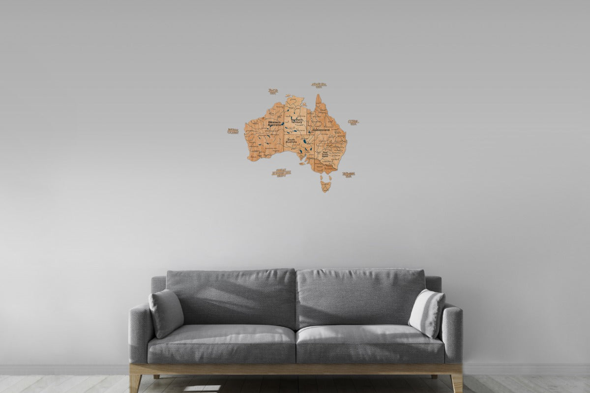 Brighten up your interior with the vibrant and artistic 3D Wooden Map of Australia by Enjoy The Wood. This handcrafted wooden wall map showcases Australia’s diverse landscapes with rich multicolor wood stains, precision laser cutting, and expert craftsmanship. Made from natural birch plywood with a layered 3D structure, it adds depth and texture to any space. Choose from three engraving options—Blank, Prime, or Prime Plus—and enhance your map with optional pin sets for Australia’s landmarks or states. Available in S, M, L, and XL sizes, this map transforms any wall into an inspiring travel story.