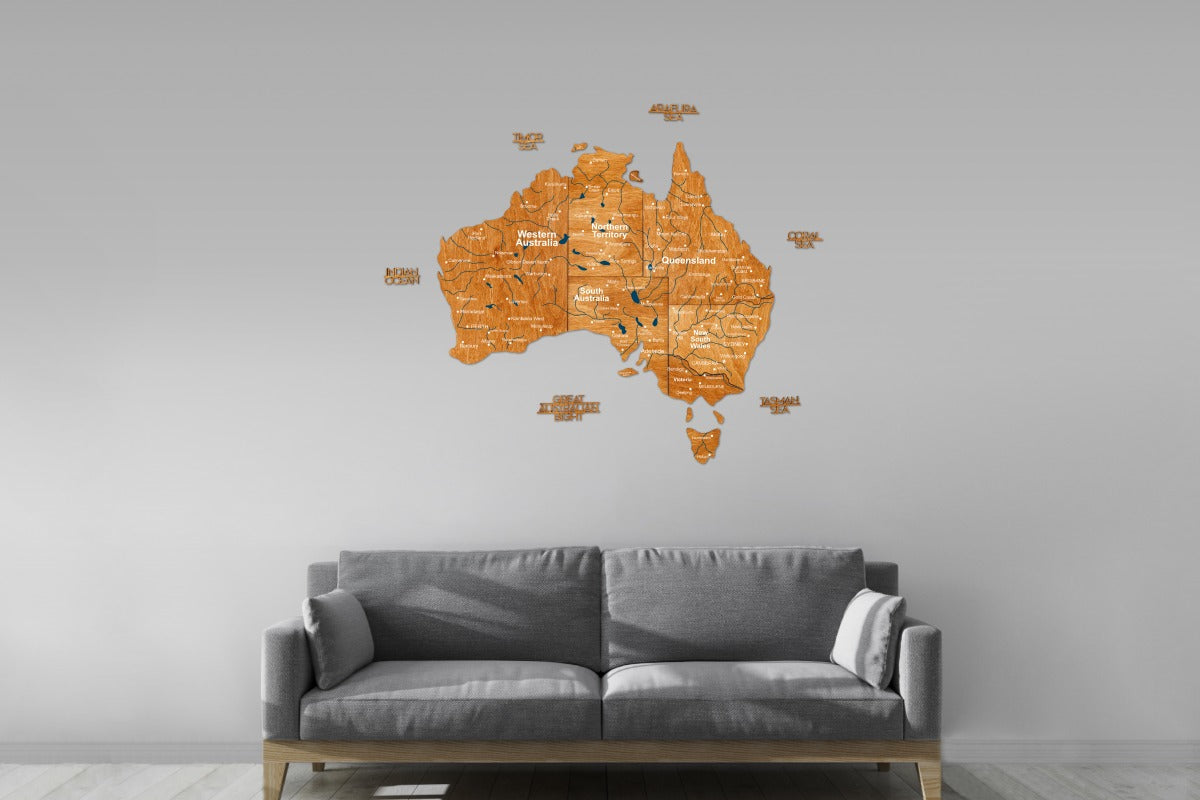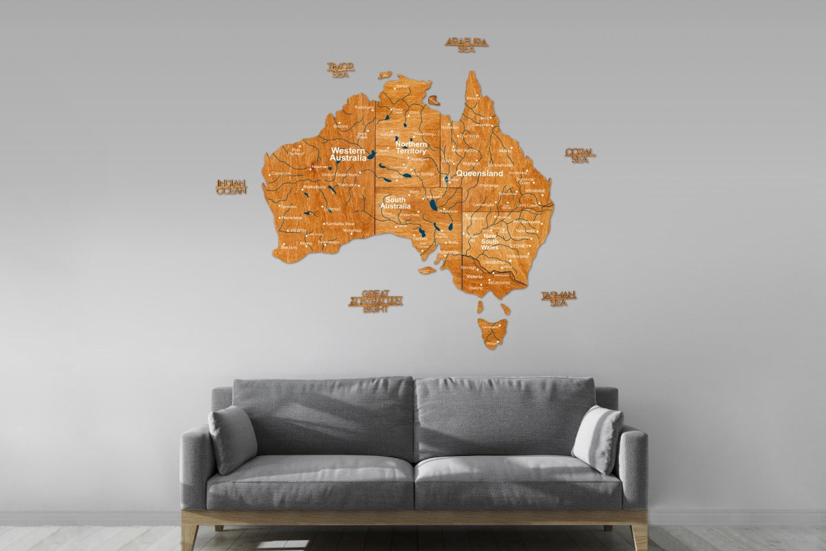 El Mapa de madera 3D de Australia - Roble Está diseñado para ser la pieza central de cualquier espacio. Para adaptarse a diferentes dimensiones de pared, ofrecemos los siguientes tamaños: