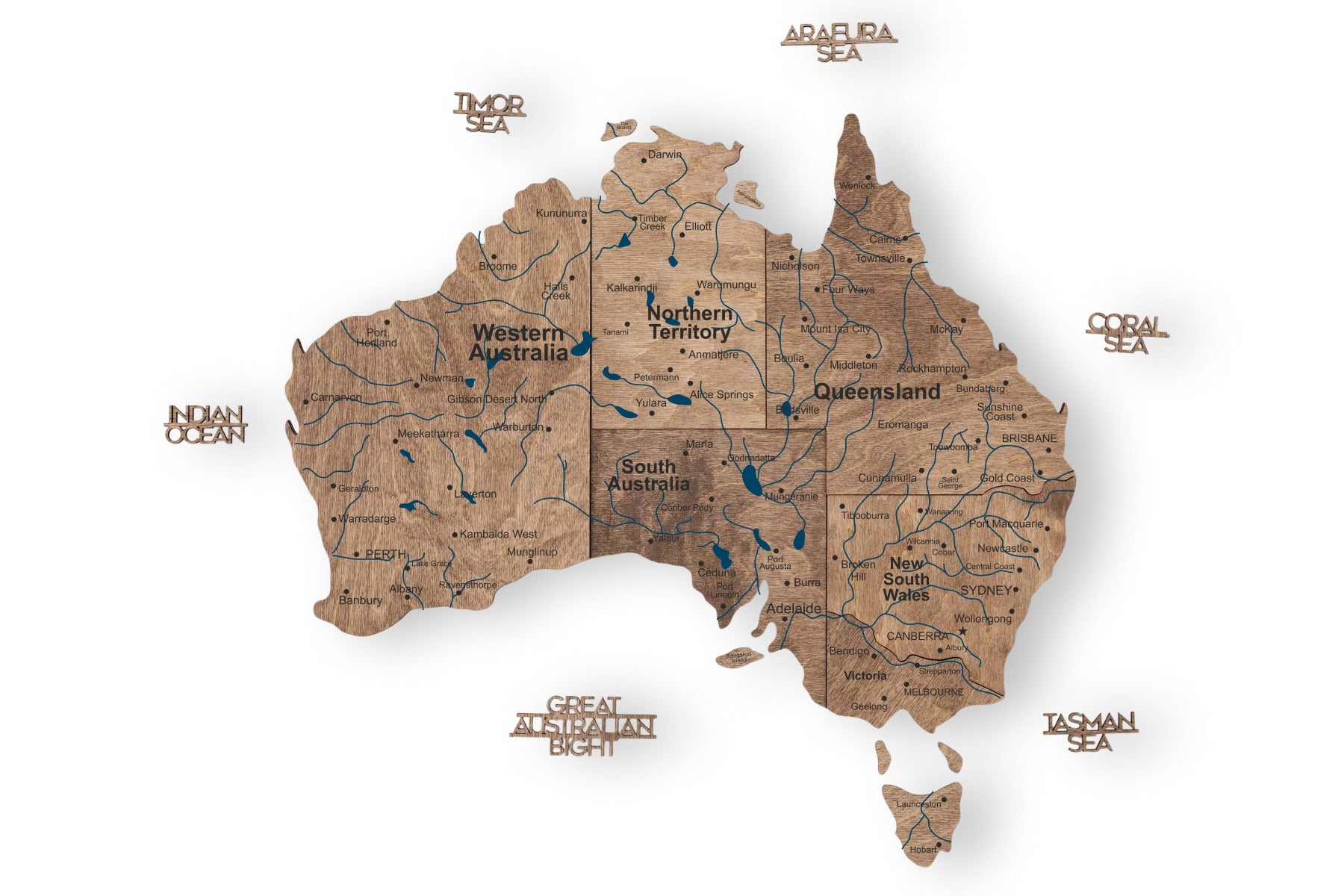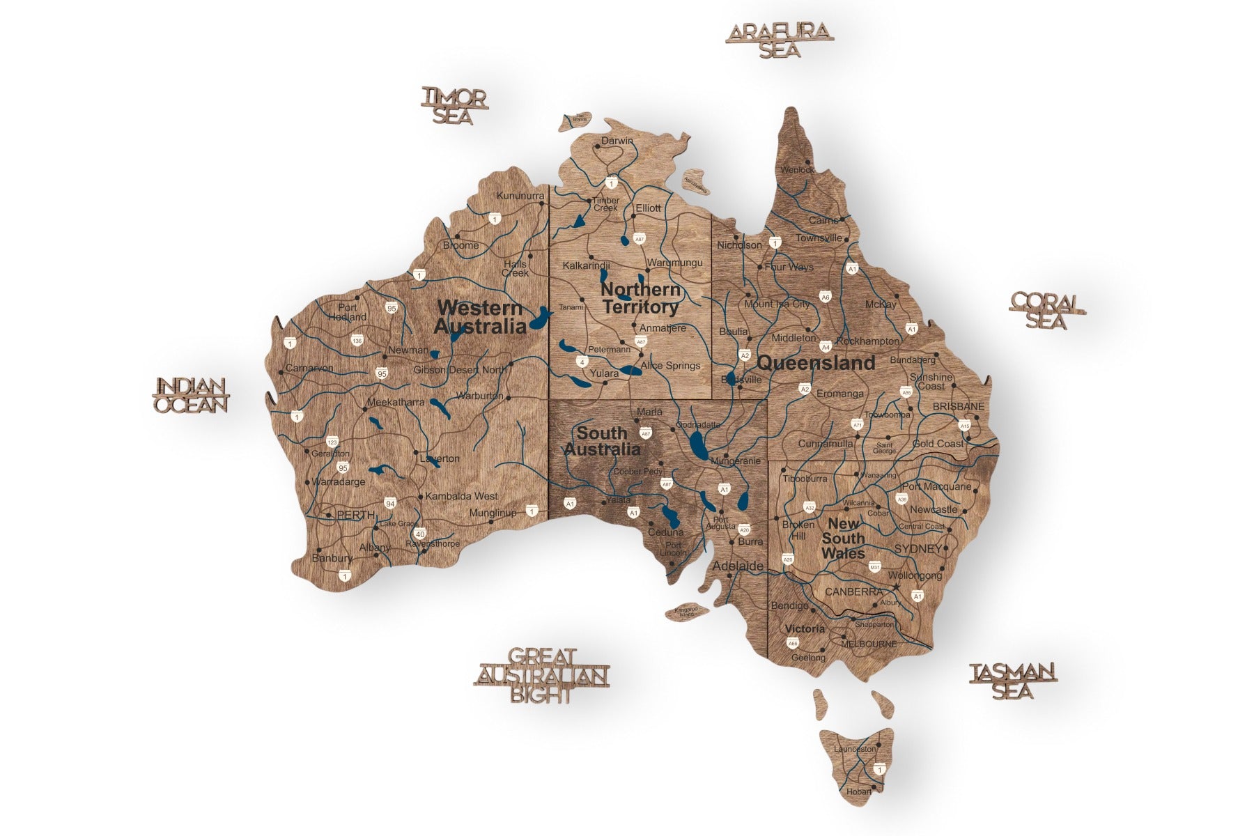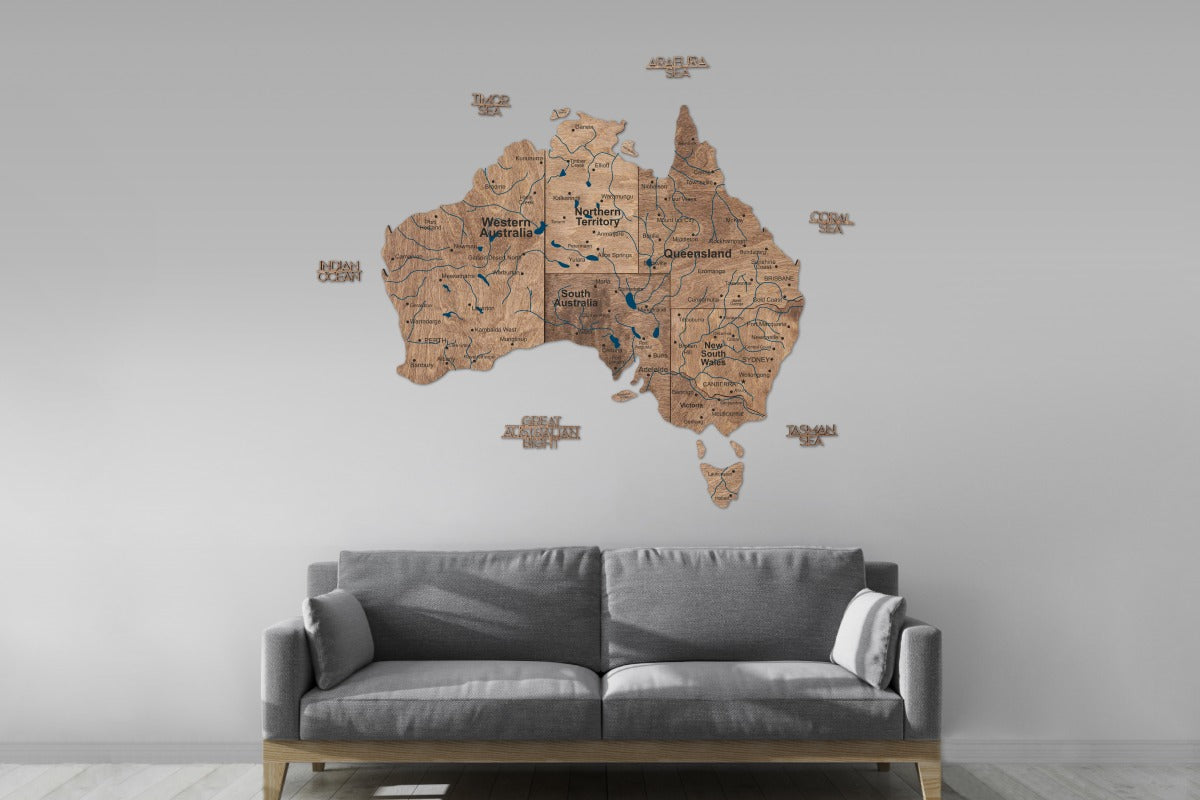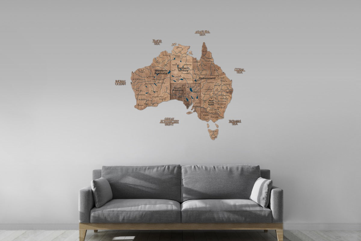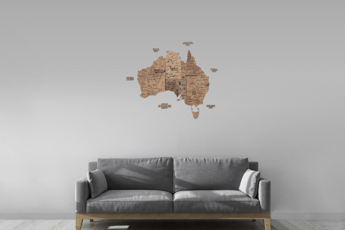 El mapa de madera 3D de Australia - Terra está disponible en cuatro tamaños, lo que garantiza una combinación perfecta para cualquier pared, desde pequeños rincones de estudio hasta grandes galerías de salas de juntas: