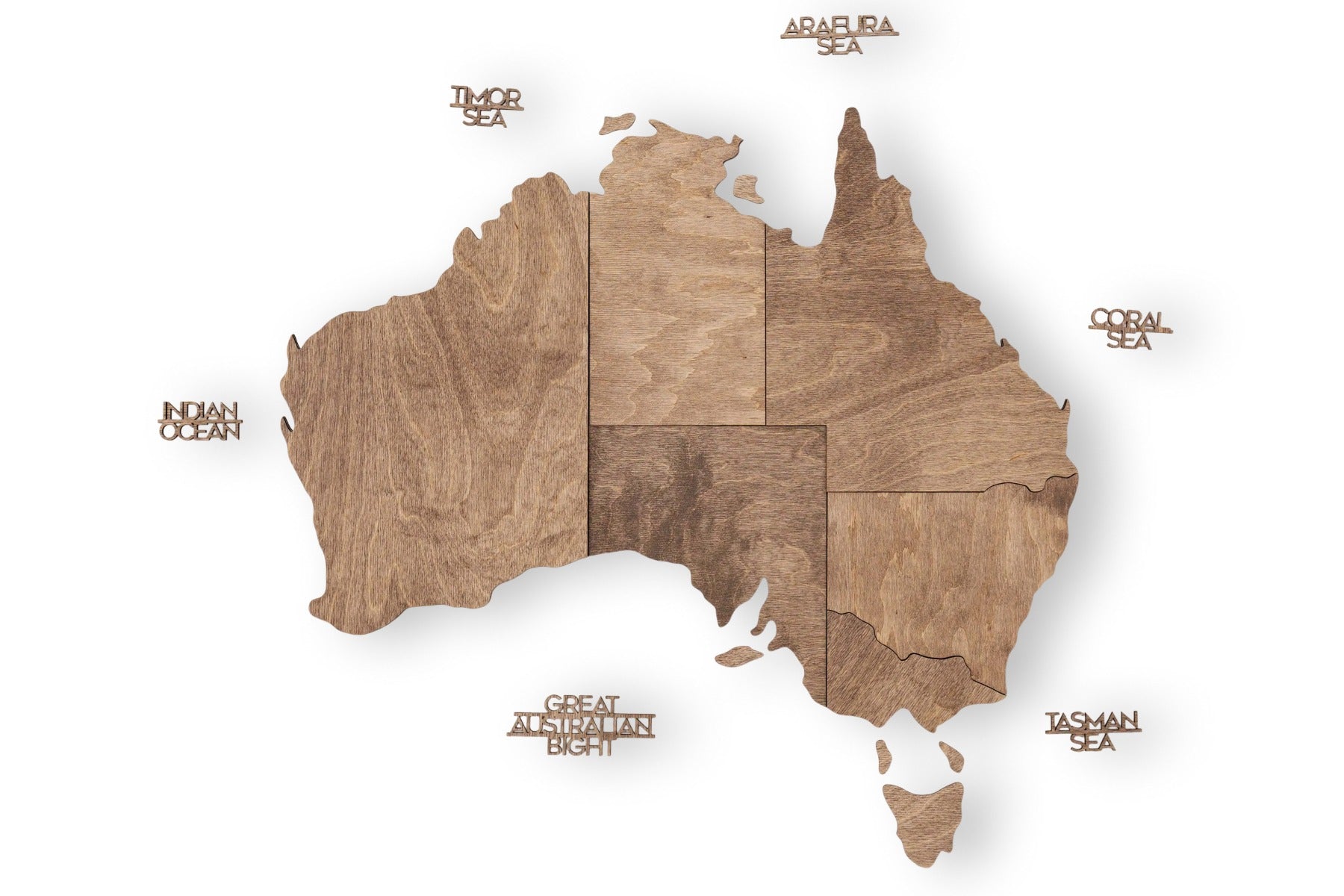 Descubra la belleza del hemisferio sur con el mapa de madera 3D de Australia - Terra. Esta versión presenta una sofisticada paleta de tonos tierra y madera natural que evocan los paisajes agrestes y las arenas del desierto del interior de Australia. Hecho a mano por Disfruta del bosque Este mapa utiliza madera en capas para crear una profundidad impactante que transforma un simple mapa de Australia en una obra de arte mural 3D de alta calidad. Es la opción perfecta para quienes aprecian las texturas orgánicas y una estética cálida y sencilla en la decoración de su hogar u oficina.