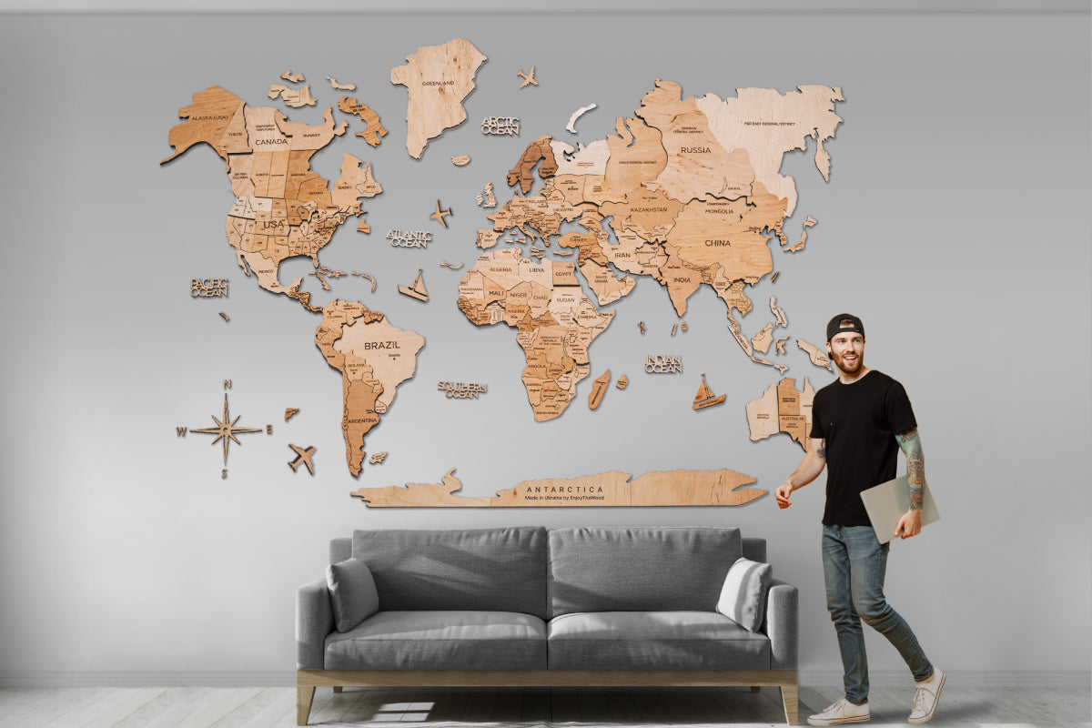 As the first creators of Wooden World Maps, Enjoy The Wood offers you original products backed by a strong patent portfolio, reaffirming our commitment to innovation and protection 🥇. Used in the process of manufacture, a birch plywood is a well-known and popular material. Not only it is sustainable and durable, but it also has a timeless look that never goes out of style. The map is thin, which makes it look elegant in the room of any size.