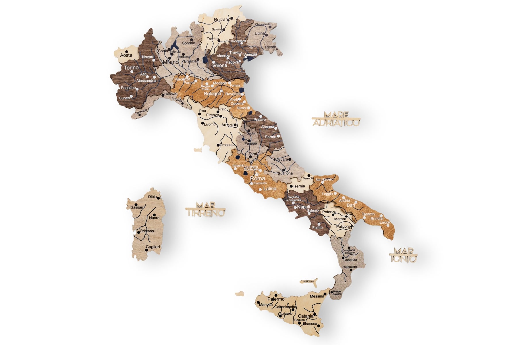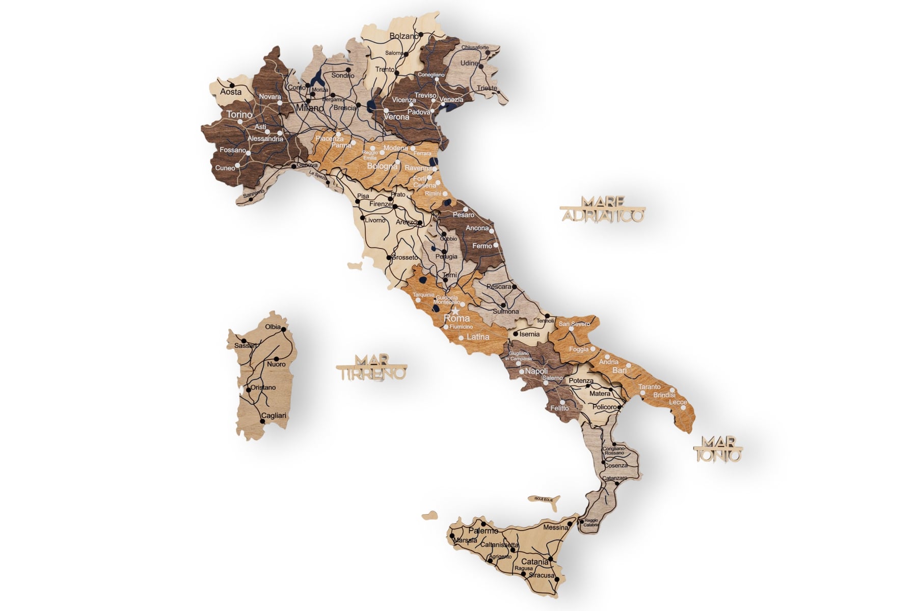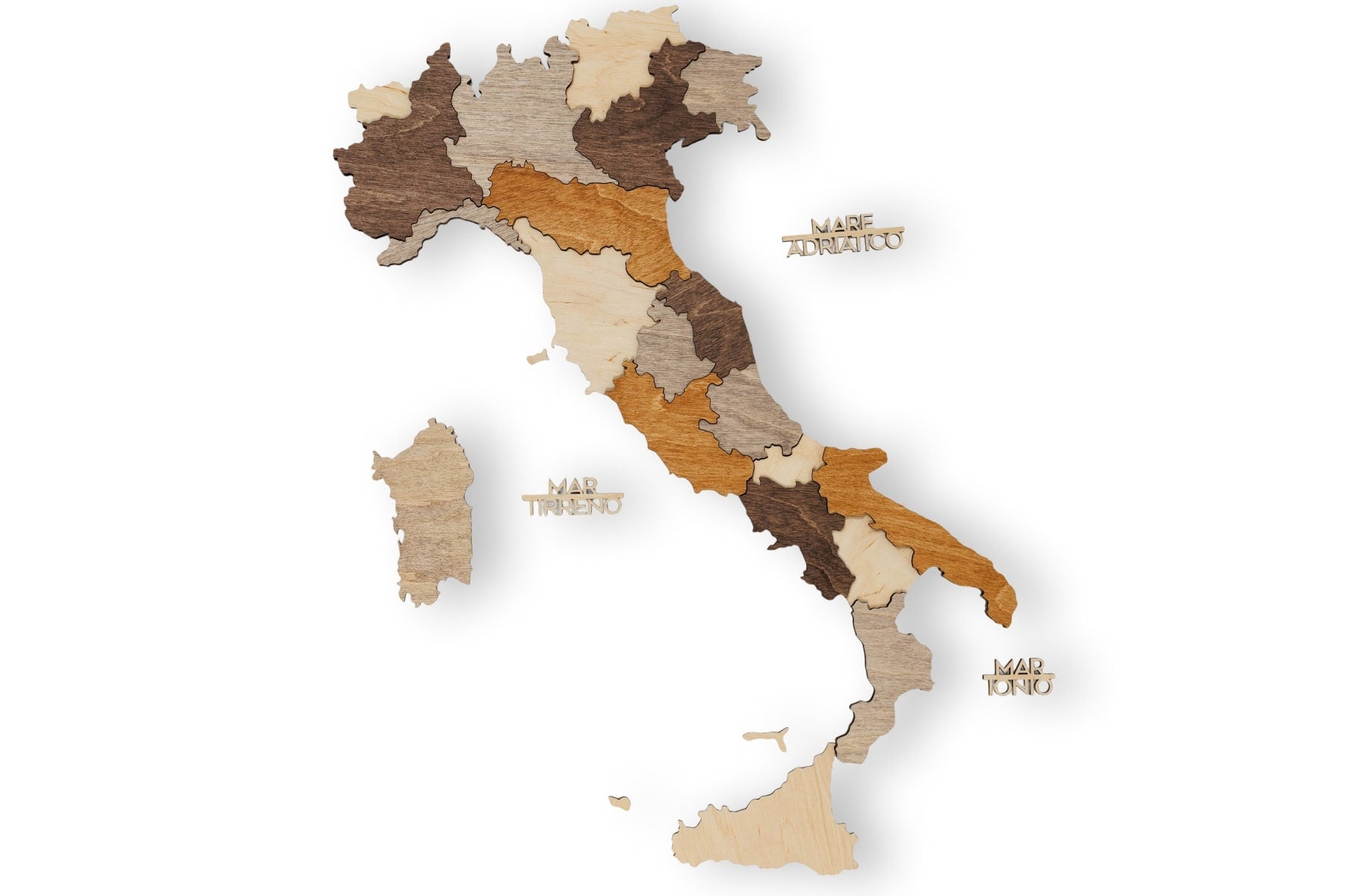Made from natural birch plywood with a thickness of 6–18 mm, the map showcases beautiful wood grain and a tactile relief. The multicolor finish brings Italy’s regions to life—from the Alps to Sicily—adding warmth and energy to modern interiors and travel-inspired decor.