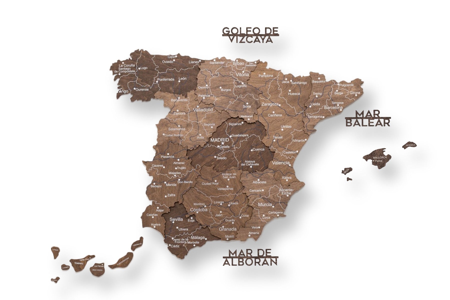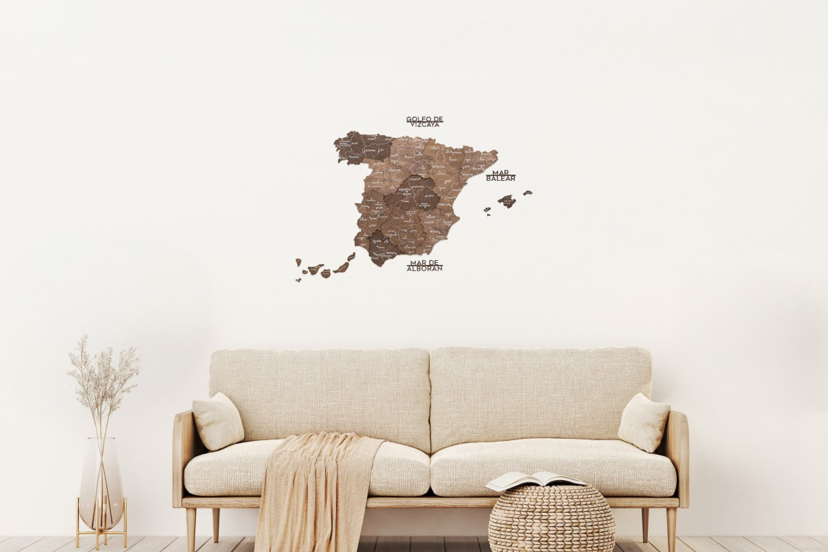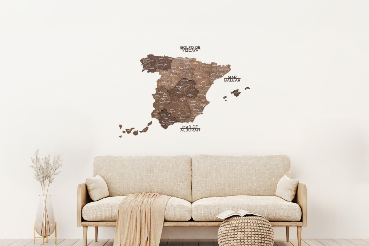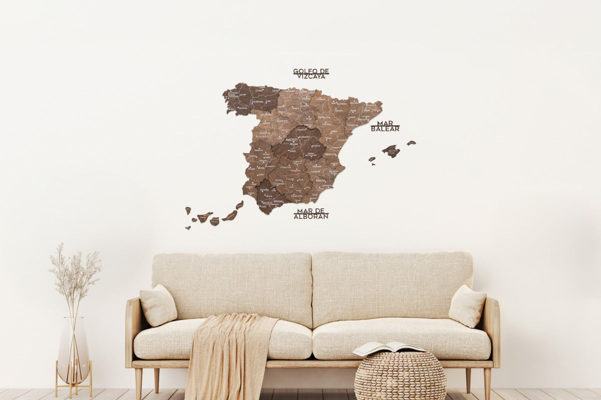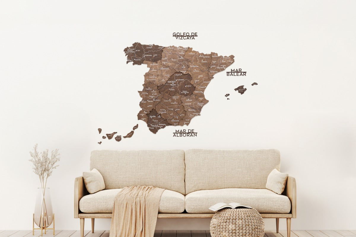 Esta versión enfatiza el contraste profundo y la textura, permitiendo que cada elemento de la mapa de ciudades de España Para destacar con belleza. El acabado natural crea una sensación cálida y lujosa que se integra a la perfección en interiores modernos o clásicos.