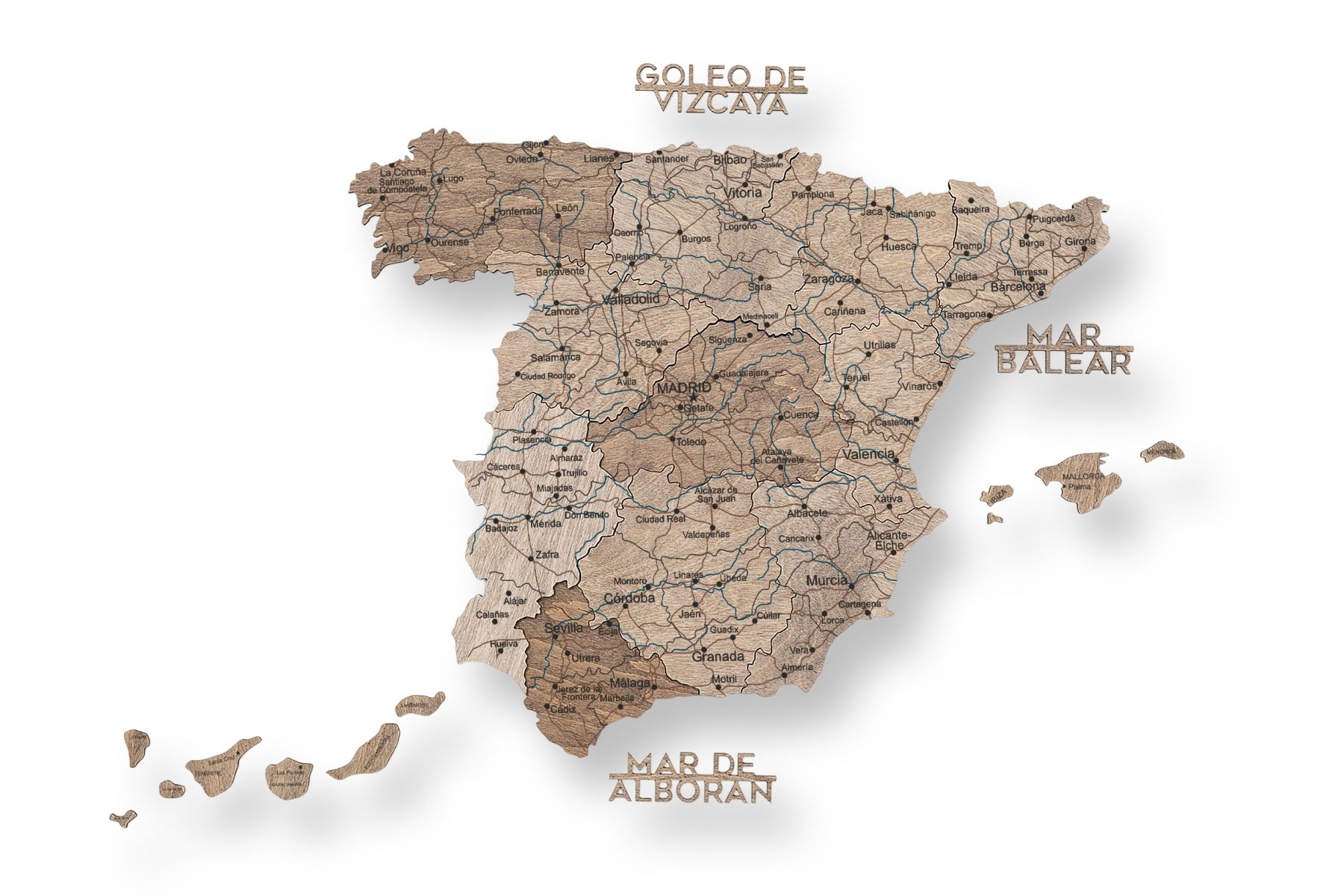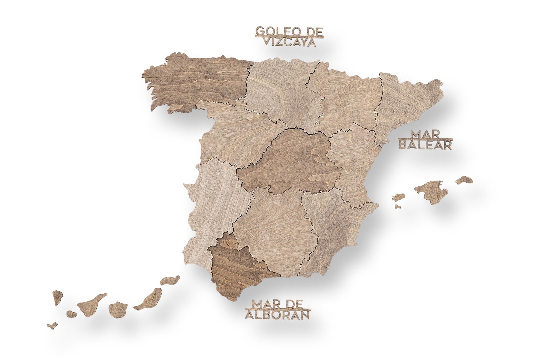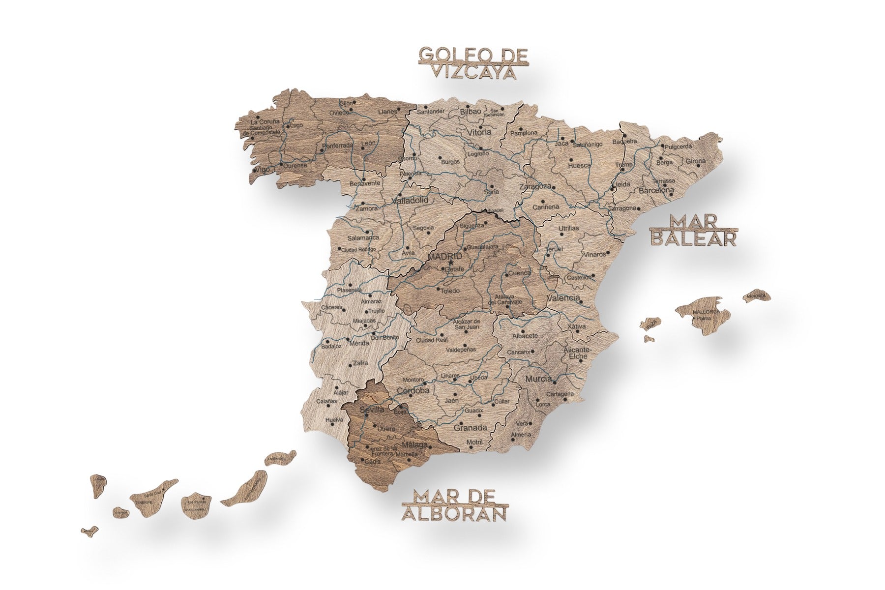 Perfecta para viajeros, minimalistas y entusiastas del diseño, esta versión enfatiza tanto el estilo como la esencia. Cada región, frontera y ciudad está cortada con precisión a láser, creando una imagen táctil y detallada. España en el mapa representación.