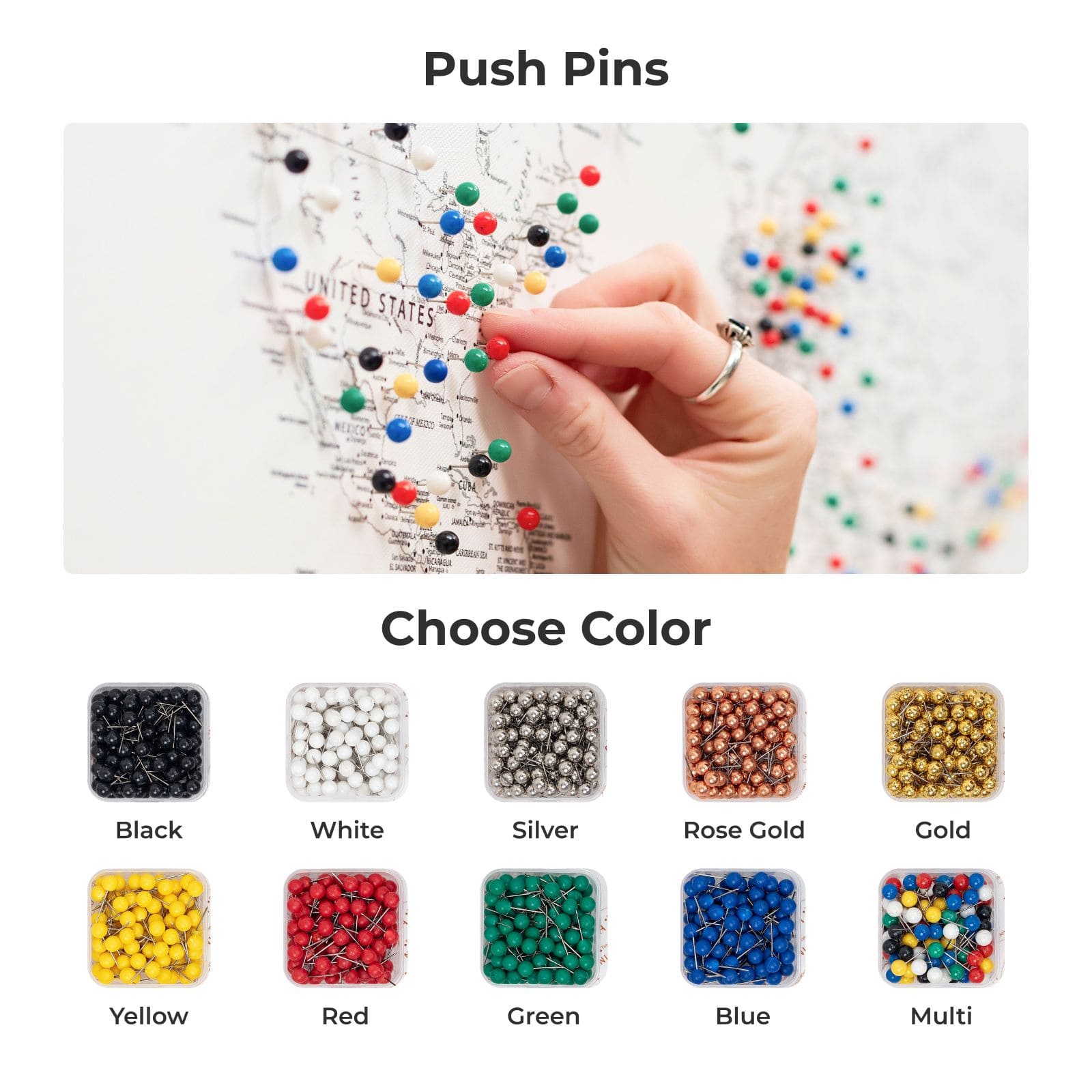 Introducing our canvas push pin travel map: crafted from durable fabric, ideal for pinning your adventures. It features a UV-protective coating and a wooden underframe and is ready to be hung. Available in 2 sizes and many designs, with clear borders and readable text for all 197 countries, making it easy to mark your travels.
