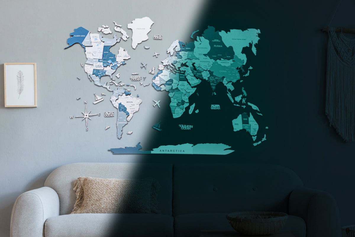 What’s so special about glowing wall décor? Simple yet beautiful, it wins over the hearts of many homeowners looking for a change. Here’s the trick: the map stores sun energy during the daytime, making it glow as the night falls. The piece's palette is an eye-friendly blend of ocean blue, light blue, turquoise, and other colors that work well for any interior.