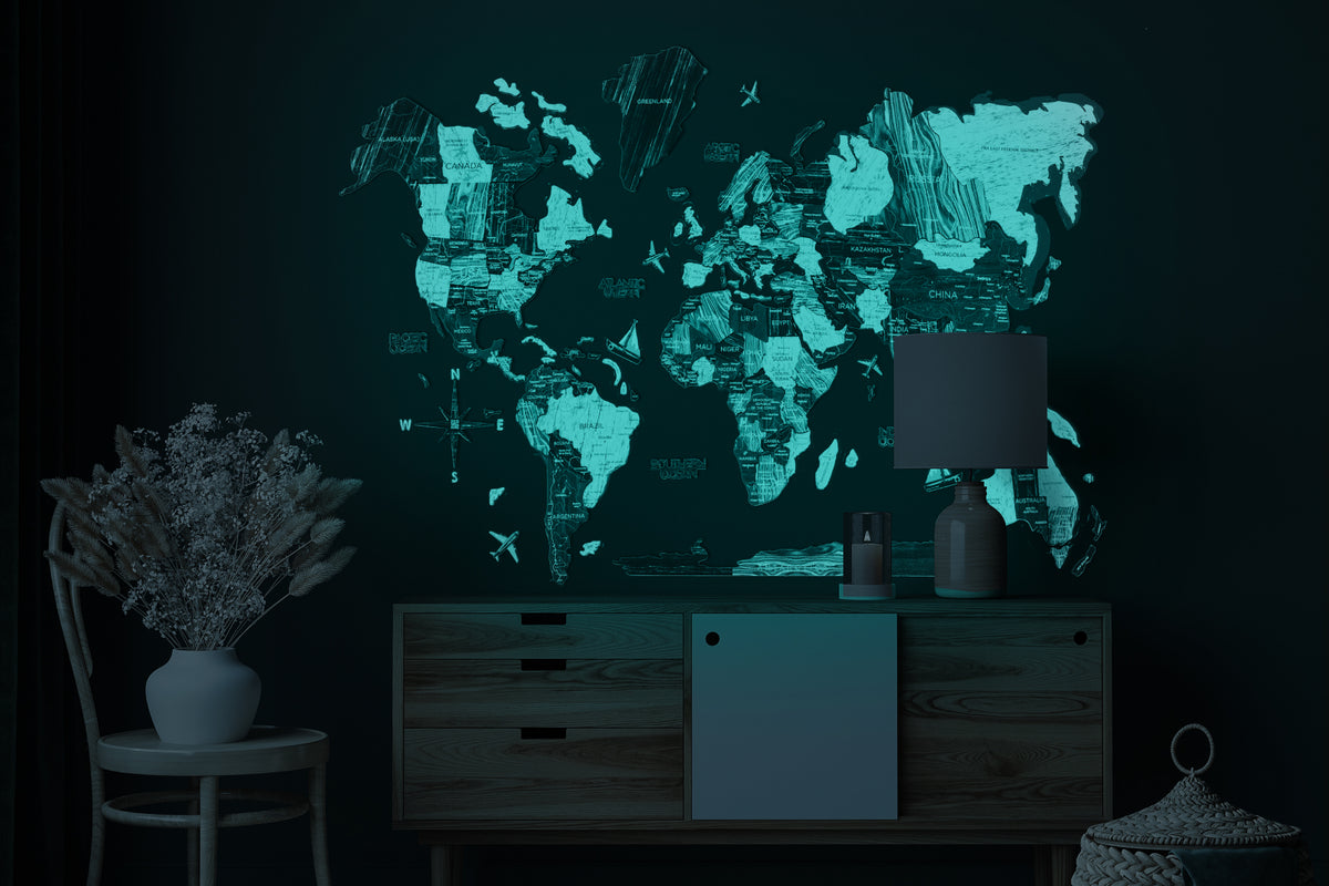 In addition to creating a homely aesthetic, luminous objects décor provides a finishing touch to your interior. Be it a rustic, transitional, industrial, beach, or any other style – the wall map is a great way to elevate both your spirit and mood.