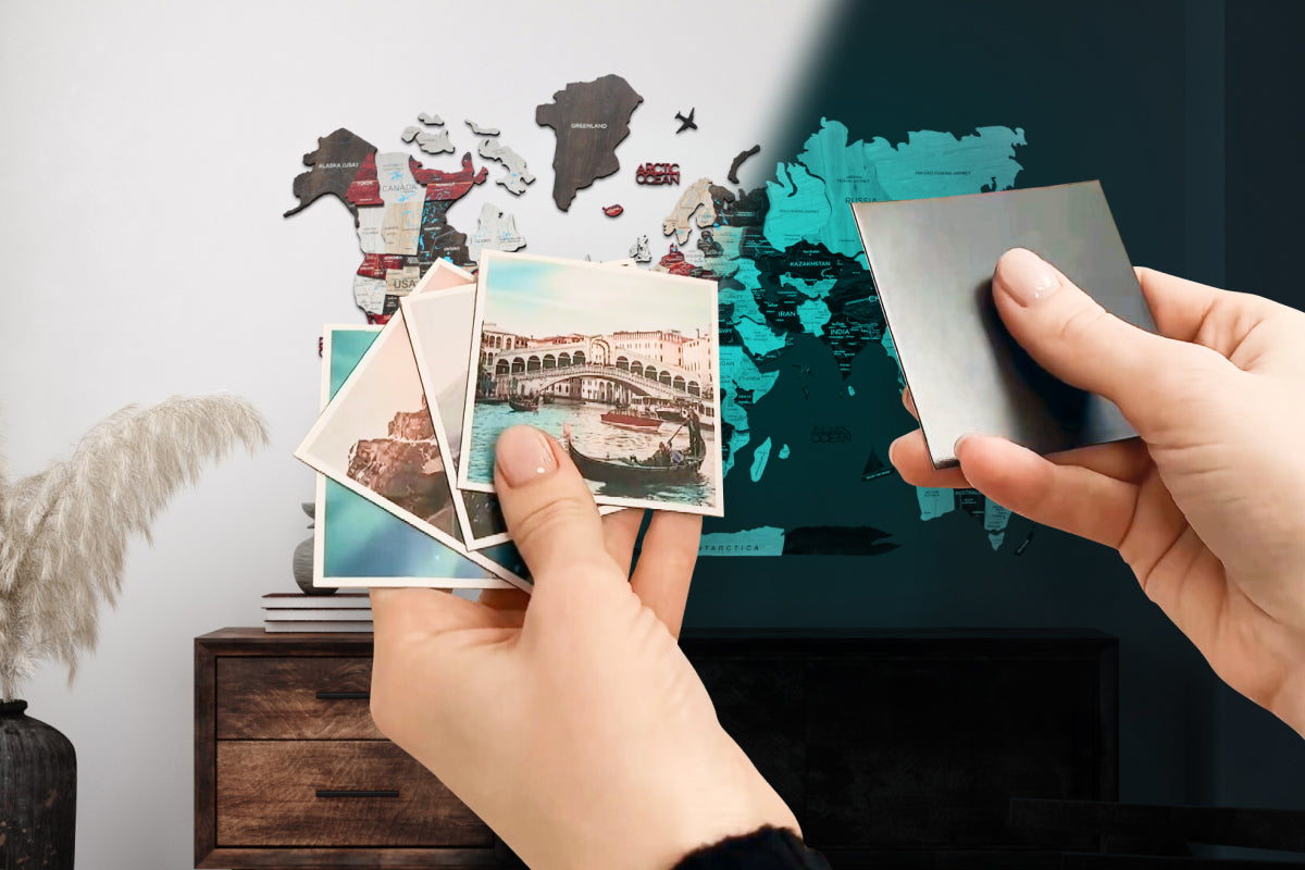 Go for a luminous décor that stores energy during the daytime to glow in the dark! The effect is reached using non-toxic paints that guarantee a 2-hour luminous show. When it comes to the magnetic option, you can benefit from the map’s magnetic surface. Order a world map with magnetic pins for travel to track your past trips and plan new exciting adventures.