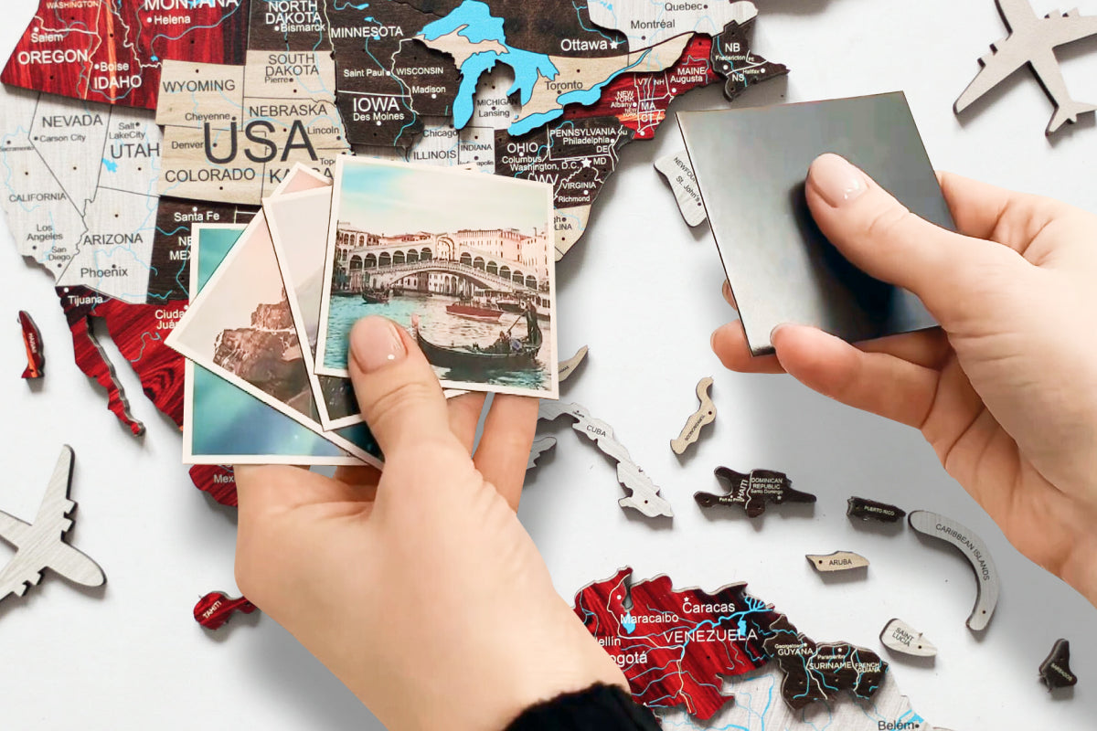 Assemble the map with no extra help! With wooden boats, planes, and a compass, you will find the double-sided sticky tape and instructions needed to mount the piece.