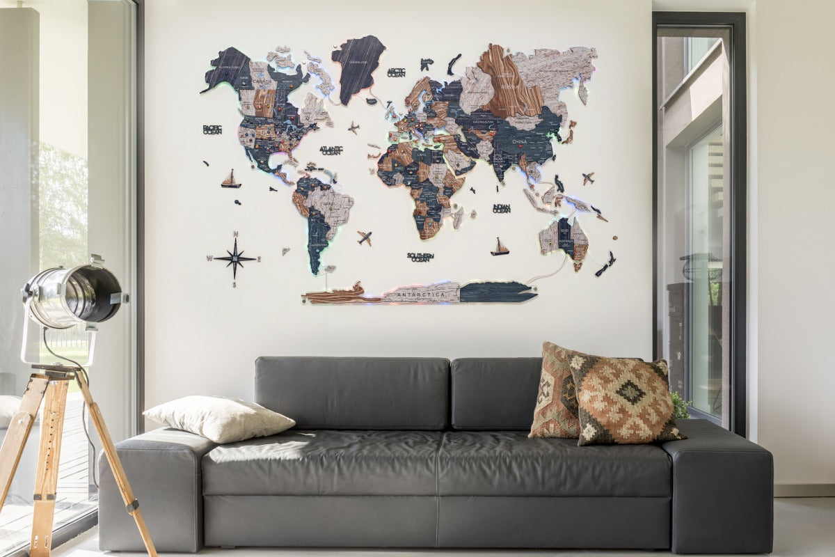 The rich, mysterious tones add depth and warmth, making this illuminated world wall map perfect for modern living rooms, home offices, or creative studios. Track your past adventures, plan future trips, or simply enjoy the ambient glow as part of your daily decor.