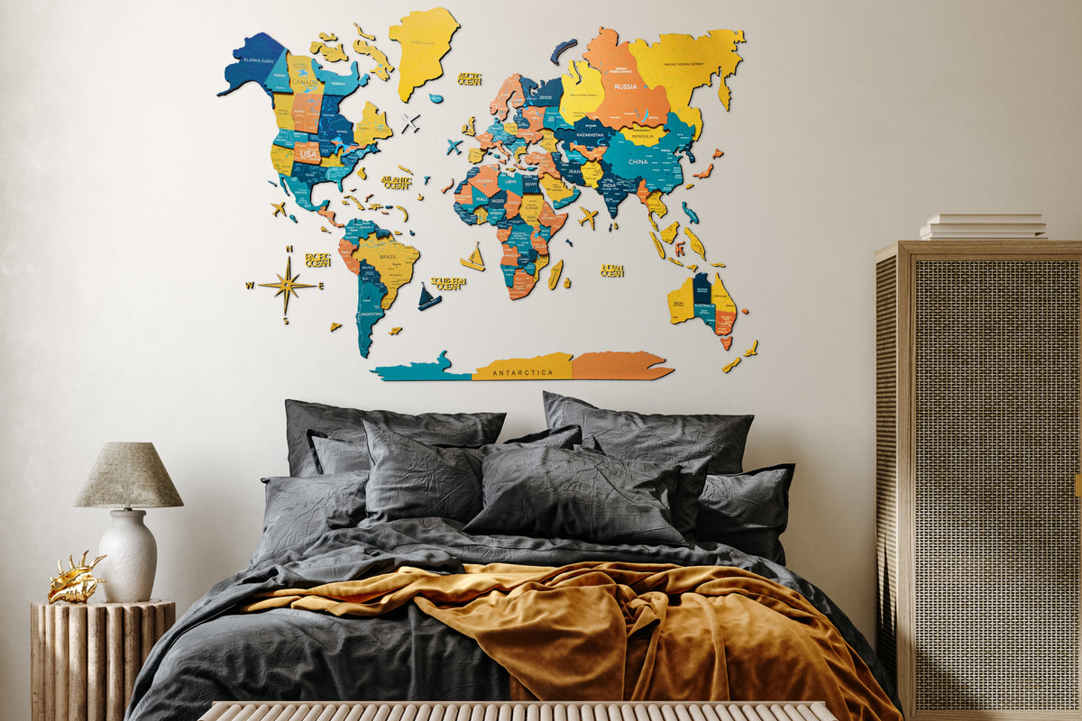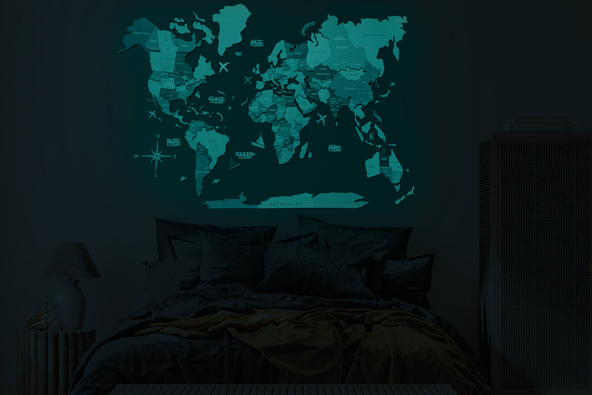 What makes our initial 3D luminous colored wooden world map from the Physical collection stand out? Crafted by hand from eco-friendly materials, this wooden map remains perpetually stylish. However, its enchantment truly begins as night falls. The map harnesses energy during daylight hours and emanates a gentle glow for several hours after dusk, achieved through the use of non-toxic paints in its creation.