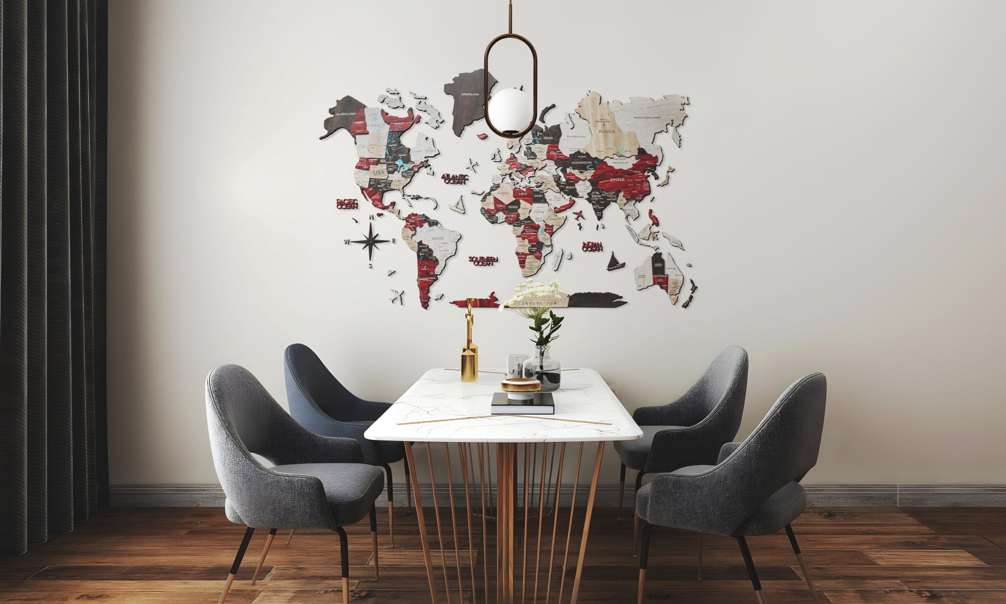Whether you’re a travel geek or not, having a map from the Urban line will add a personal touch to the living room, bedroom, kitchen, or even a hall. The map of the world painted on wood has a versatile design and a broad palette of colors – a mix of dark brown, red, grey, beige, and blue. All the tones are eye-friendly and play well with any interior.