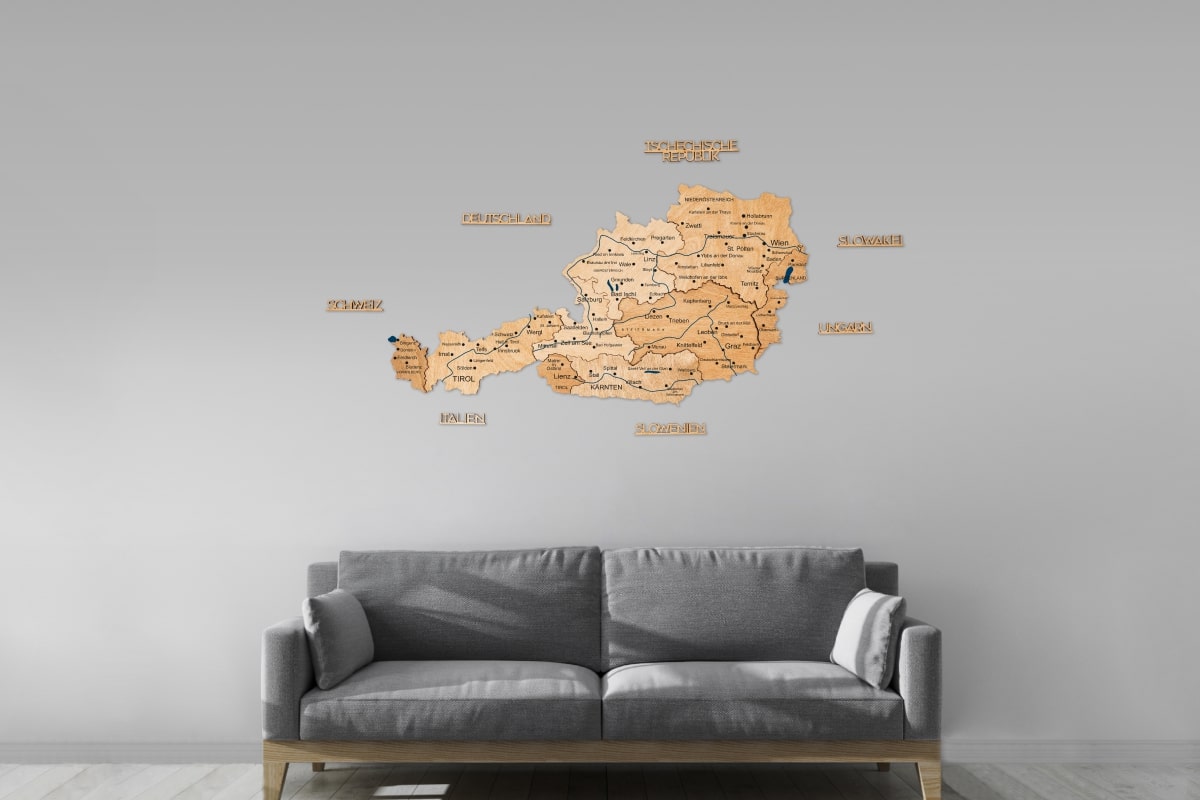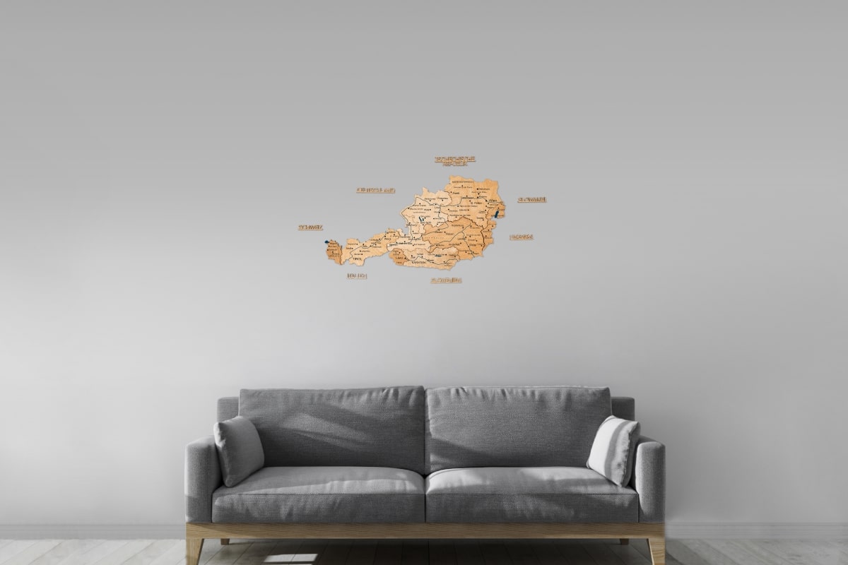Add a touch of radiant elegance to your home or office with the 3D Wooden Map of Austria – Gold by Enjoy The Wood . This exquisite piece combines the natural charm of high-quality timber with a luxurious gold-toned finish, creating a striking focal point for any wall. Whether you are an avid traveler or someone who takes pride in Austrian heritage, this map of Austria with major cities offers a sophisticated way to display your connection to this beautiful Alpine nation. The multi-layered 3D design provides depth and shadow, making the geographical features of the country pop with artistic flair.