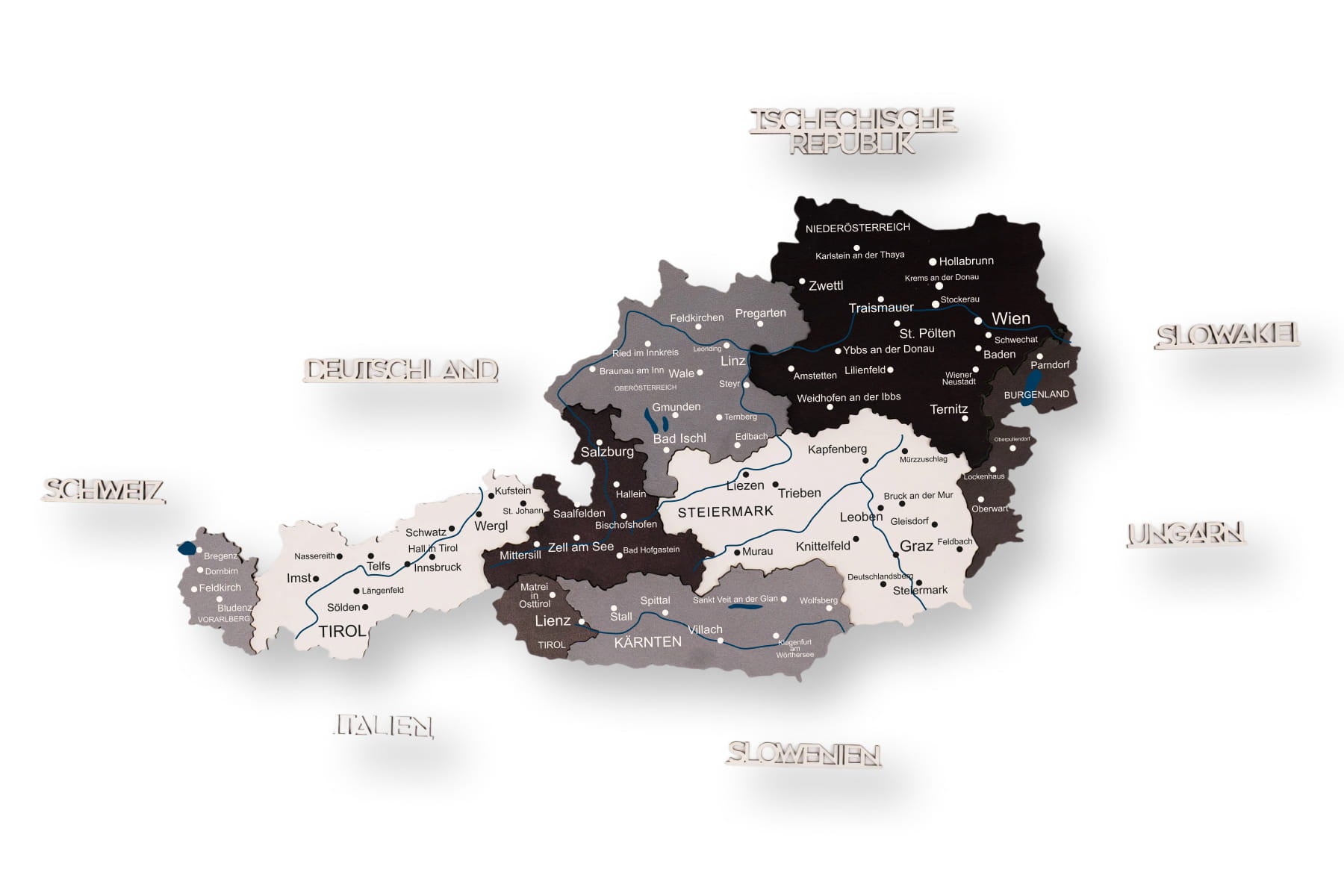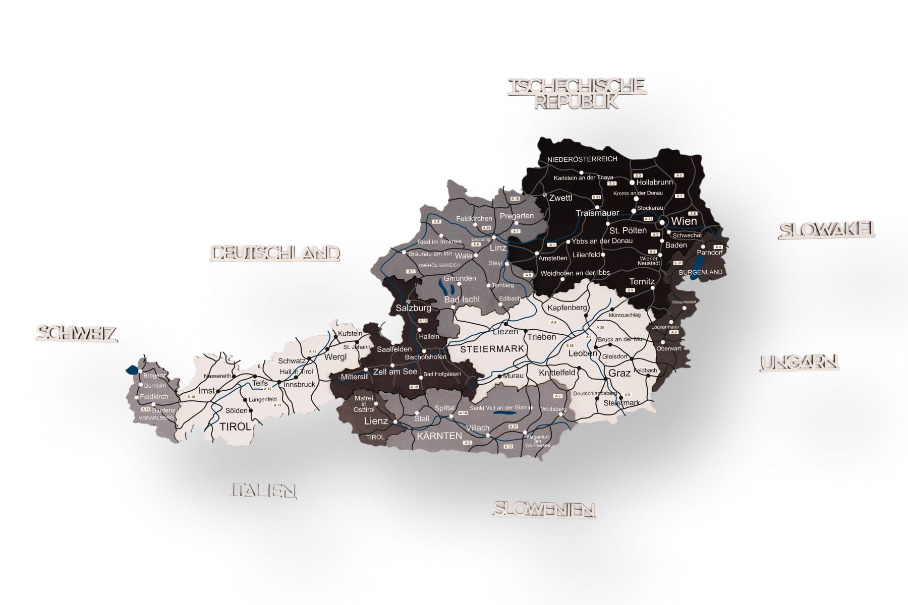 Made from natural birch plywood with a thickness of 6–18 mm, each map is precisely laser-cut and carefully assembled by hand. The calm, balanced Nordik tones highlight Austria’s geography while adding depth, texture, and a contemporary aesthetic to living rooms, offices, and creative spaces.