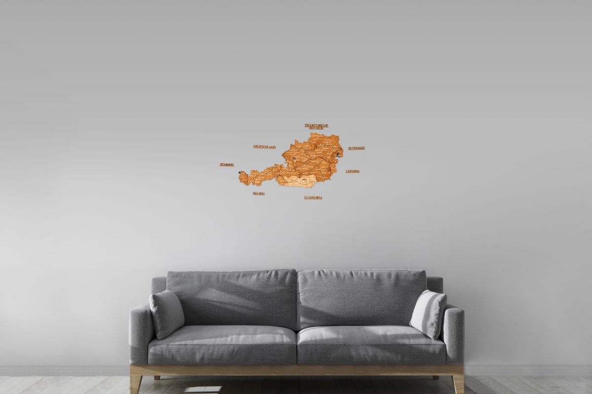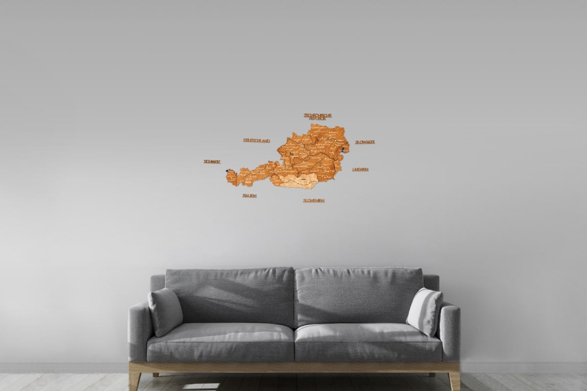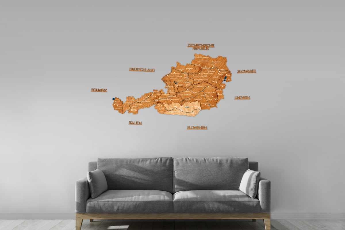 Crafted from natural birch plywood with a thickness of 6–18 mm, each map is precision laser-cut and carefully assembled by hand. The multi-layered construction adds depth and dimension, subtly reflecting the mountainous landscapes of the Austrian Alps while bringing warmth and character to living rooms, offices, and study spaces.