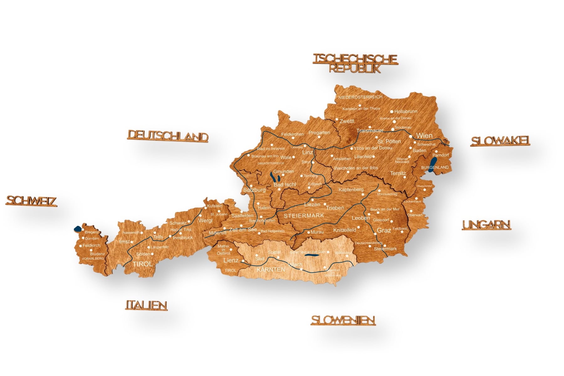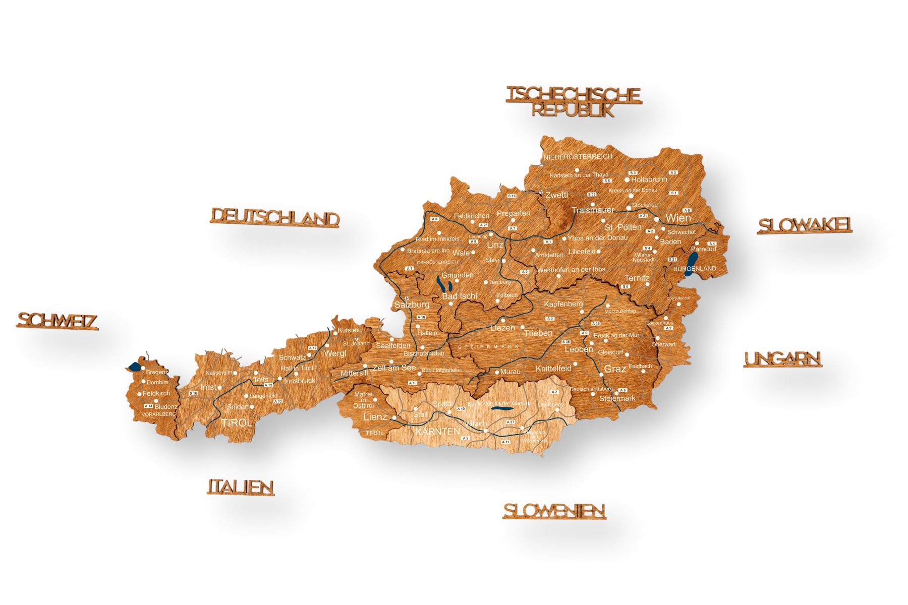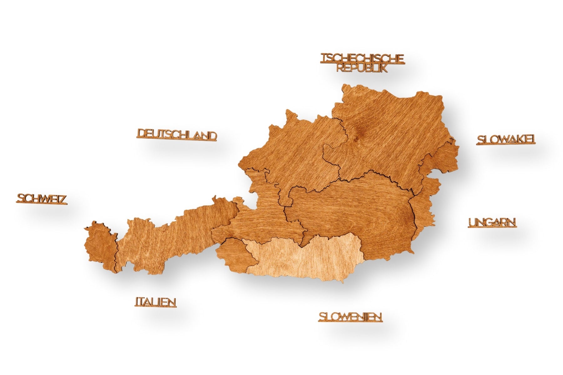 Crafted from natural birch plywood with a thickness of 6–18 mm, each map is precision laser-cut and carefully assembled by hand. The multi-layered construction adds depth and dimension, subtly reflecting the mountainous landscapes of the Austrian Alps while bringing warmth and character to living rooms, offices, and study spaces.