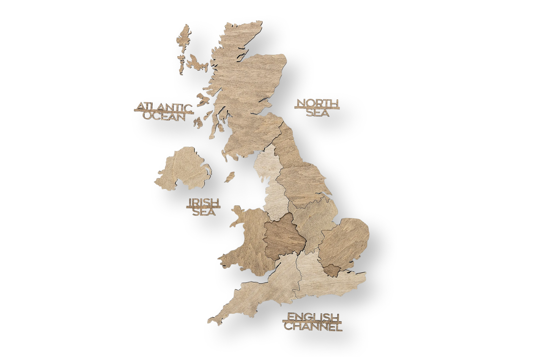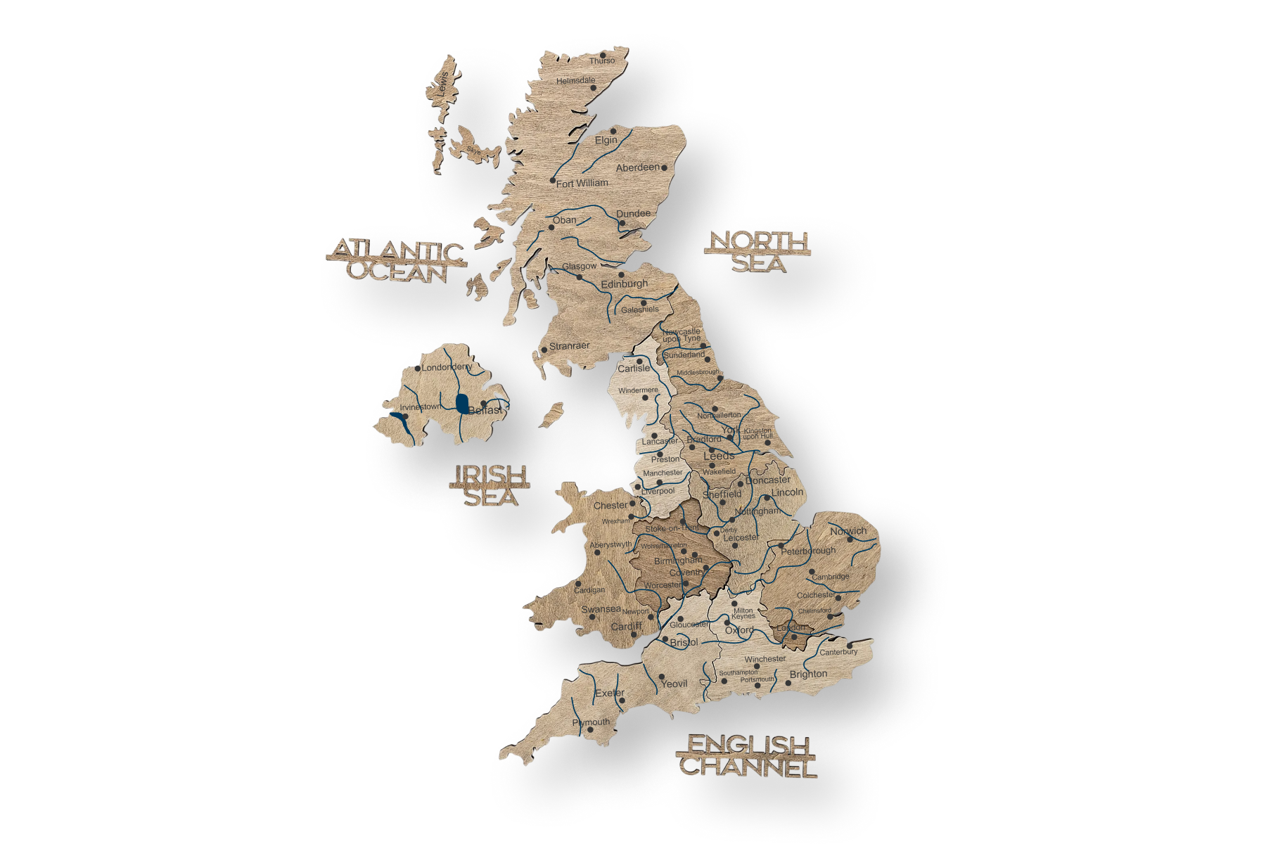 The Terra map is a tactile masterpiece. Its defining feature is the depth achieved through an intricate, stacked 3D construction, where layers of wood are meticulously assembled to give the map a visually dynamic presence. The deep, warm hues of the Terra finish provide a perfect canvas for the finely engraved geographical detail. Every border and city name connects you to the deep heritage of the UK.