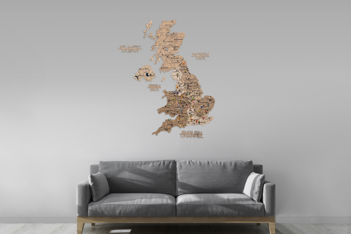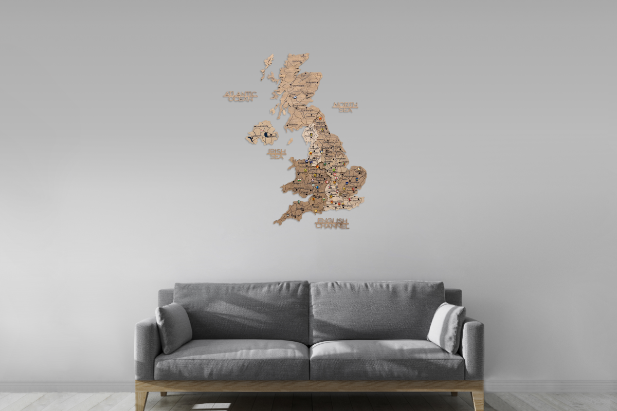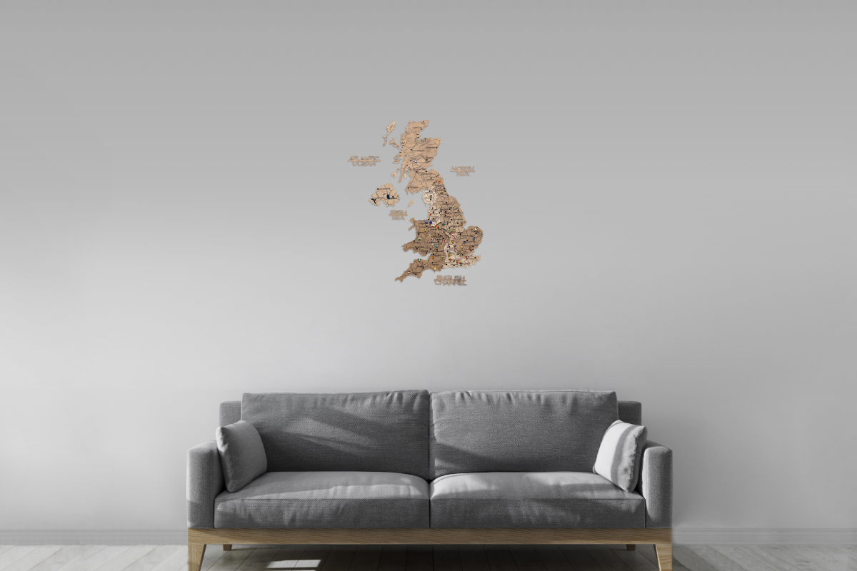 To transform this piece into a personal travel log, special map pins can be purchased separately to mark and celebrate your journeys throughout the United Kingdom.