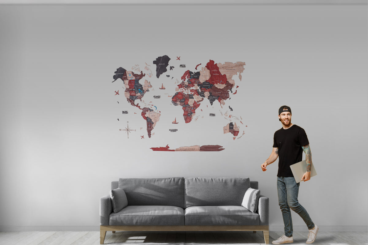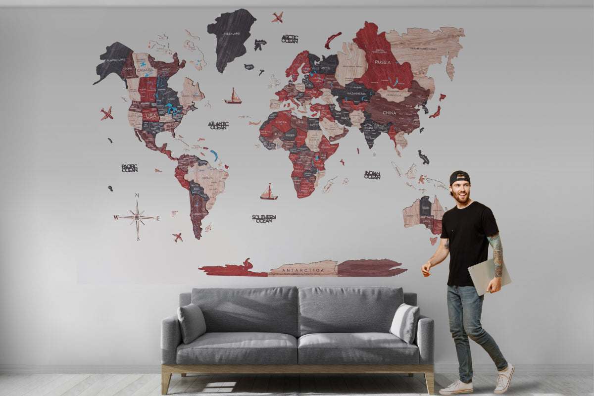 The world map painted on wood meticulously displays many details, including country names and borders, capital cities, urban hubs, rivers, tranquil lakes, and mountain ranges. Some smaller islands and nations have been left out, rendering them unsuitable for educational purposes. To unify your red world map, be sure to add these wooden sightseeings sticky pins to your cart.