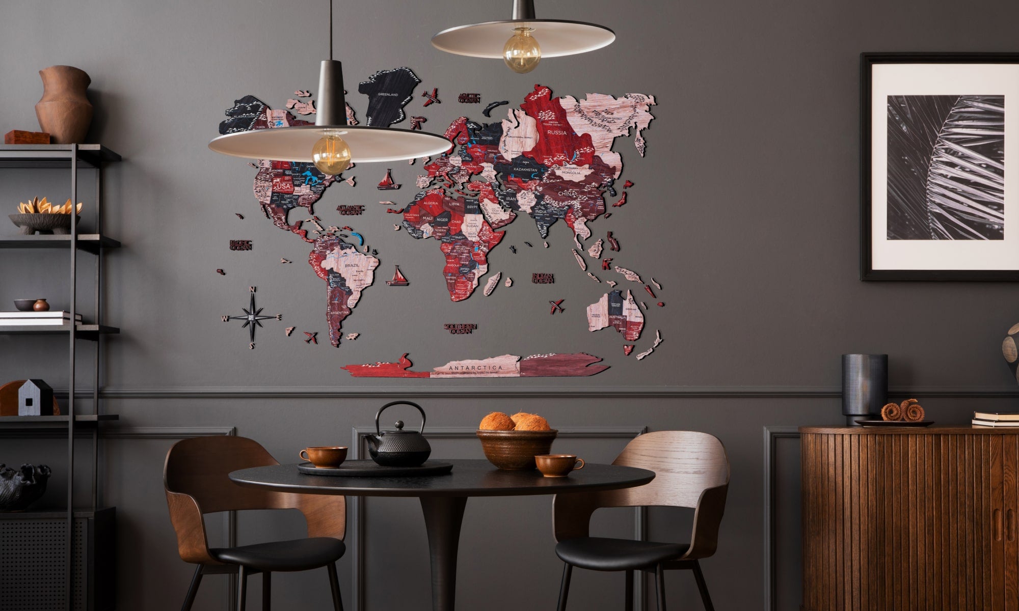 The world map painted on wood meticulously displays many details, including country names and borders, capital cities, urban hubs, rivers, tranquil lakes, and mountain ranges. Some smaller islands and nations have been left out, rendering them unsuitable for educational purposes. To unify your red world map, be sure to add these wooden sightseeings sticky pins to your cart.