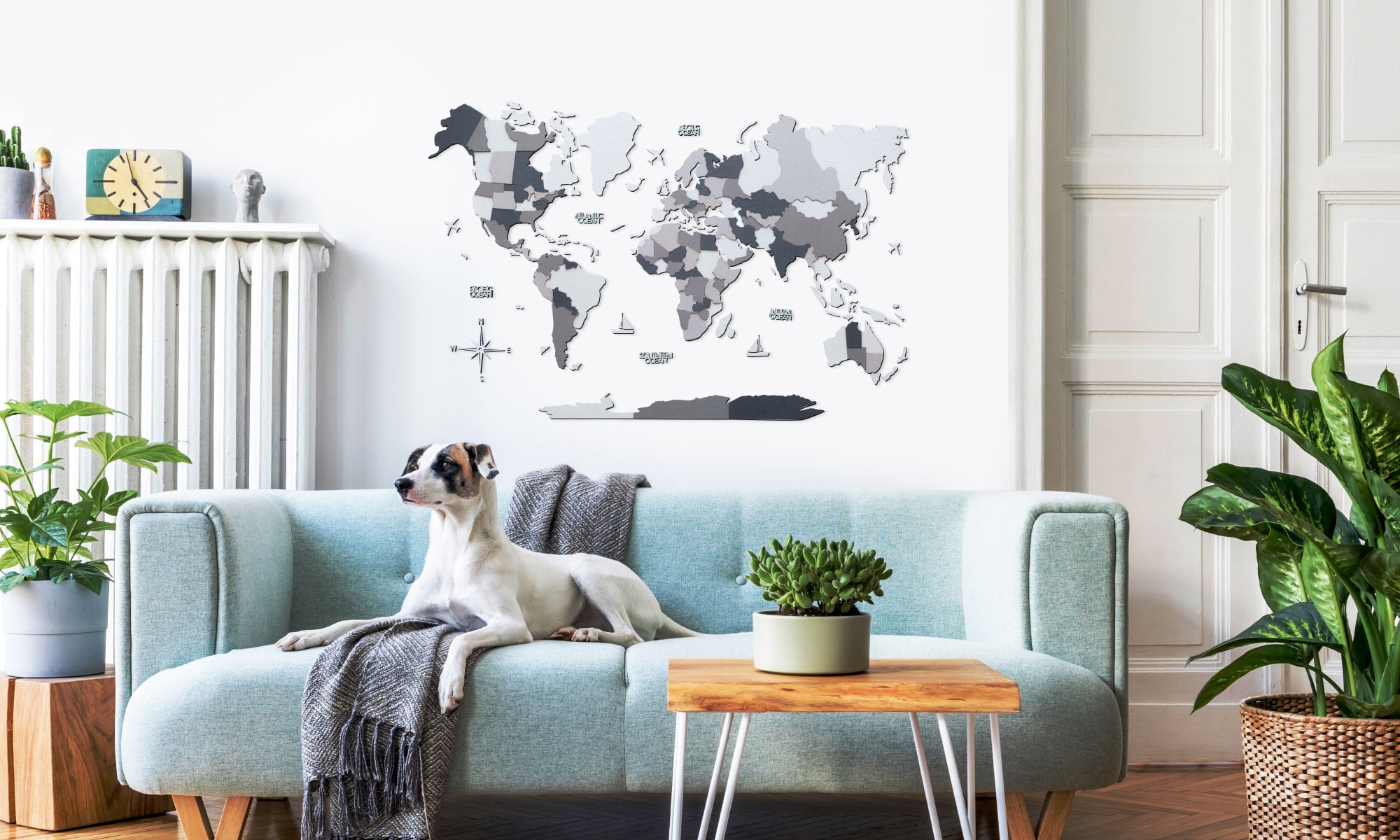 Whether you choose a 3D colored world country map or an illustration of the whole planet, our products from the Concrete line will add a personal story to the boring walls. The color palette of the map is eye-friendly. The mix of grey, white, black, and granite do its job by brightening up a room and making it feel more spacious.