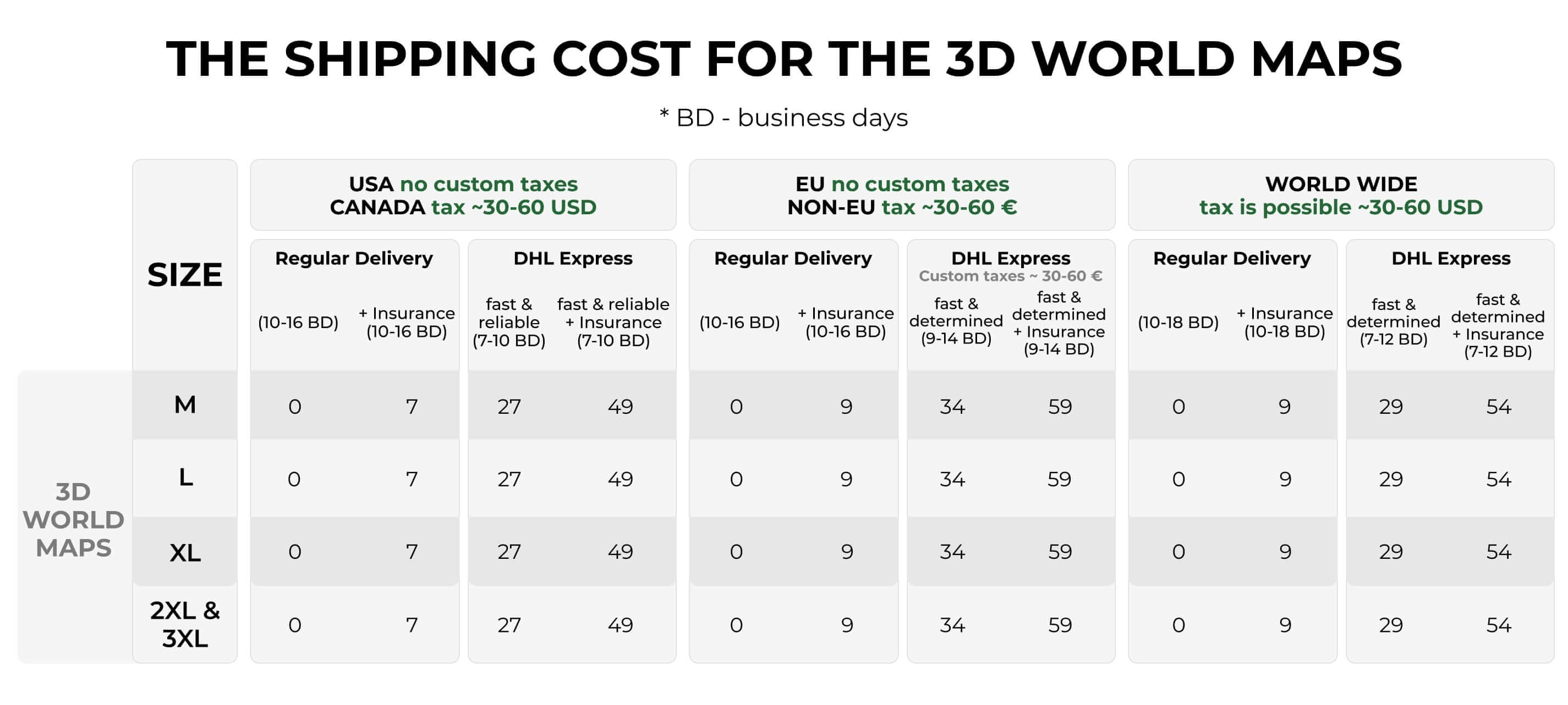 Here’s a table that’ll help you with your Wooden World Map order. Shipping rates for other items will be calculated at checkout.