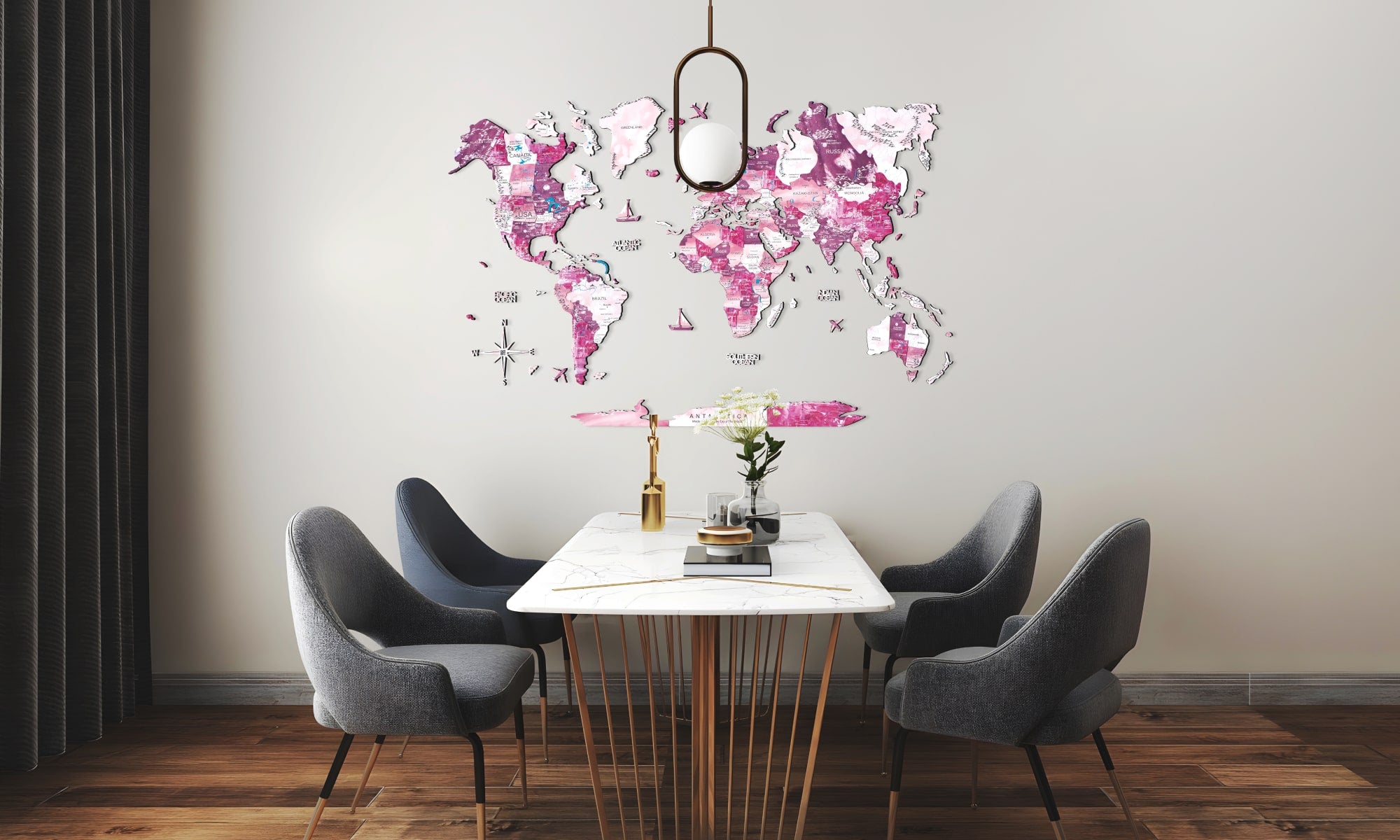 Made from durable fiberwood, colorful wooden wall art exemplifies eco-friendliness with its toxic-free finishes. Handcrafted to withstand the rigors of time, the pink world map seamlessly attaches to nearly any surface, offering a lasting and flexible enhancement for your home or office decor.