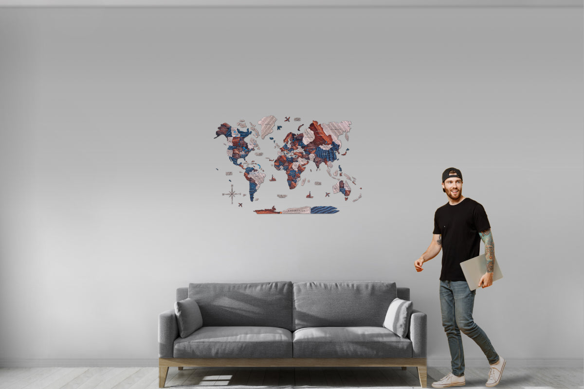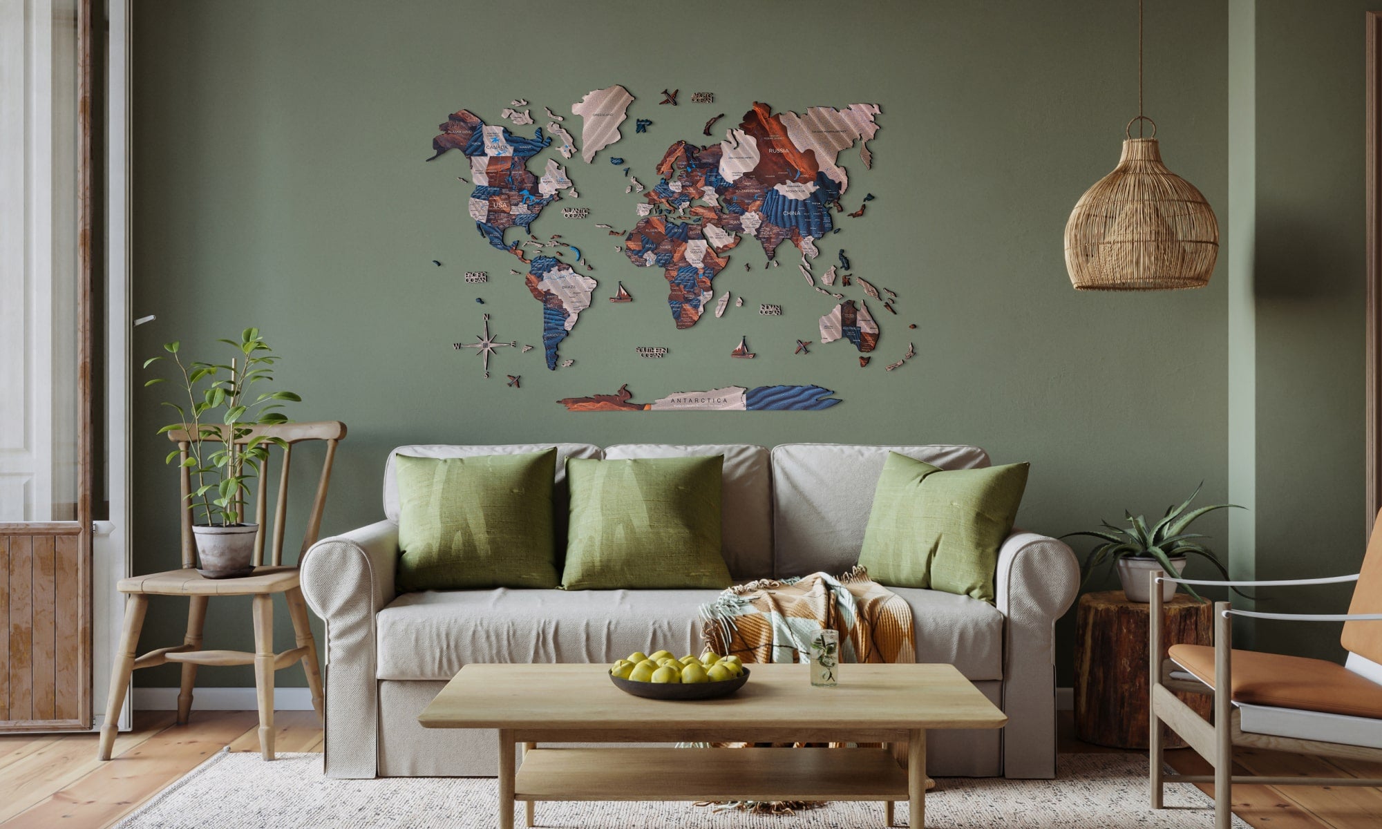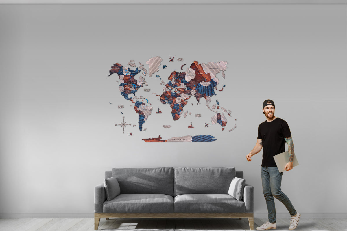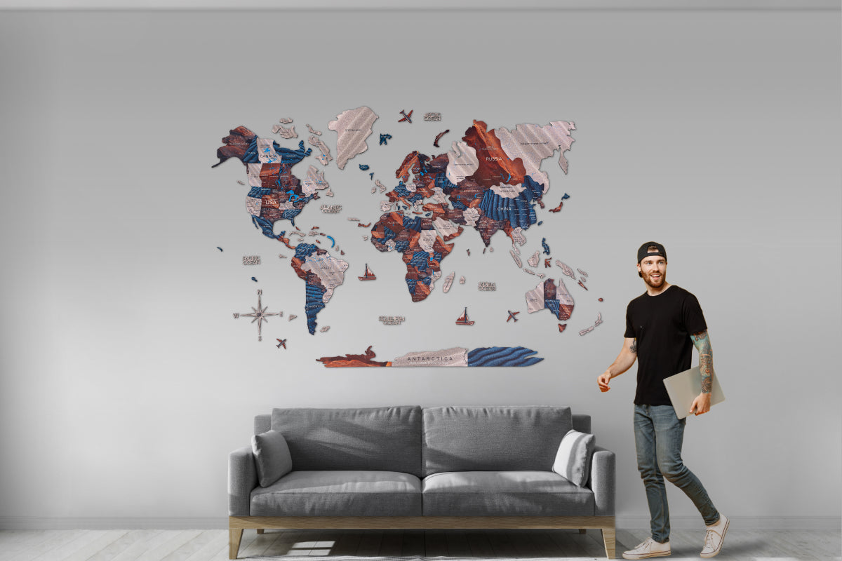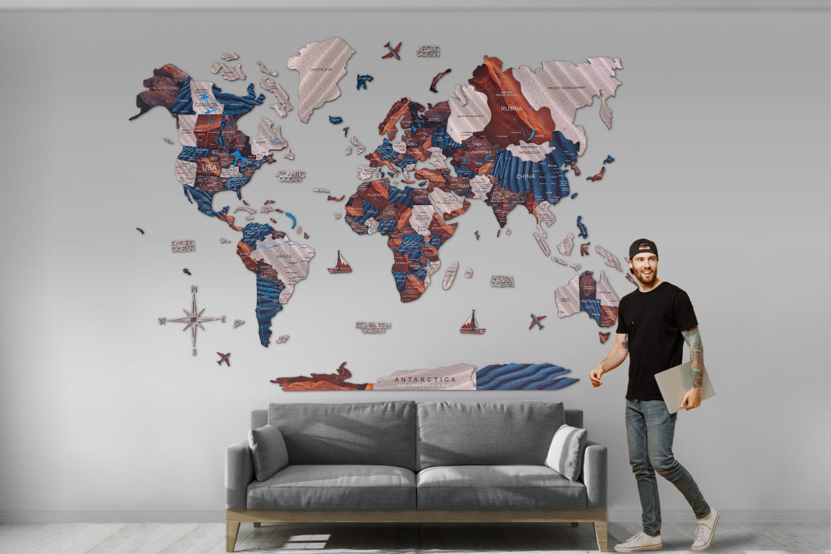 Transform your space with the serene 3D Wooden Colored World Map Dune. This warm, sandy palette evokes images of tranquil dunes and sun-drenched landscapes, ideal for cultivating a cozy atmosphere in your living room or study. Let your walls narrate the tale of your wanderlust as you embark on a global exploration from the comfort of your home with this distinctive map design.