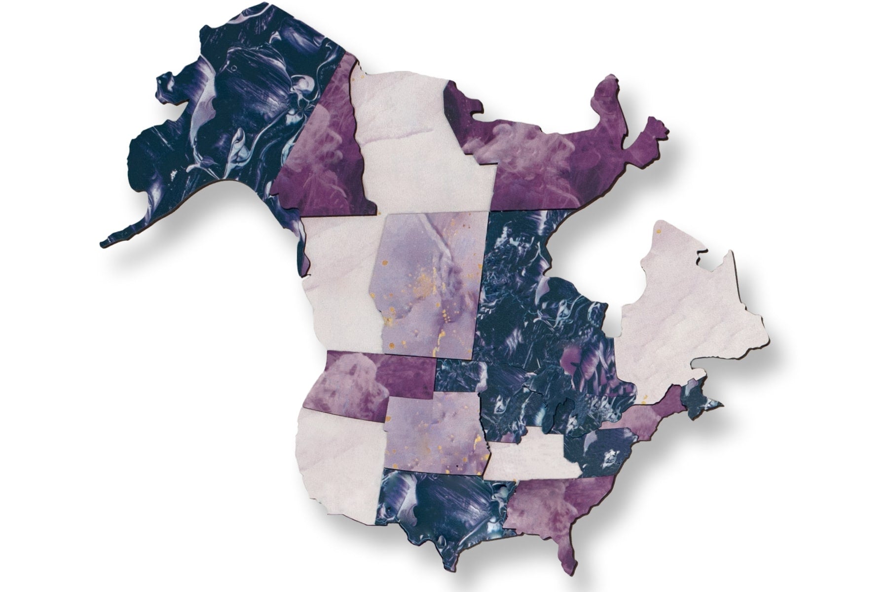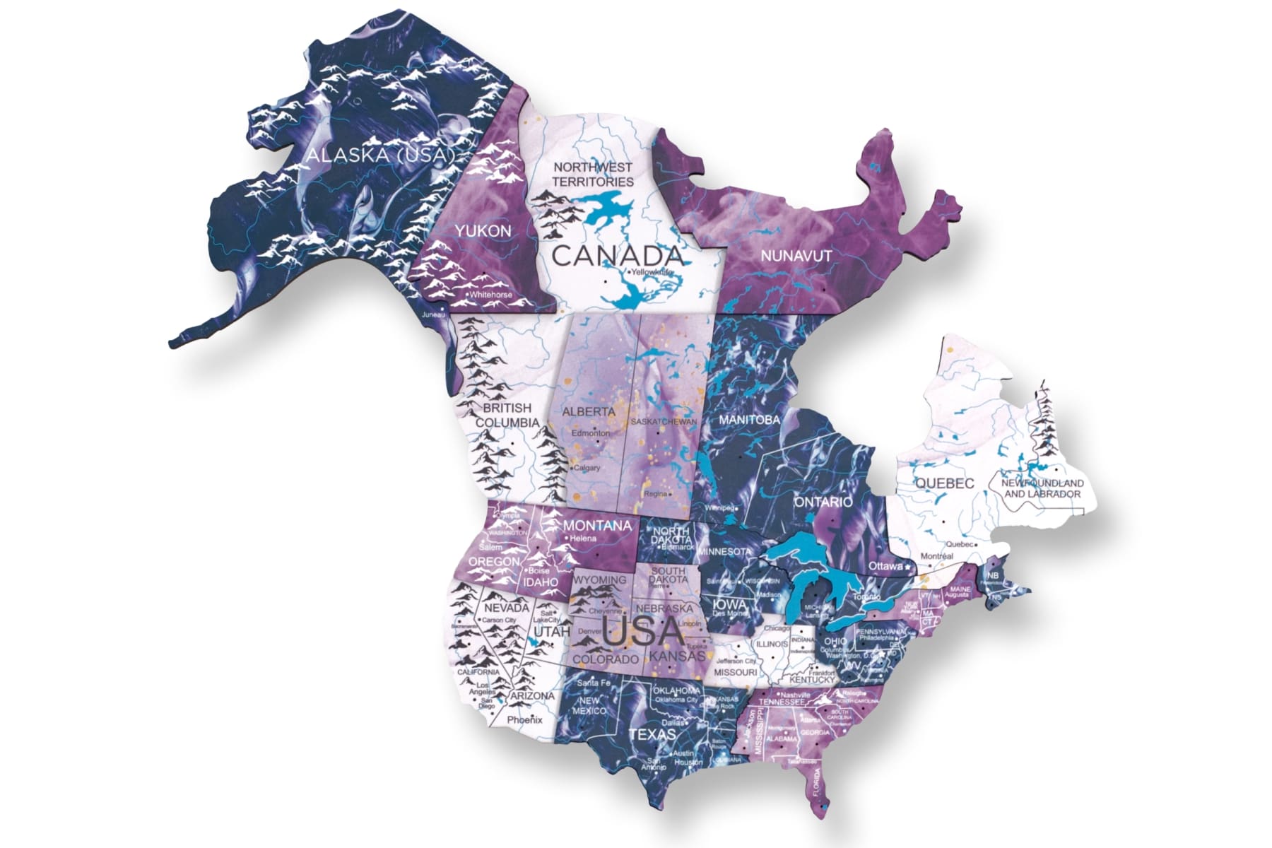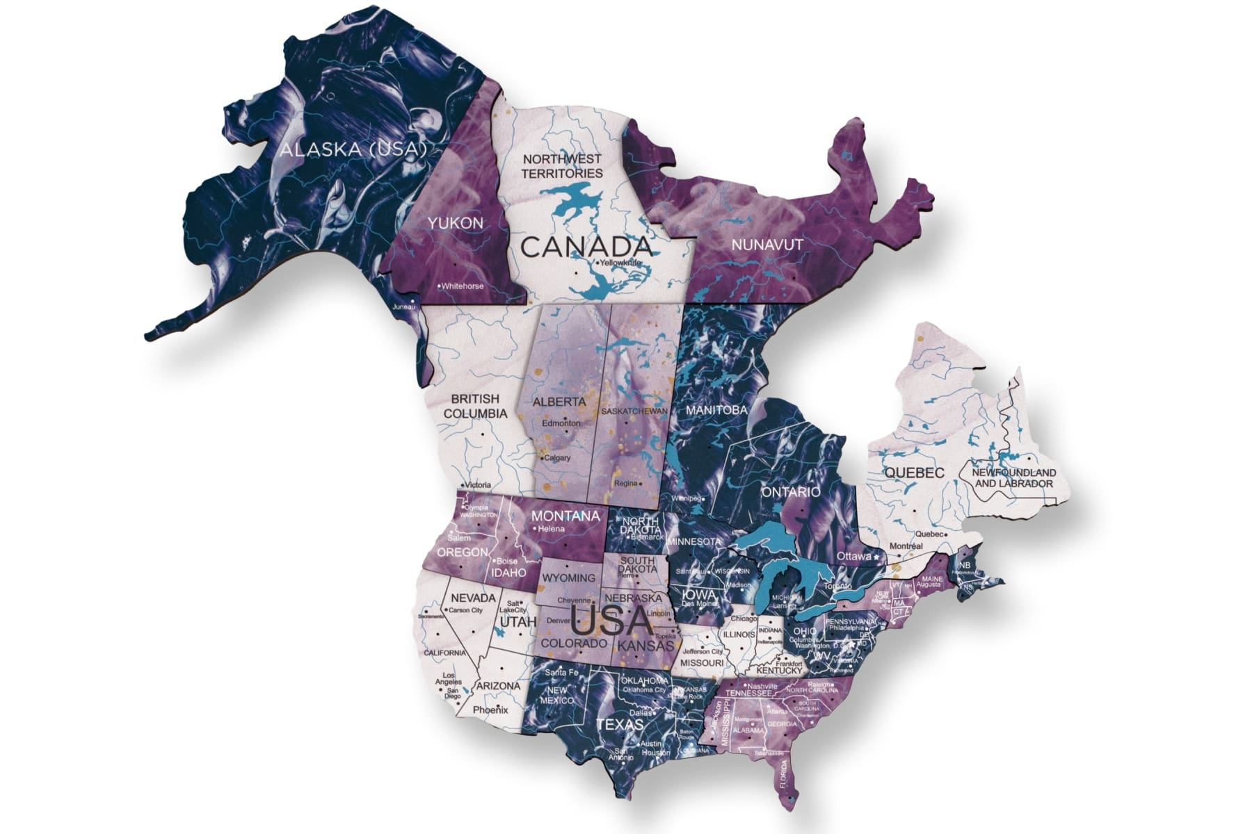 The map of the world painted on wood shows various elements, ranging from country names to capital cities, urban areas, rivers, lakes, and mountain ranges. However, due to design preferences, certain smaller islands and countries have not been included, making them unsuitable for educational purposes. To unify your purple world map, be sure to add these wooden flag sticky pins to your cart.