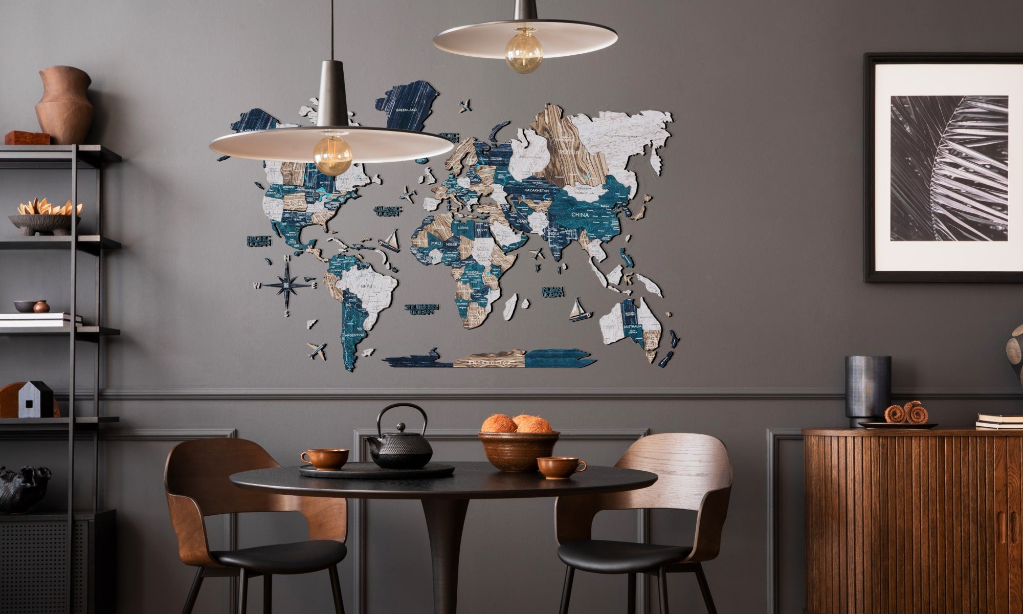 Just look at this perfect combination of grey, blue, dark turquoise, brown, white, and…Oh, the variety of colors on the map from the Mystery collection is truly impressive! At the same time, we did our best to make sure the color palette of the world map painted on wood is eye-friendly and fits into any space.