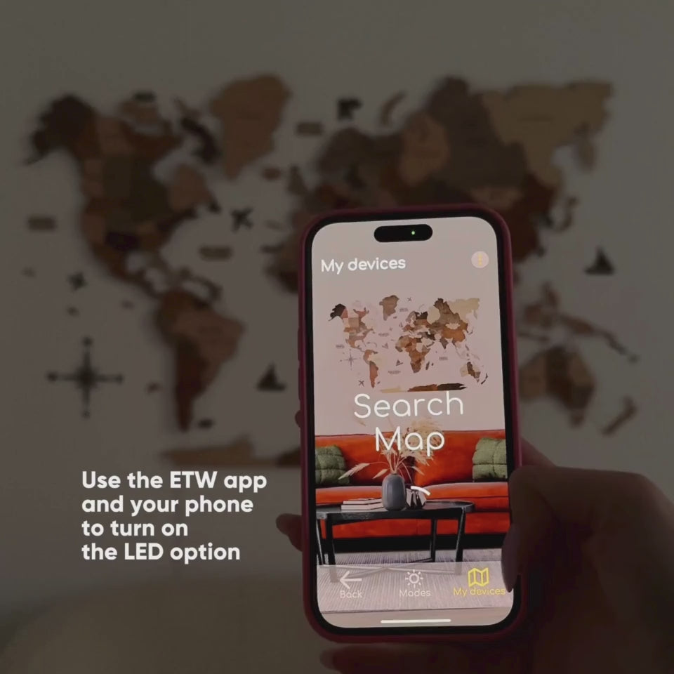 Illuminate your space with LED BACKLIGHT, controlled from your phone and the ETW app via a password-protected connection. Enjoy the RGB LED (Neon colors) option with 7 main modes, and don’t forget to check out the funky twinkle options. The lights are placed behind the continents. Change the color of continents in real time to match your vibe.