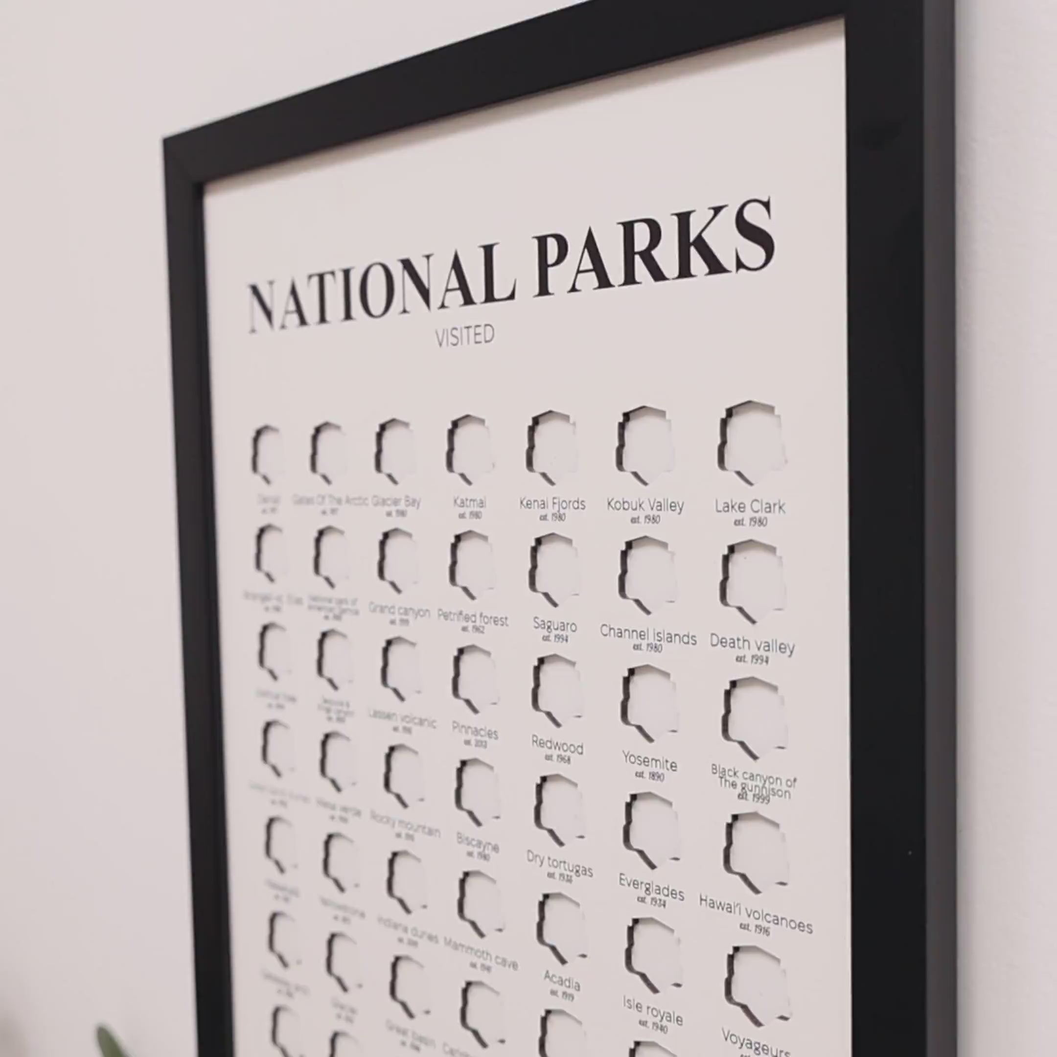 This National Parks USA Travel Tracker Poster is crafted from durable birch plywood and designed with a sleek black frame. Perfect for travel enthusiasts, it offers a stylish and lasting way to track your visits across America’s most iconic landscapes.