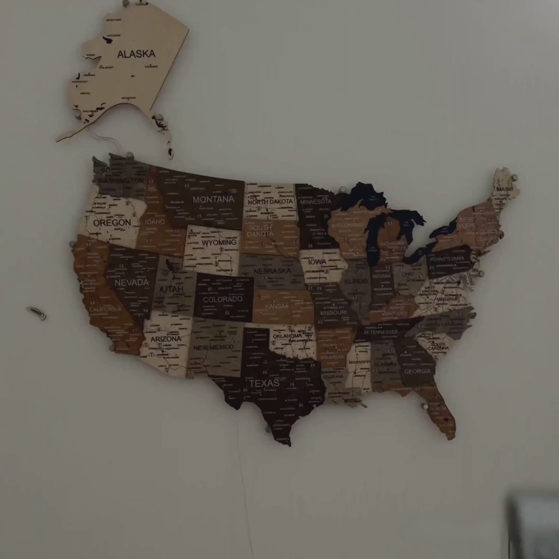 Remote wall mounting with hidden wire routing behind the map (entry point behind Texas).
