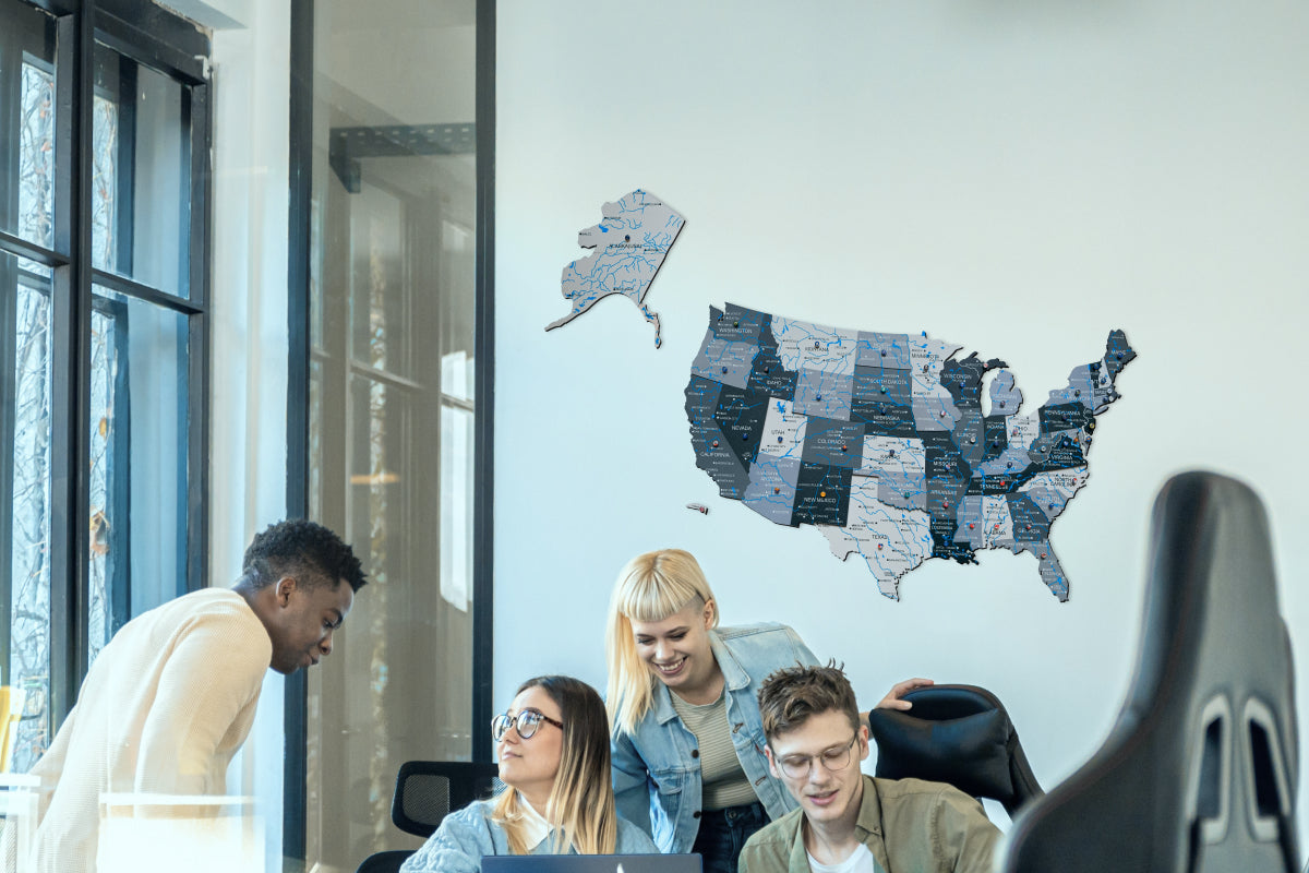 Remote wall mounting with hidden wire routing behind the map (entry point behind Texas).