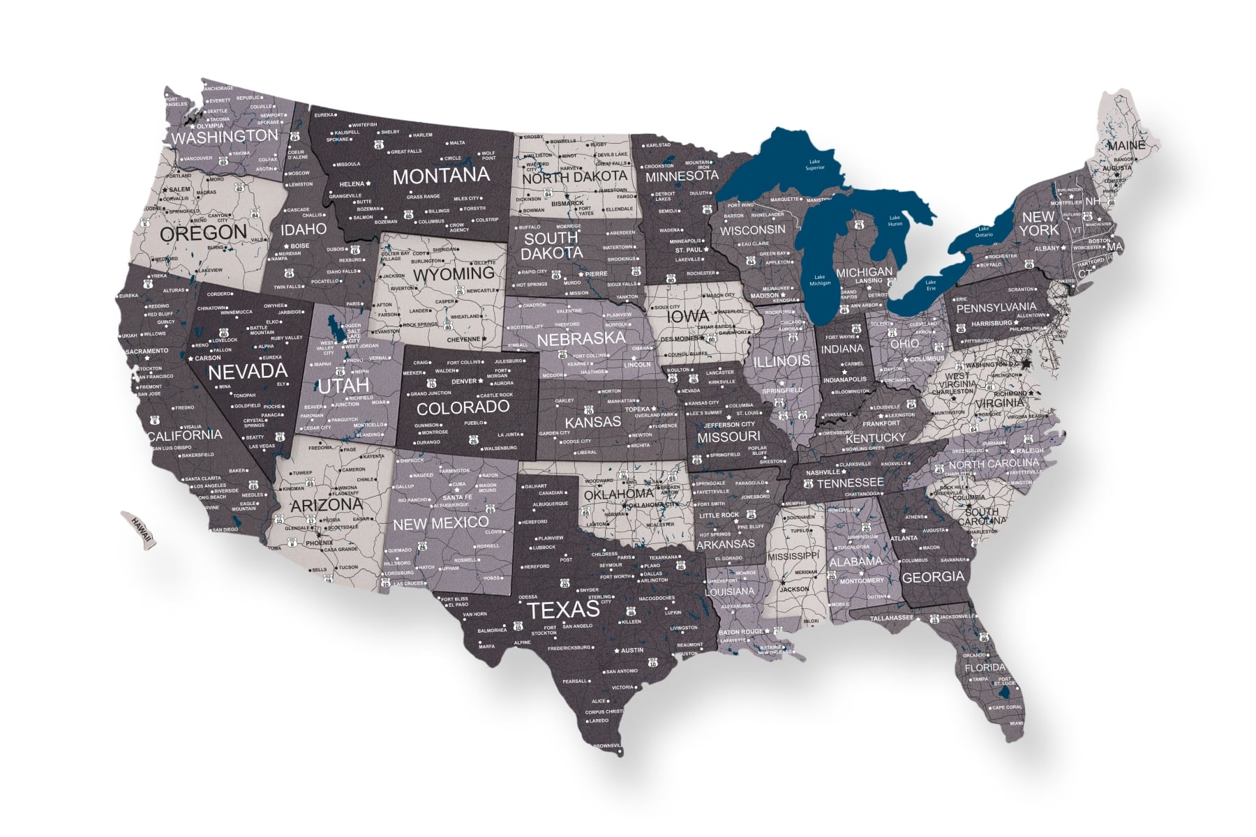 ➤available in 3 styles: Blank (completely empty map), Prime (States & Capitals & Largest Cities, major cities, and lakes), Prime Plus (same as Prime, but also includes roads and highways)