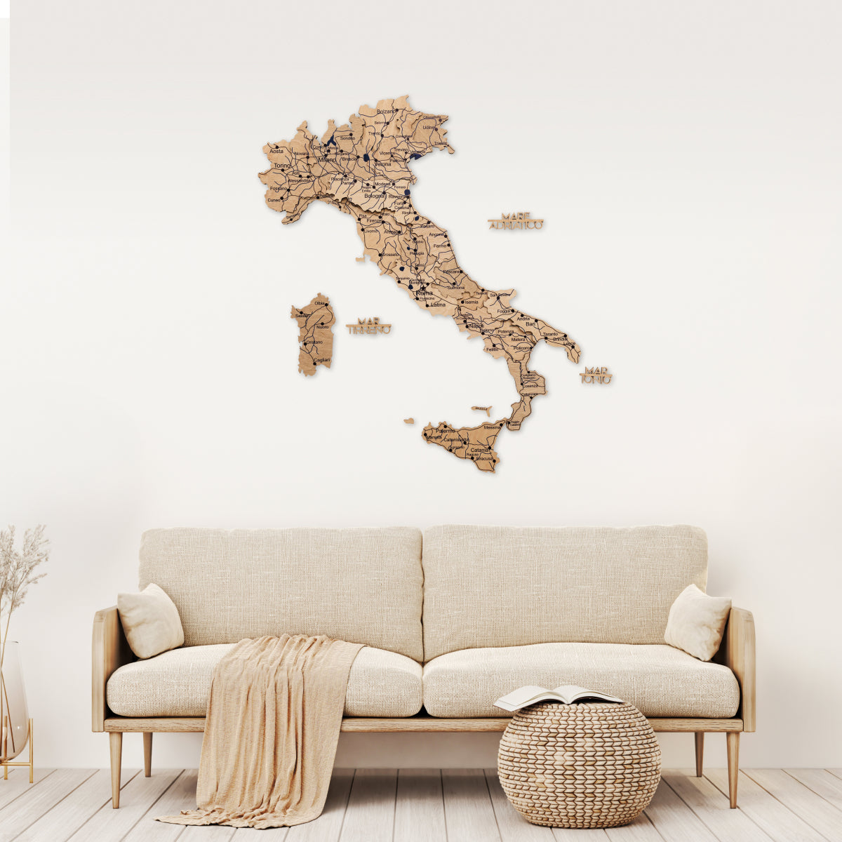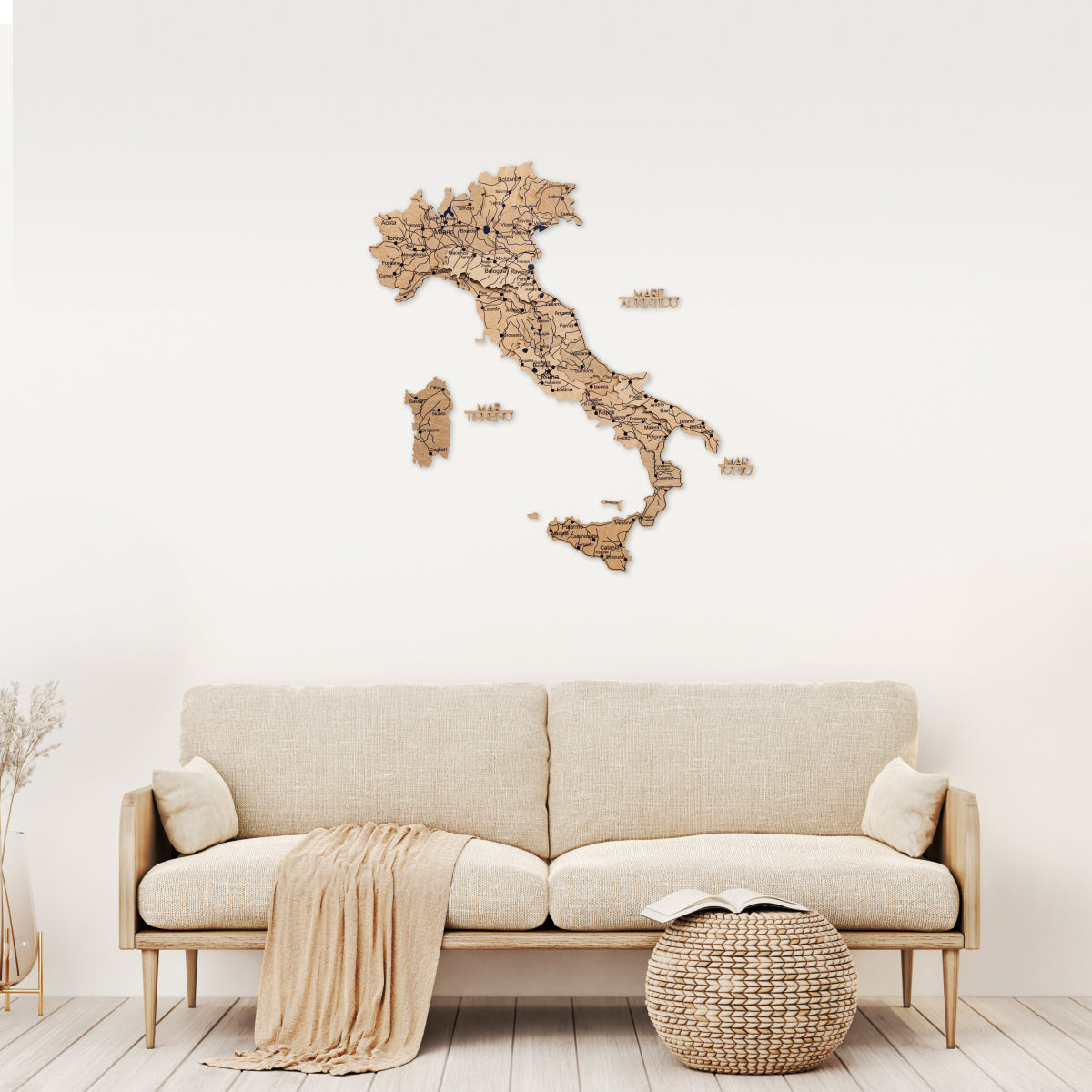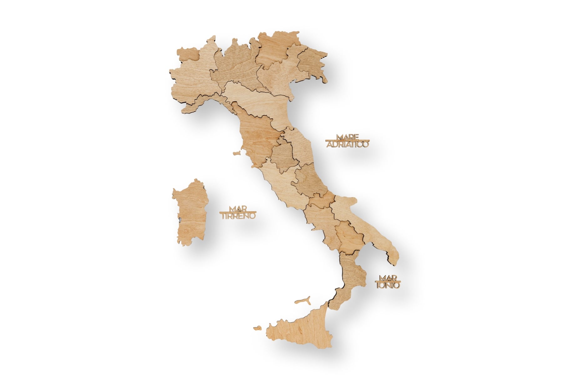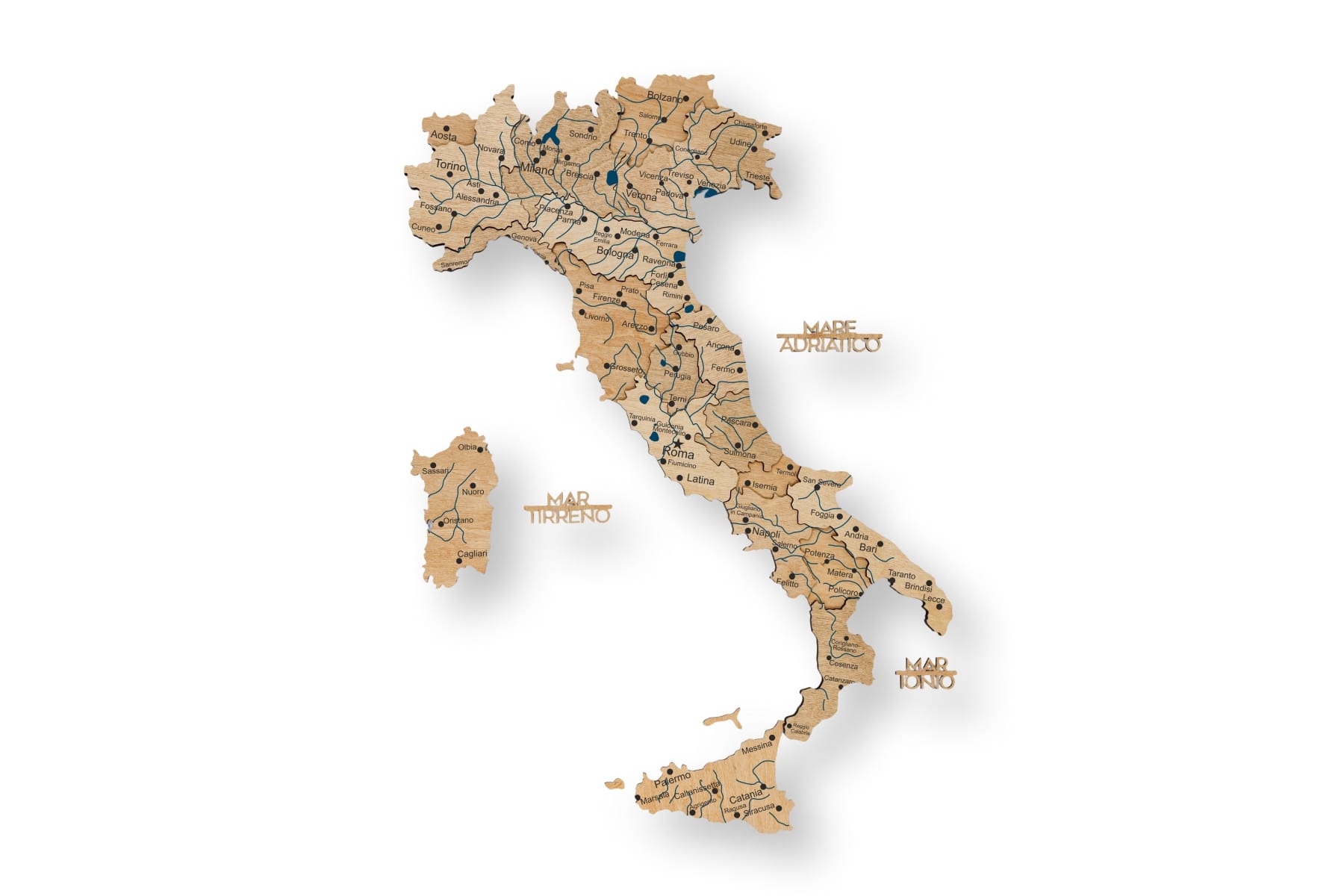 Made from natural birch plywood with a thickness of 6–18 mm, the map showcases beautiful wood grain and a tactile relief. The multicolor finish brings Italy’s regions to life—from the Alps to Sicily—adding warmth and energy to modern interiors and travel-inspired decor.
