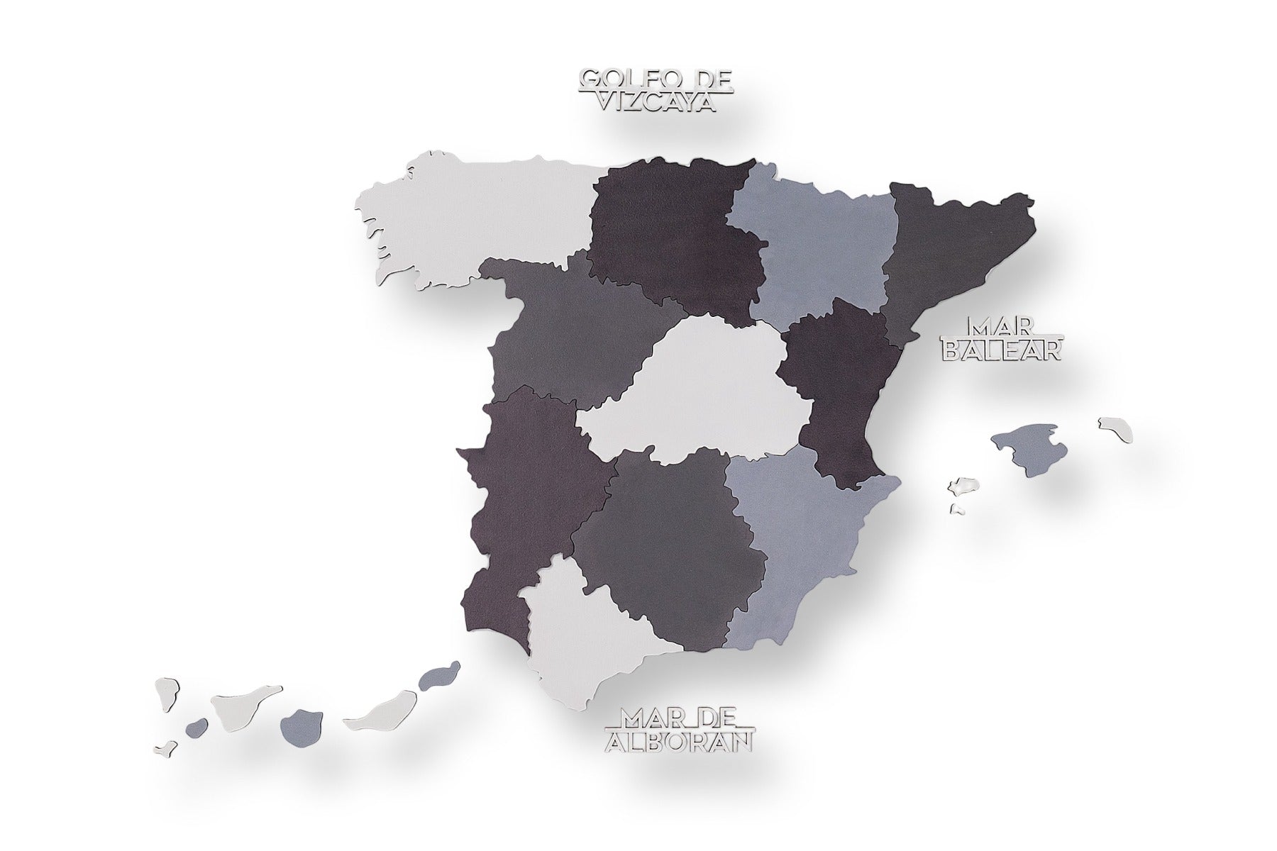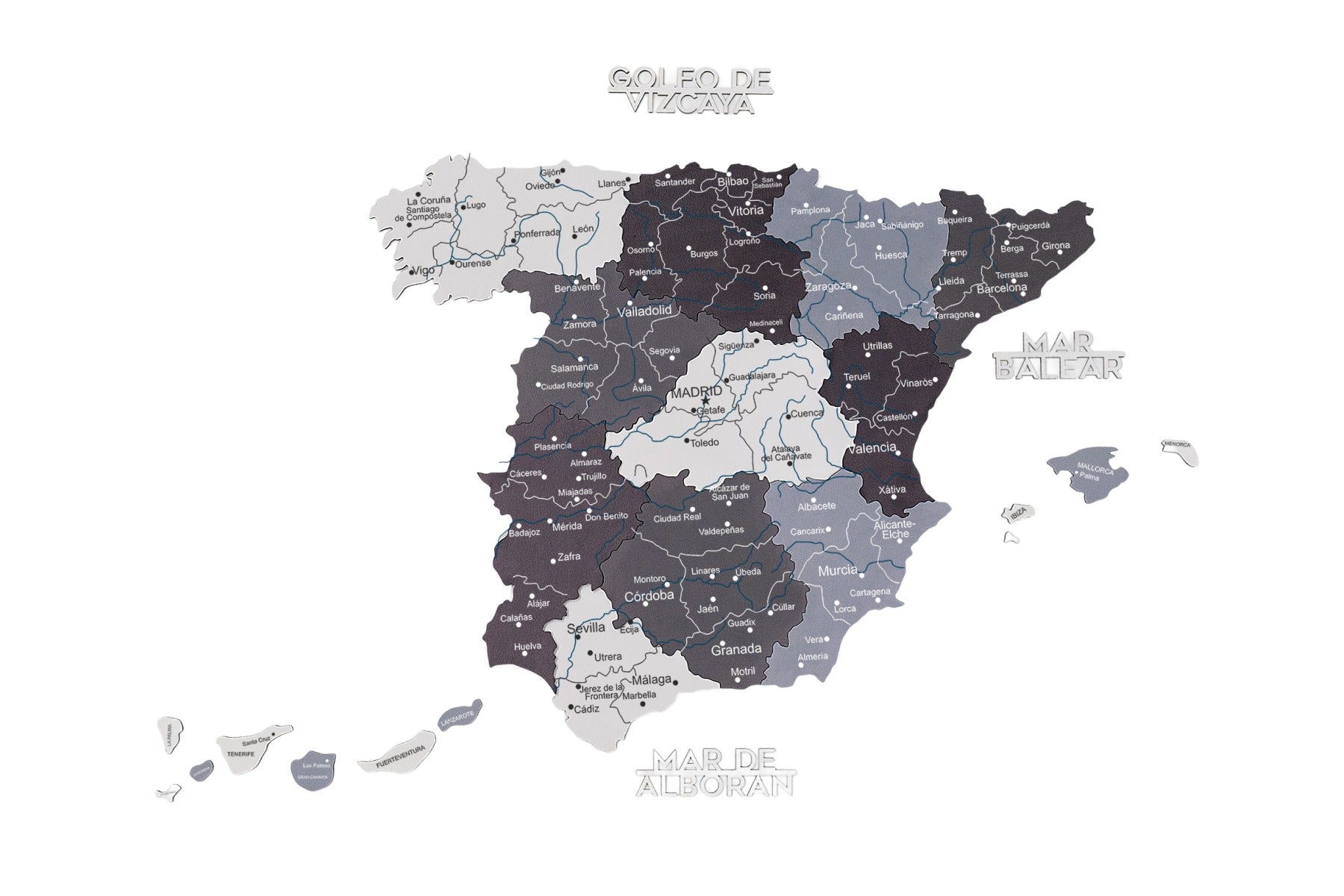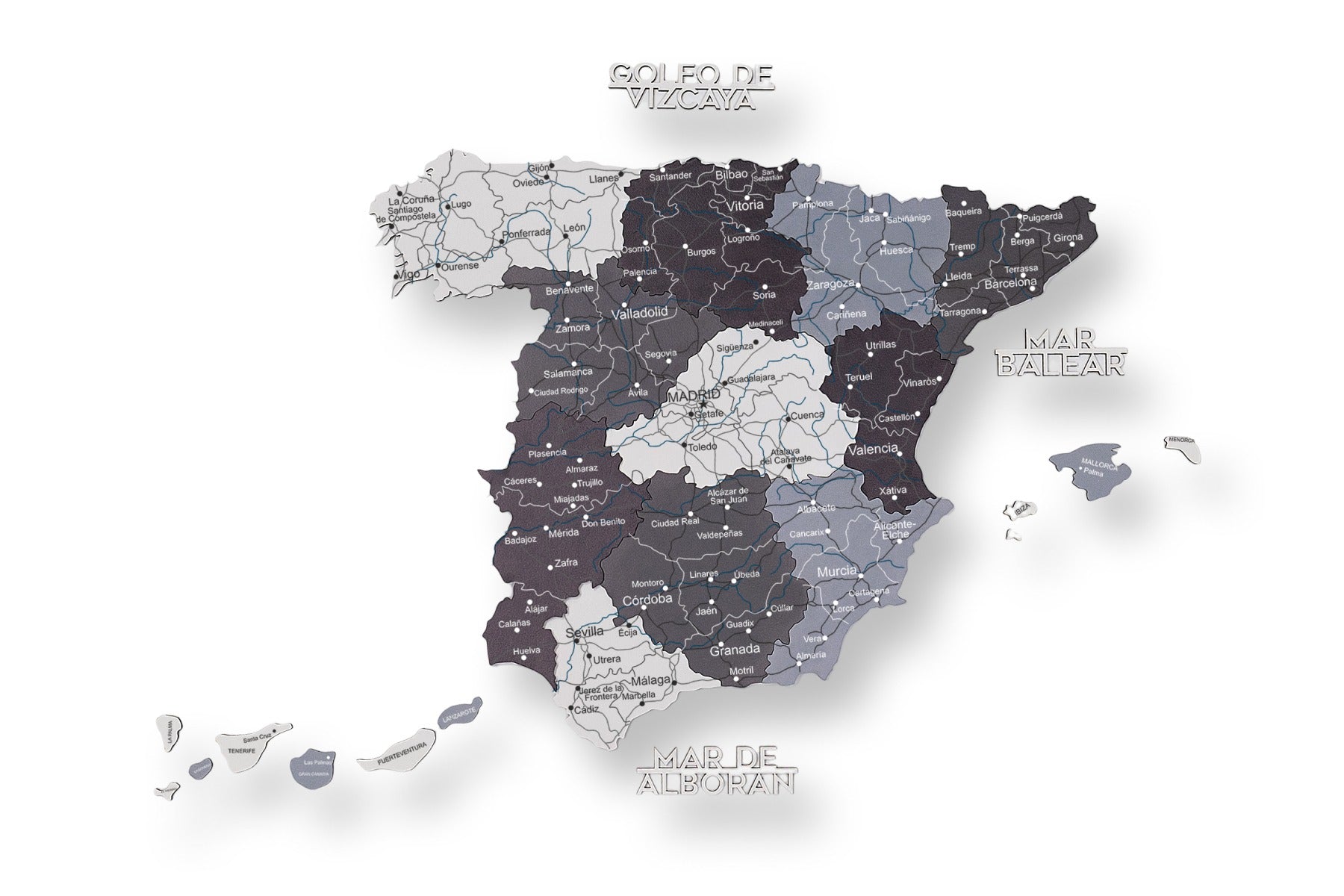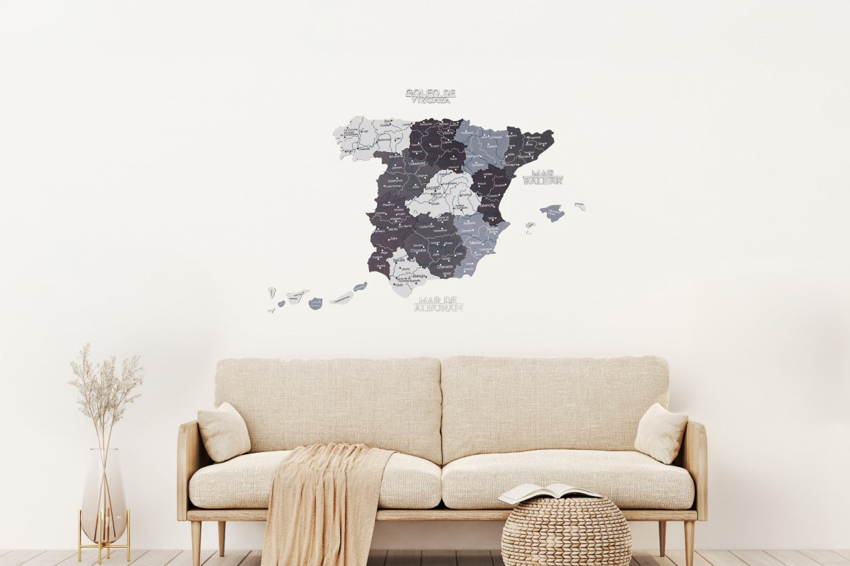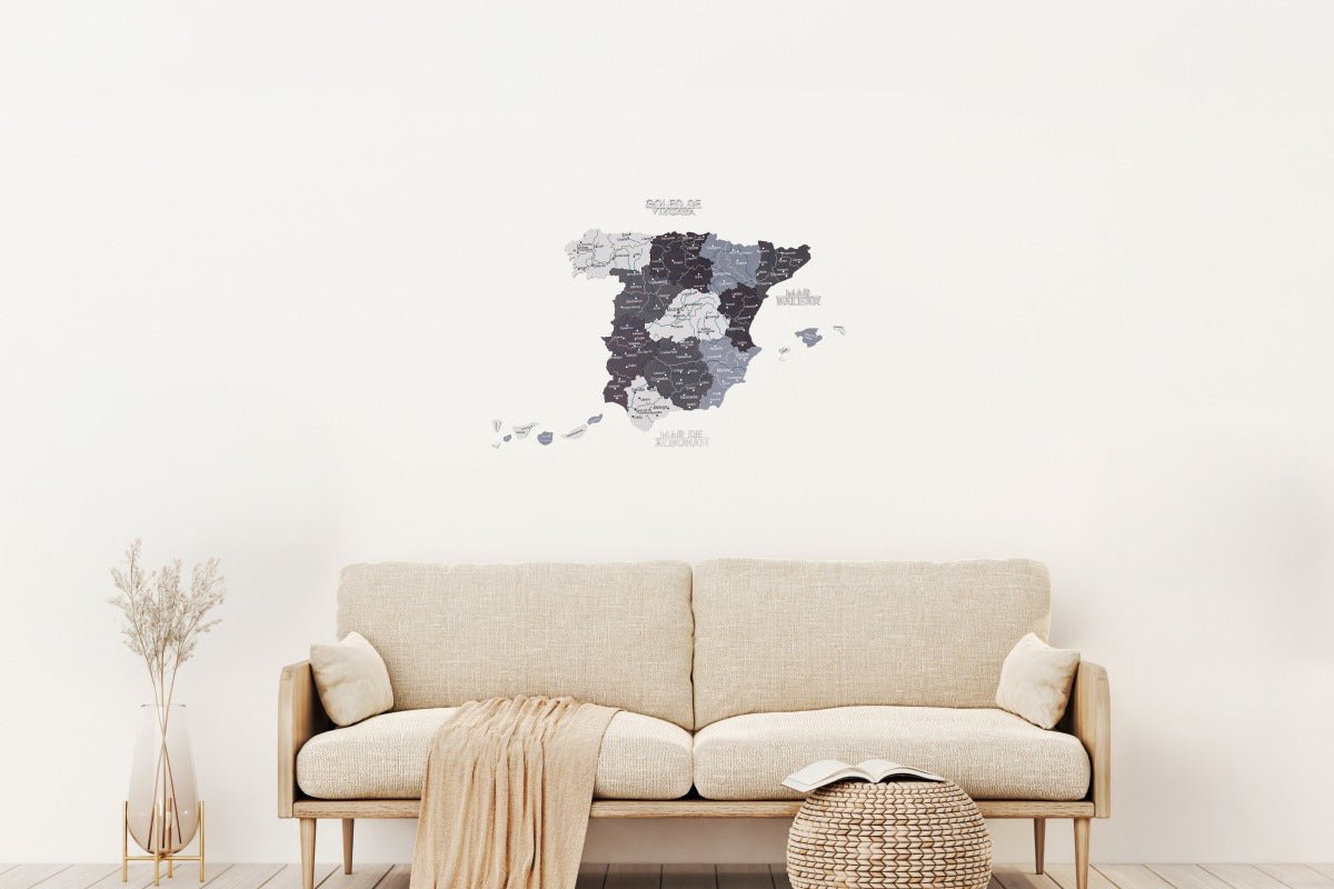Made from layers of eco-friendly wood, it showcases Spain map regions in cool-toned shades of gray and white, reflecting Scandinavian aesthetics. The precision-cut details highlight borders, cities, and islands with elegant simplicity.