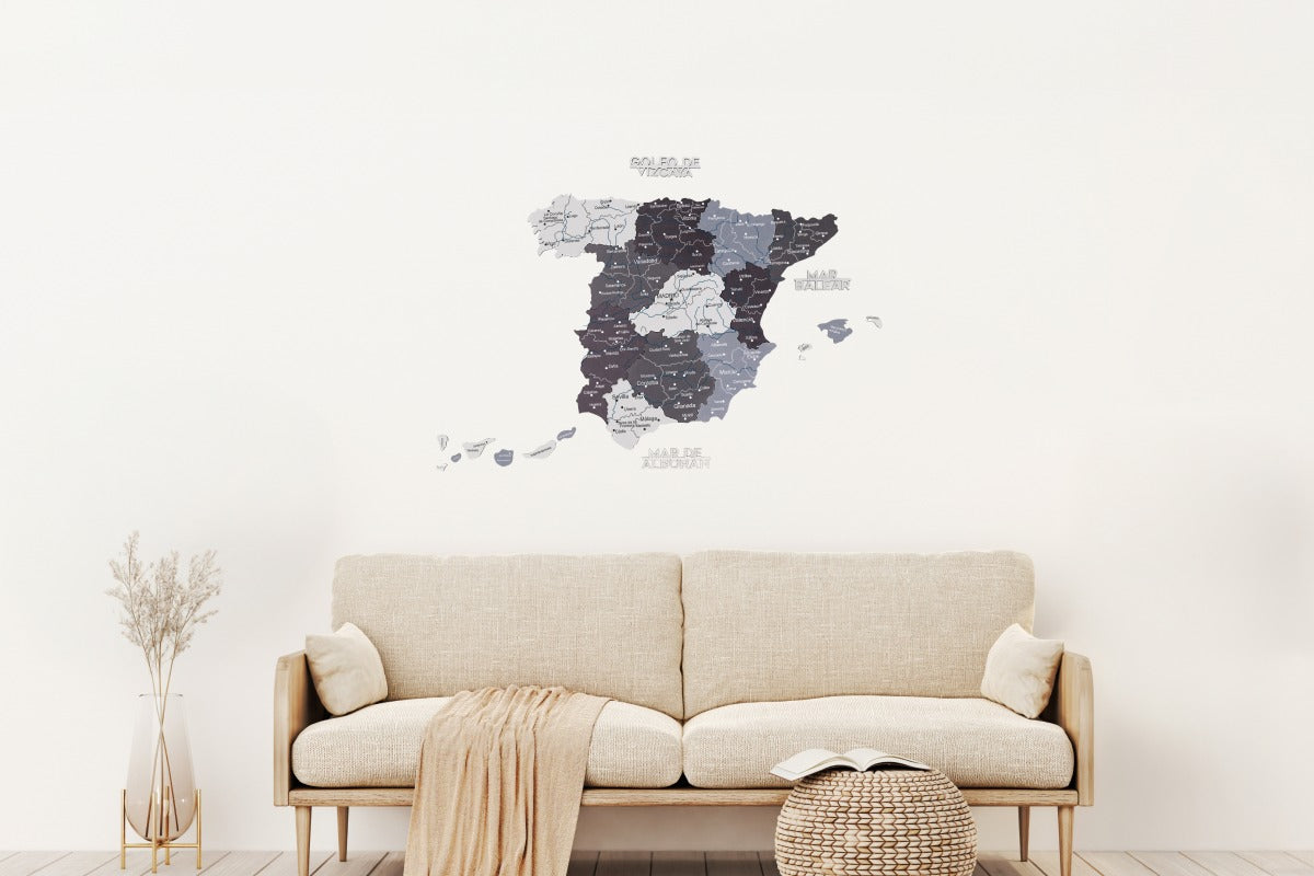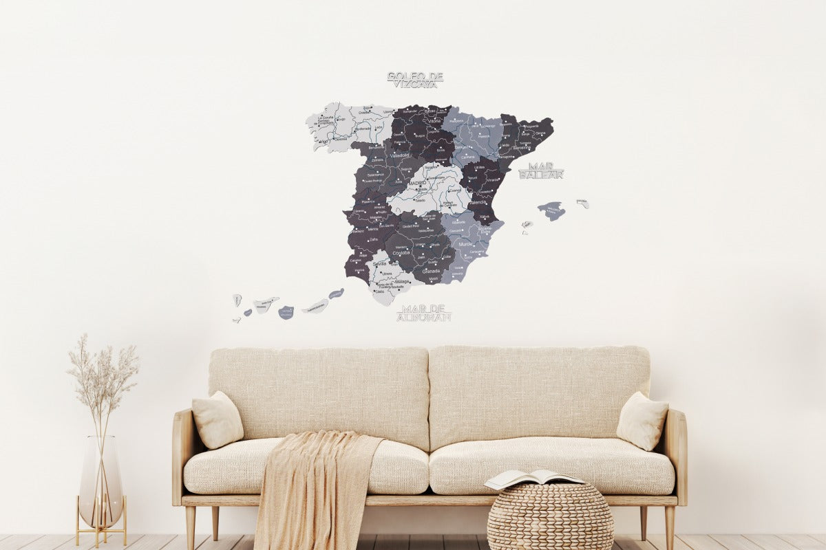 Made from layers of eco-friendly wood, it showcases Spain map regions in cool-toned shades of gray and white, reflecting Scandinavian aesthetics. The precision-cut details highlight borders, cities, and islands with elegant simplicity.