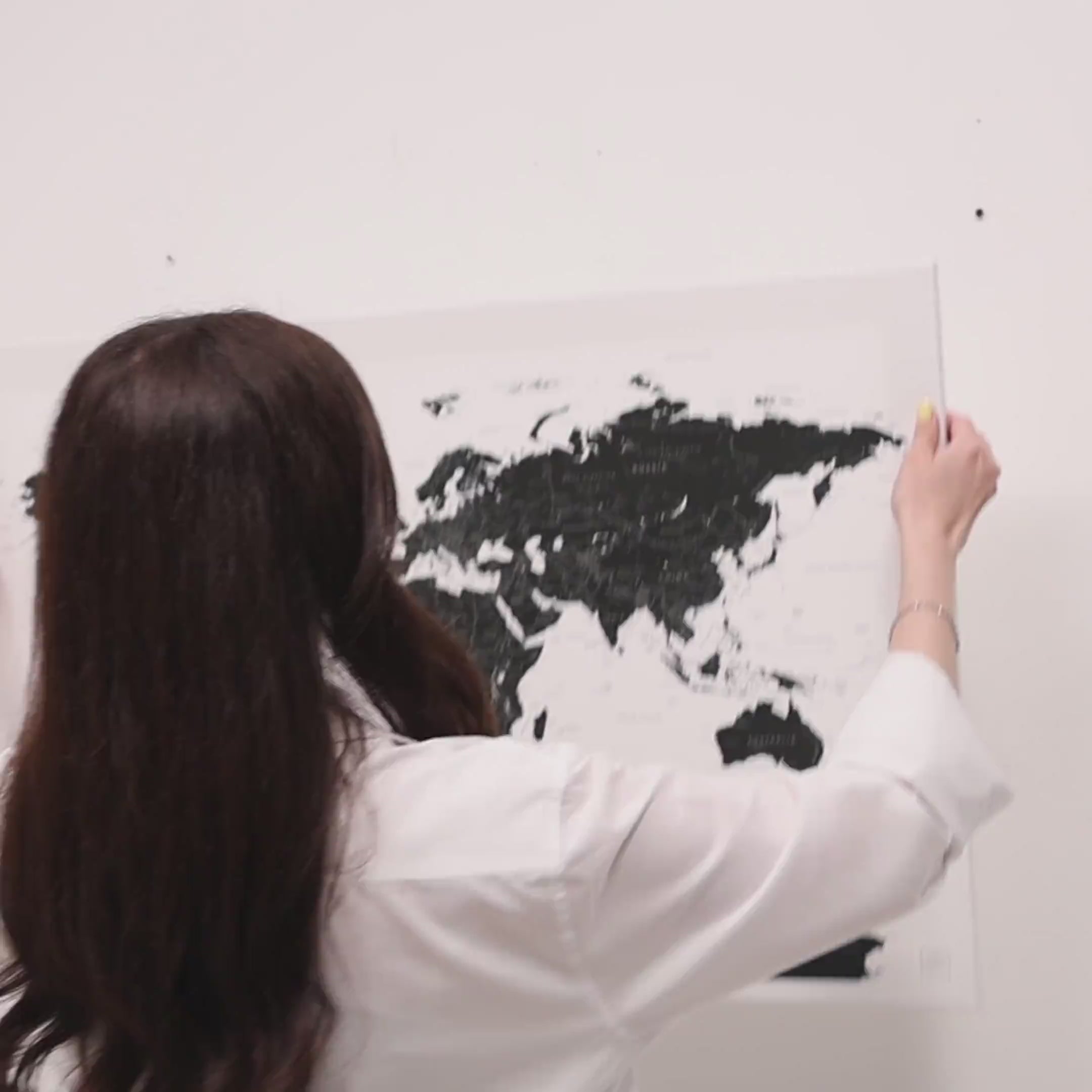 Introducing our canvas push pin travel map: crafted from durable fabric, ideal for pinning your adventures. It features a UV-protective coating and a wooden underframe and is ready to be hung. Available in 2 sizes and many designs, with clear borders and readable text for all 197 countries, making it easy to mark your travels.