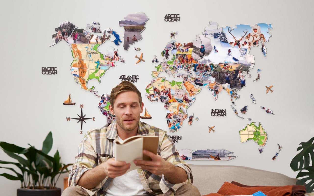 As the first creators of Wooden World Maps, Enjoy The Wood offers you original products backed by a strong patent portfolio, reaffirming our commitment to innovation and protection 🥇. Crafted from durable fiberwood, the 3D map from the Photo Maps collection is time-resistant. It’s eco-friendly and contains no toxic finishes. The map attaches to the wall with special double-sided sticky tape, which comes in the package. The assembling process is quite fast. The item comes with an instruction to help you. At the same time, some small islands and cities can be omitted.